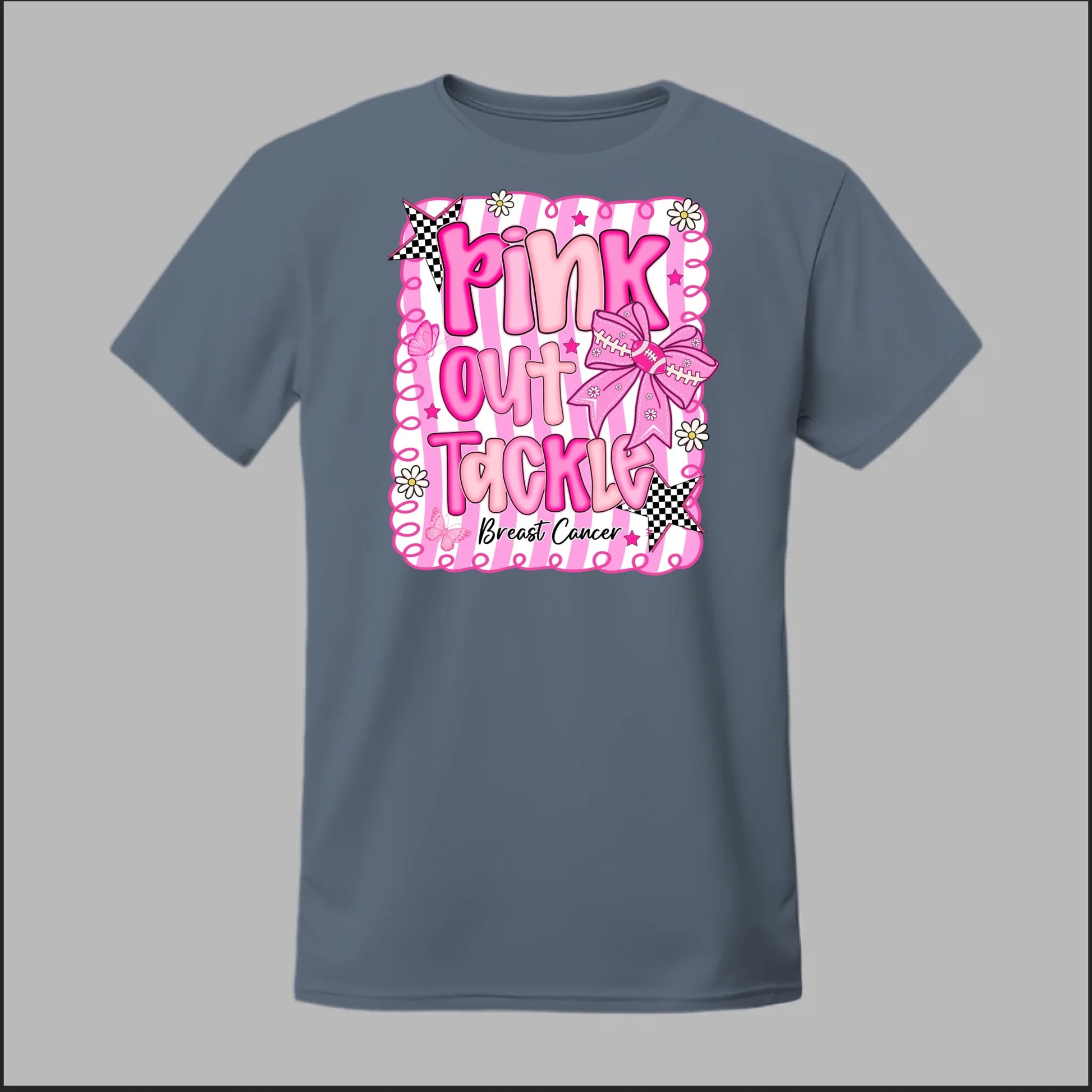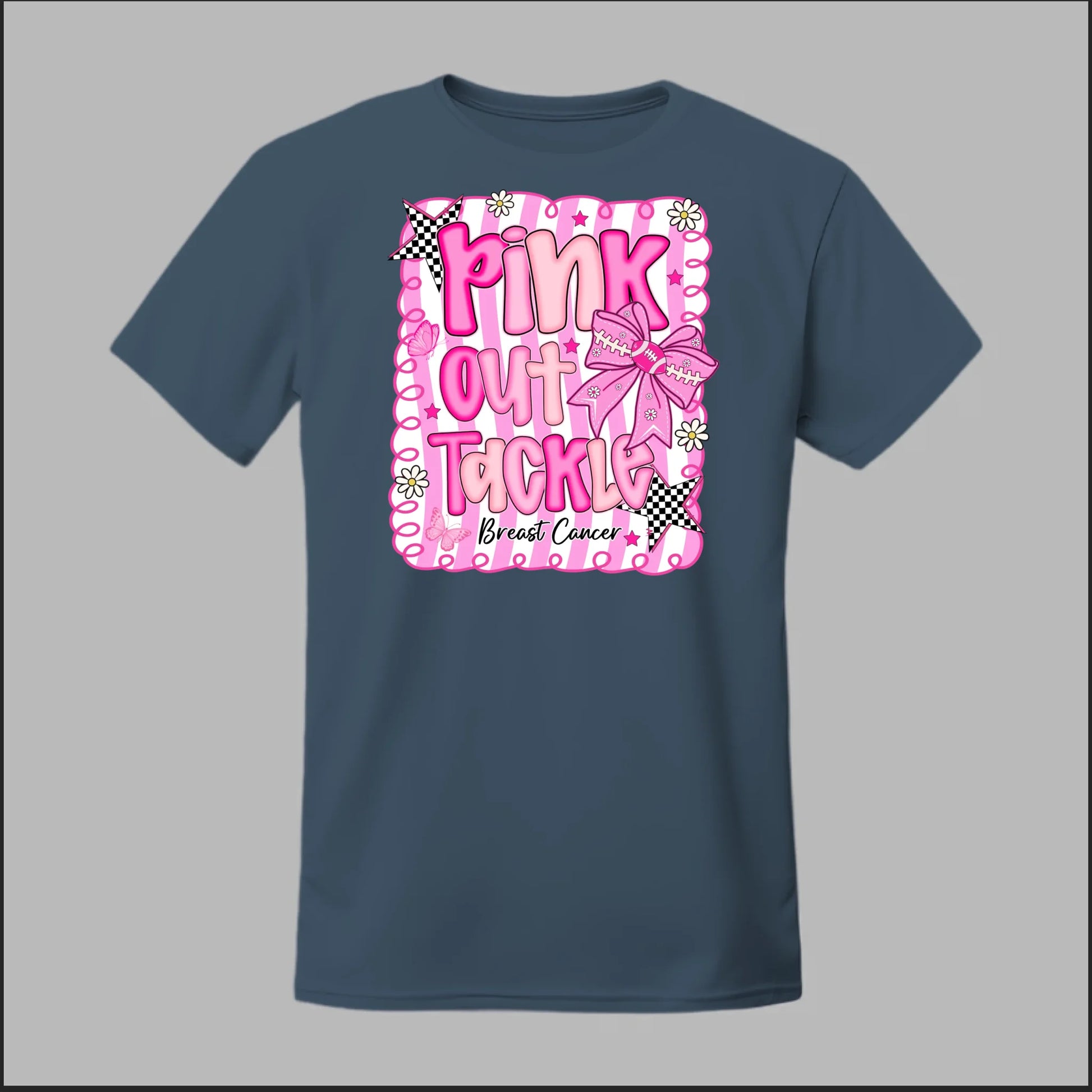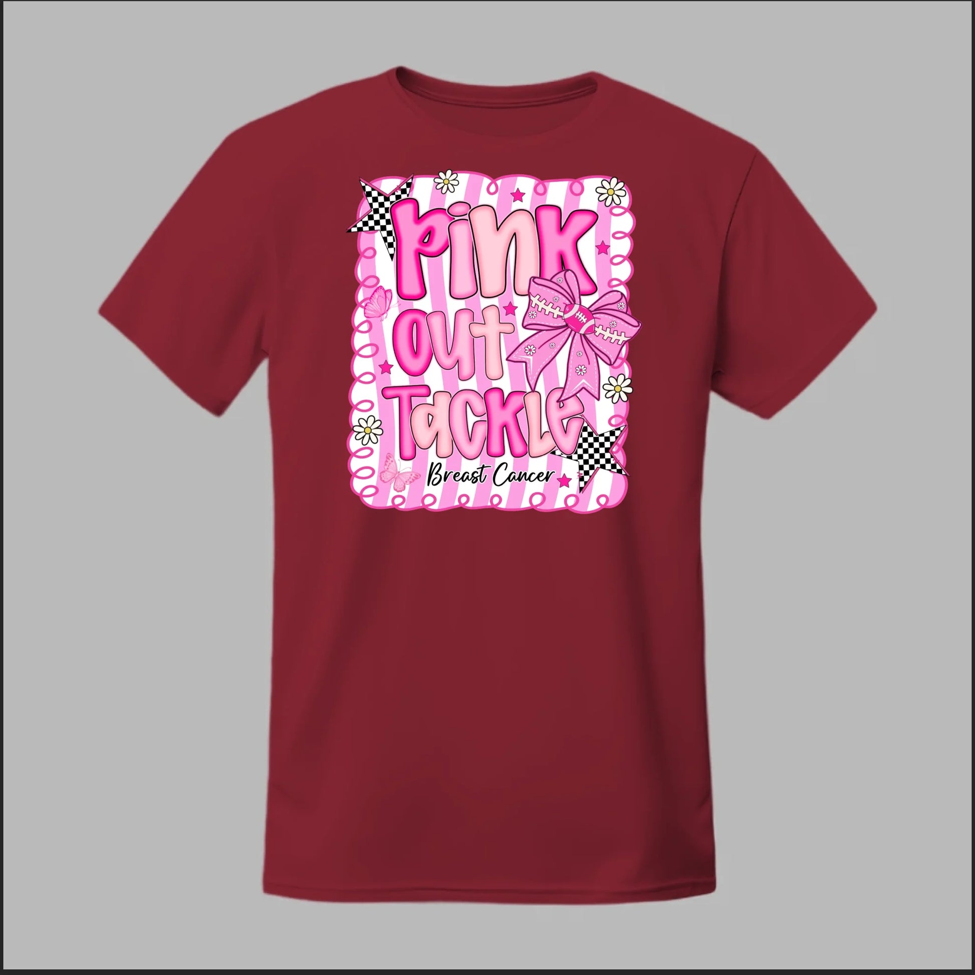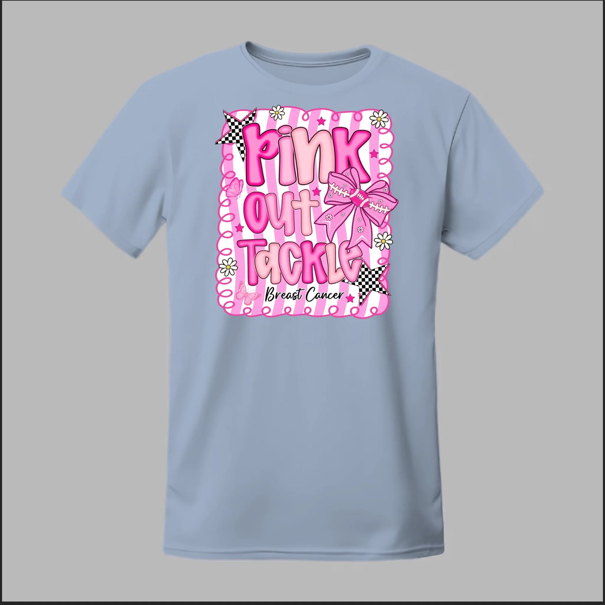 Bring bold energy to the fight with the Pink Out Tackle Breast Cancer tee. Featuring vibrant lettering, playful stars and butterflies, and a football bow centerpiece, this shirt is perfect for showing support and strength during Breast Cancer Awareness events.