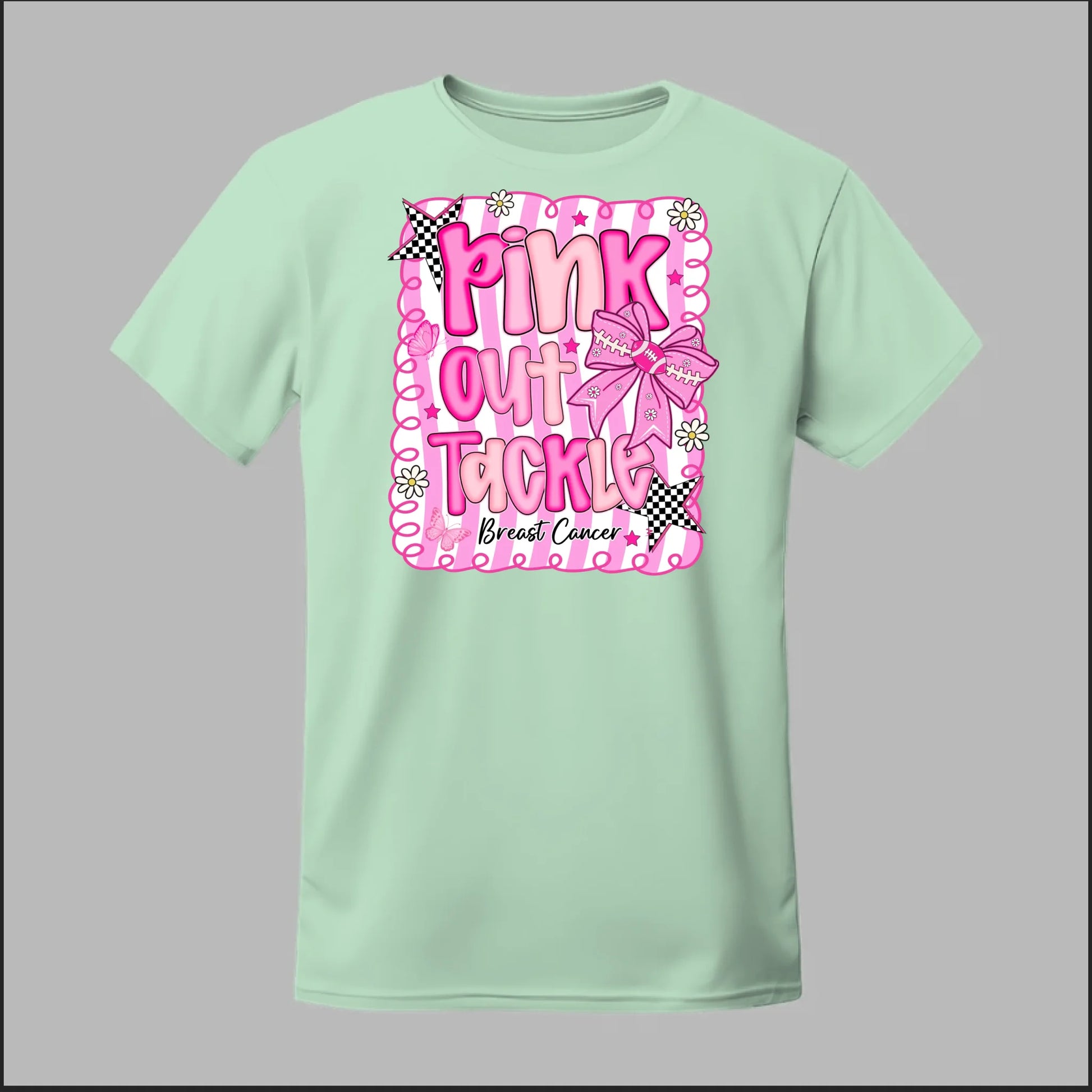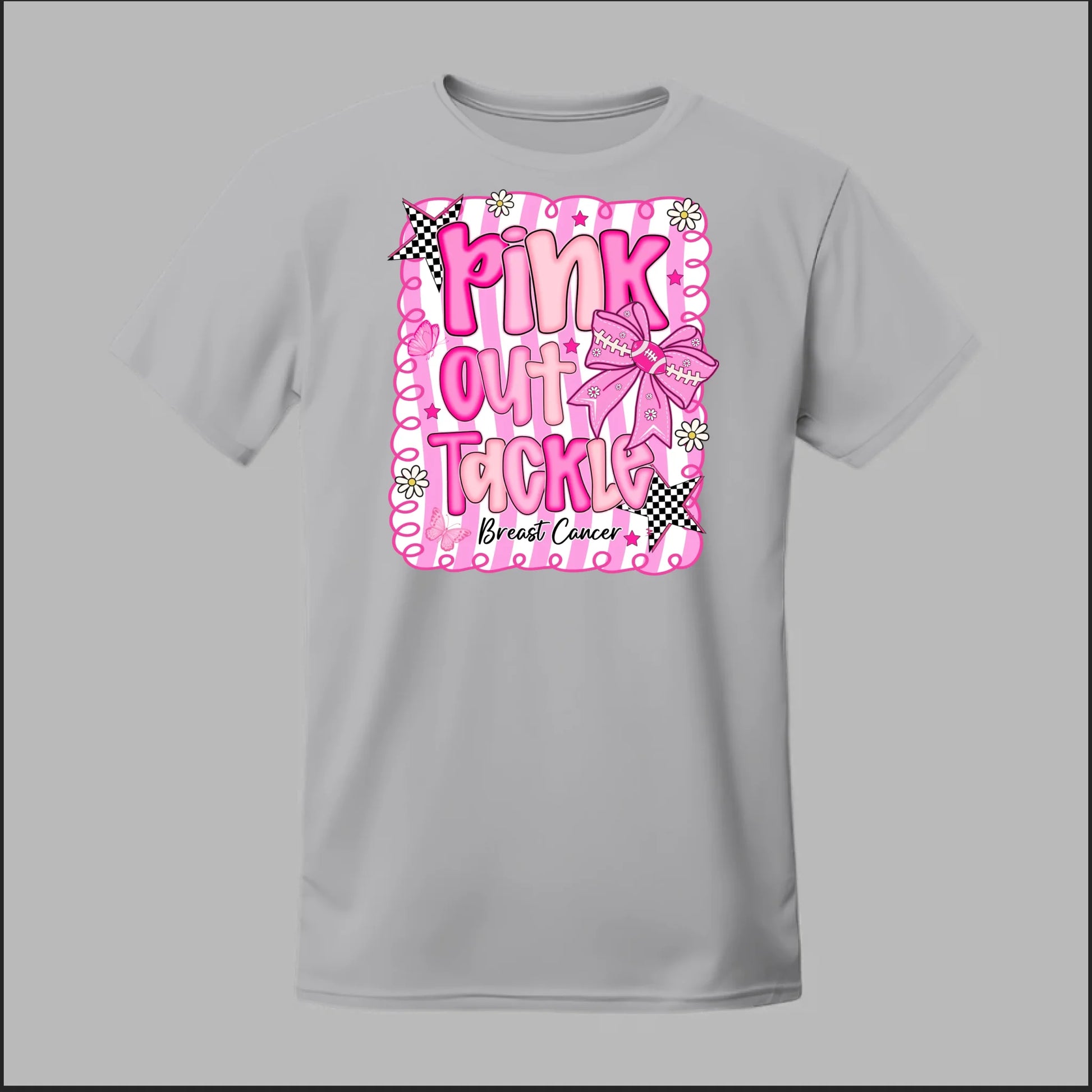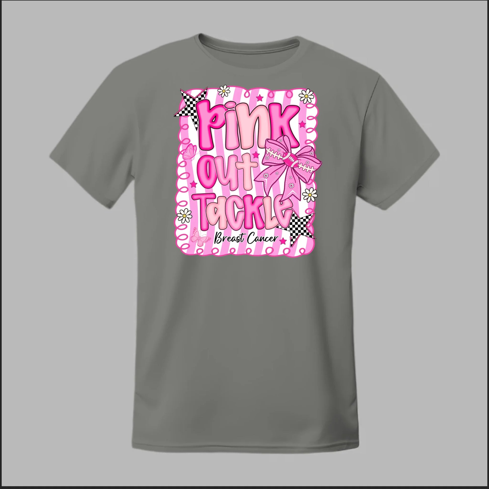 Bring bold energy to the fight with the Pink Out Tackle Breast Cancer tee. Featuring vibrant lettering, playful stars and butterflies, and a football bow centerpiece, this shirt is perfect for showing support and strength during Breast Cancer Awareness events.