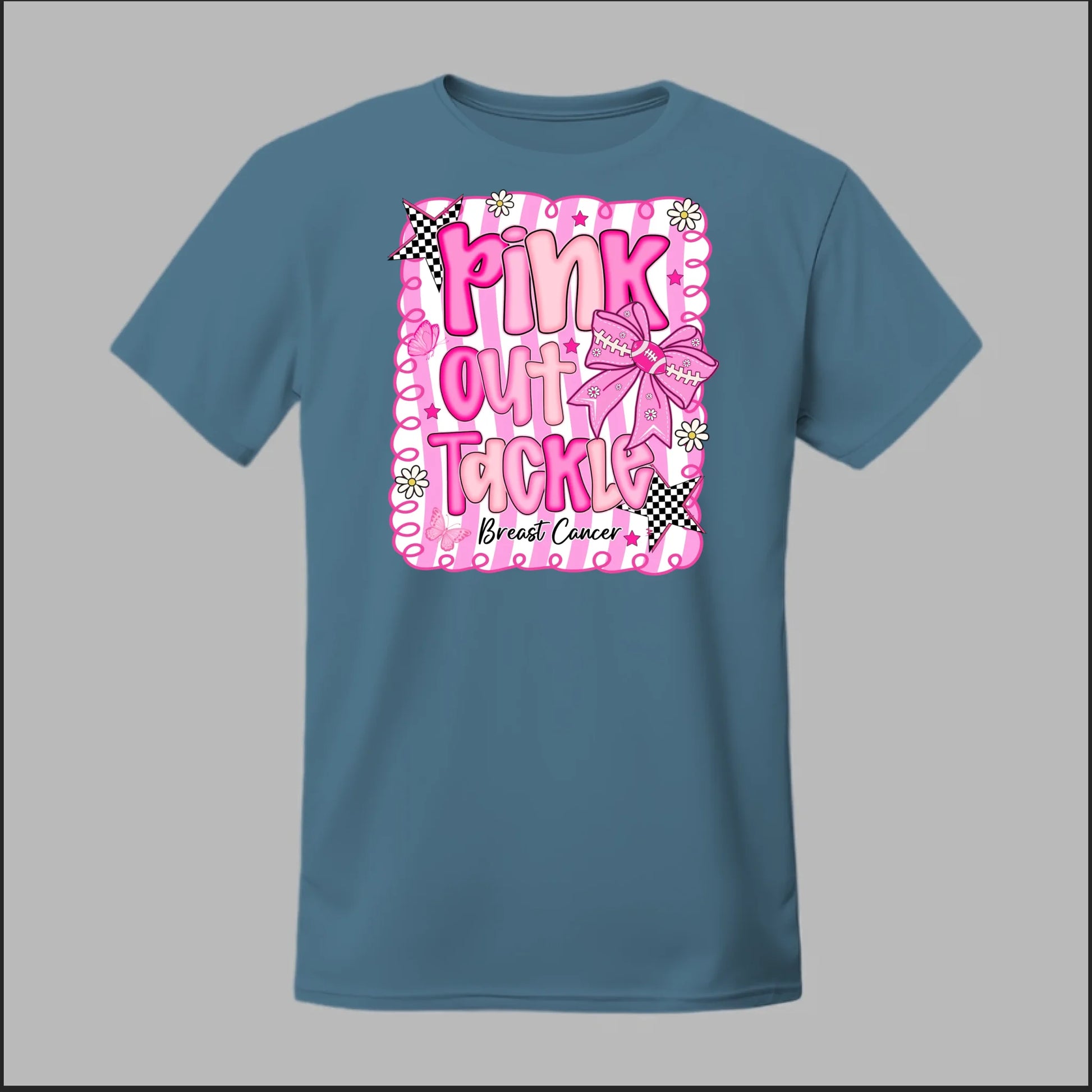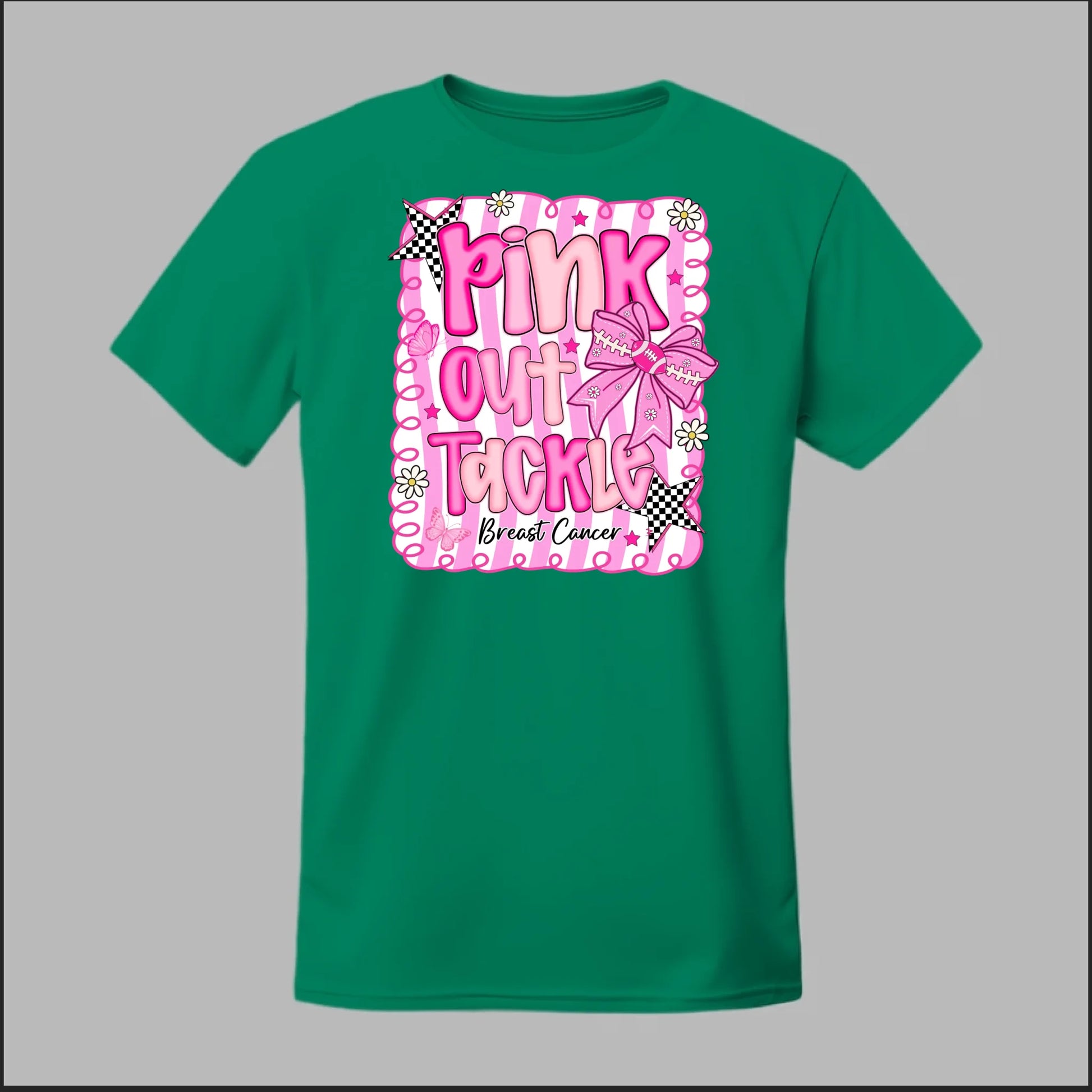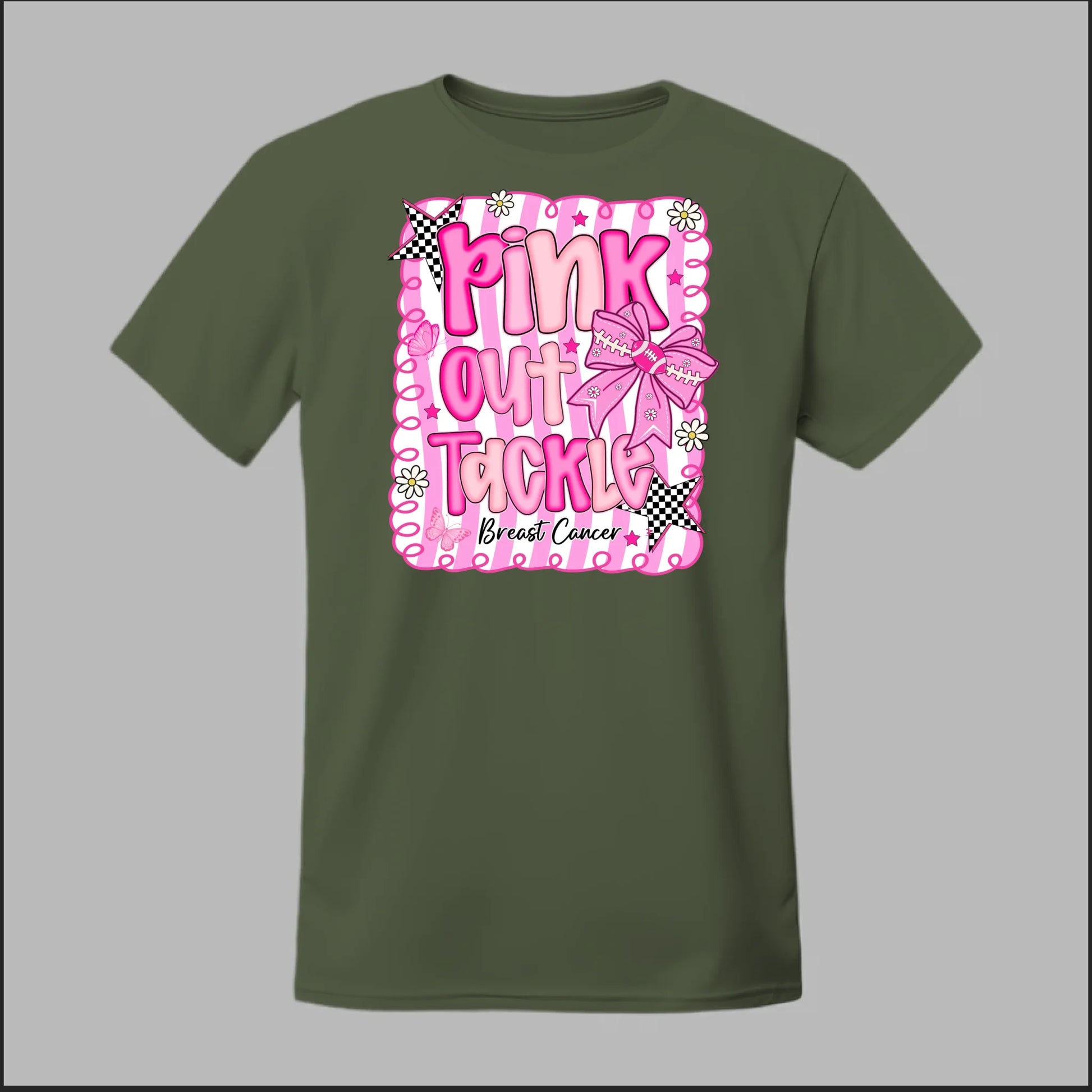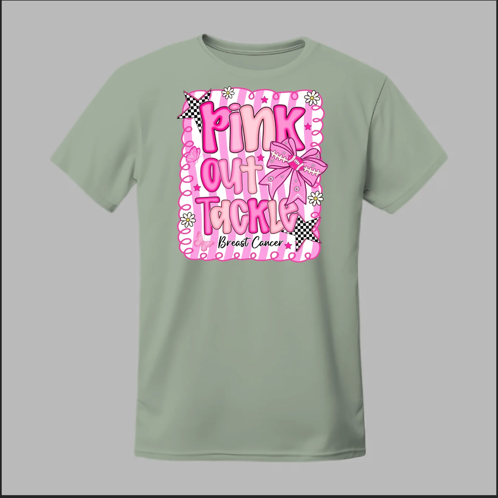 Bring bold energy to the fight with the Pink Out Tackle Breast Cancer tee. Featuring vibrant lettering, playful stars and butterflies, and a football bow centerpiece, this shirt is perfect for showing support and strength during Breast Cancer Awareness events.