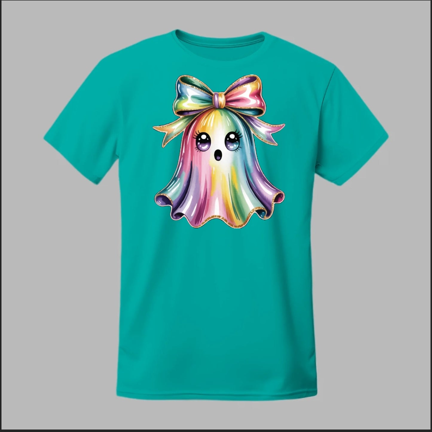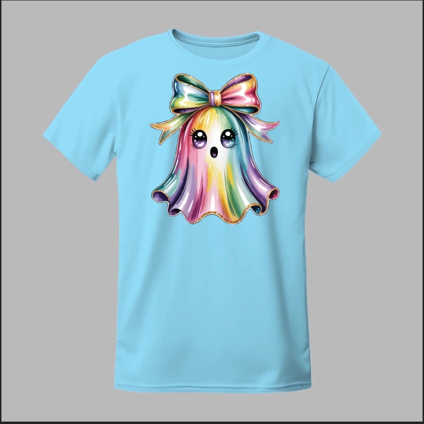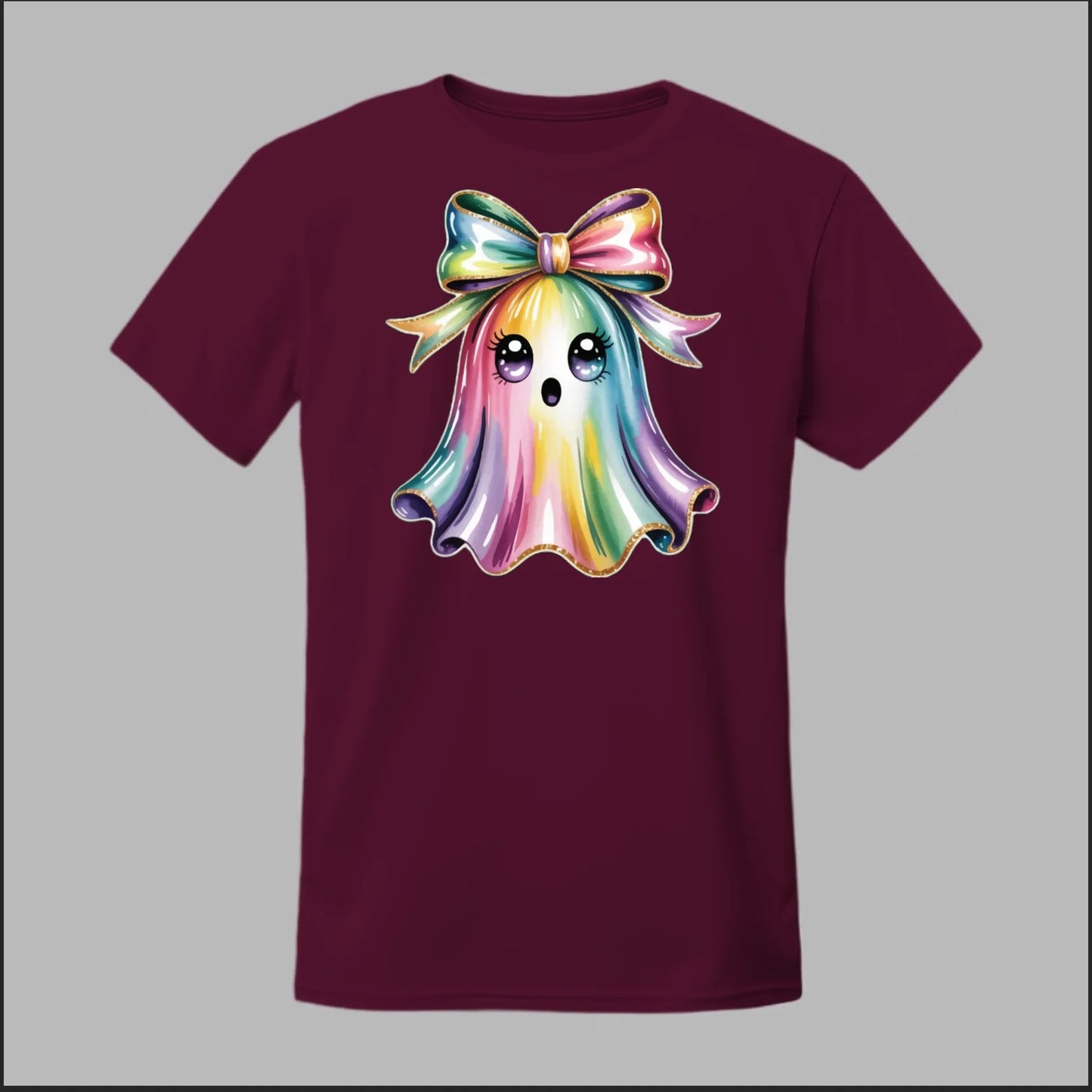 Bring some color to spooky season with our “Rainbow Boo” design. This adorable ghost shines in a rainbow gradient with big sparkling eyes and a bright bow on top. Cute, playful, and full of personality, it’s the perfect shirt for anyone who loves their Halloween with a splash of color.
