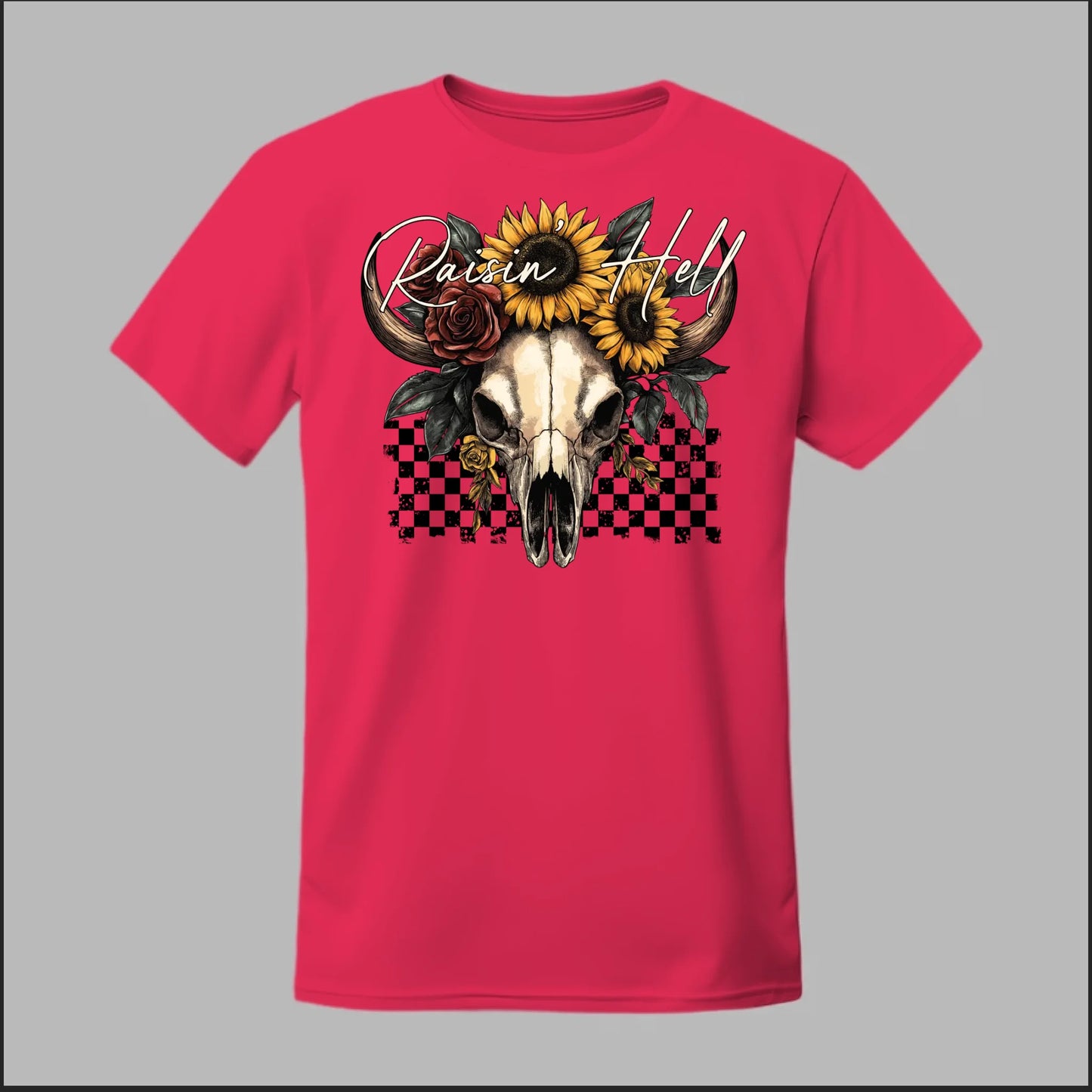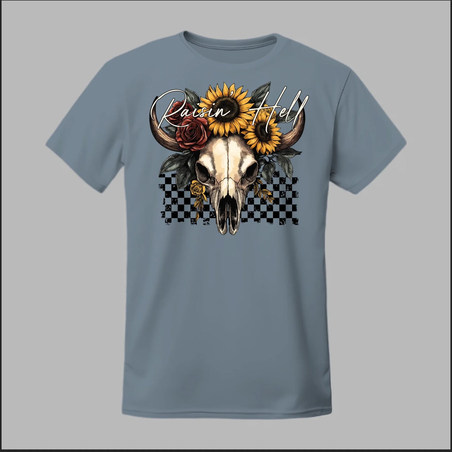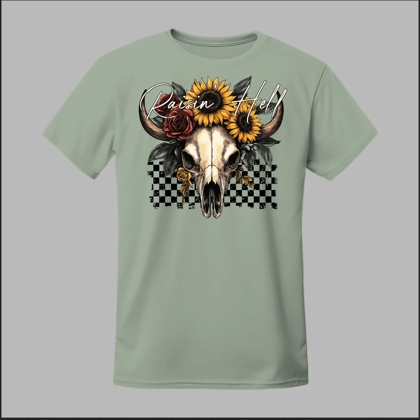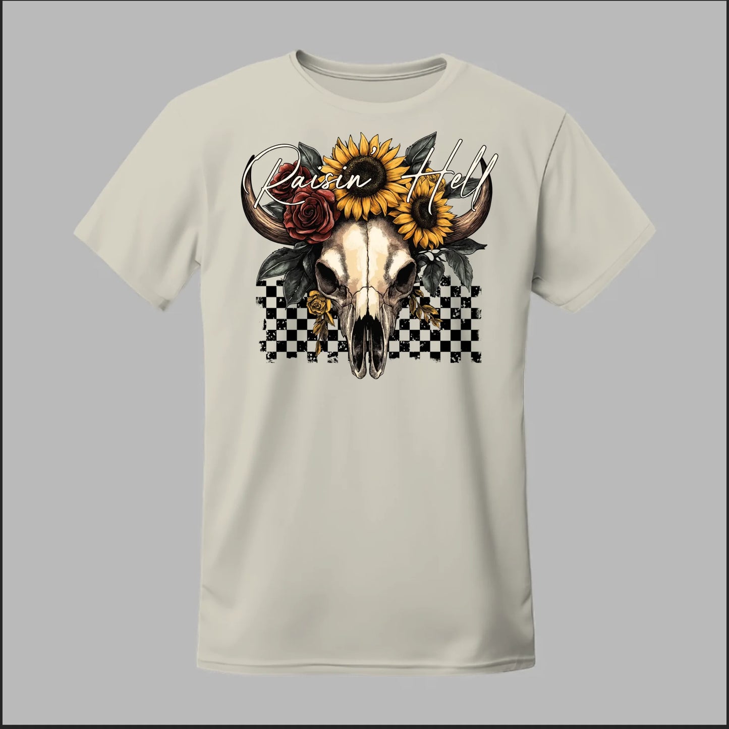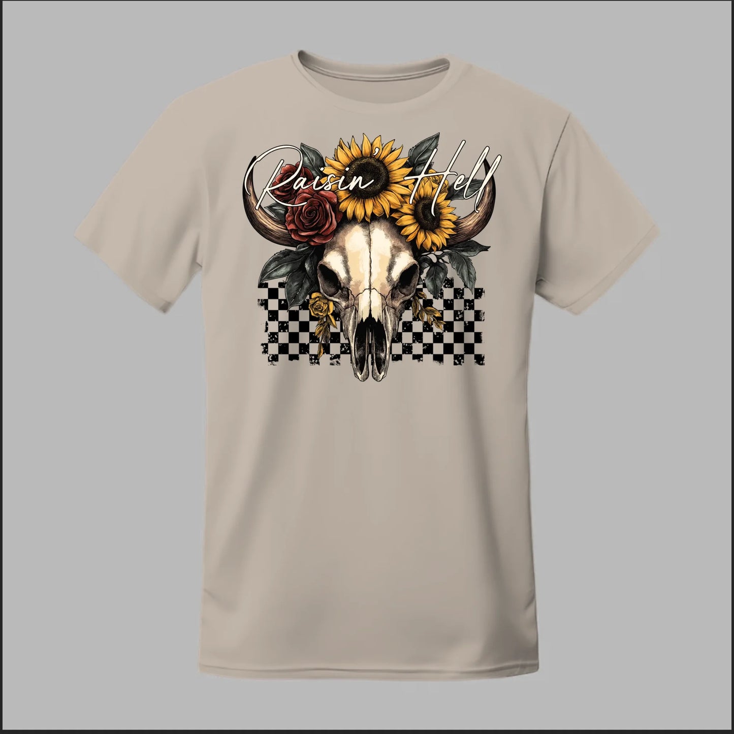 Turn heads and stir up some trouble in style with this striking design! Featuring a rustic cow skull crowned with bold sunflowers and roses, paired with the cheeky phrase “Raisin’ Hell,” this tee is perfect for anyone who’s a little country, a little wild, and not afraid to make a statement.