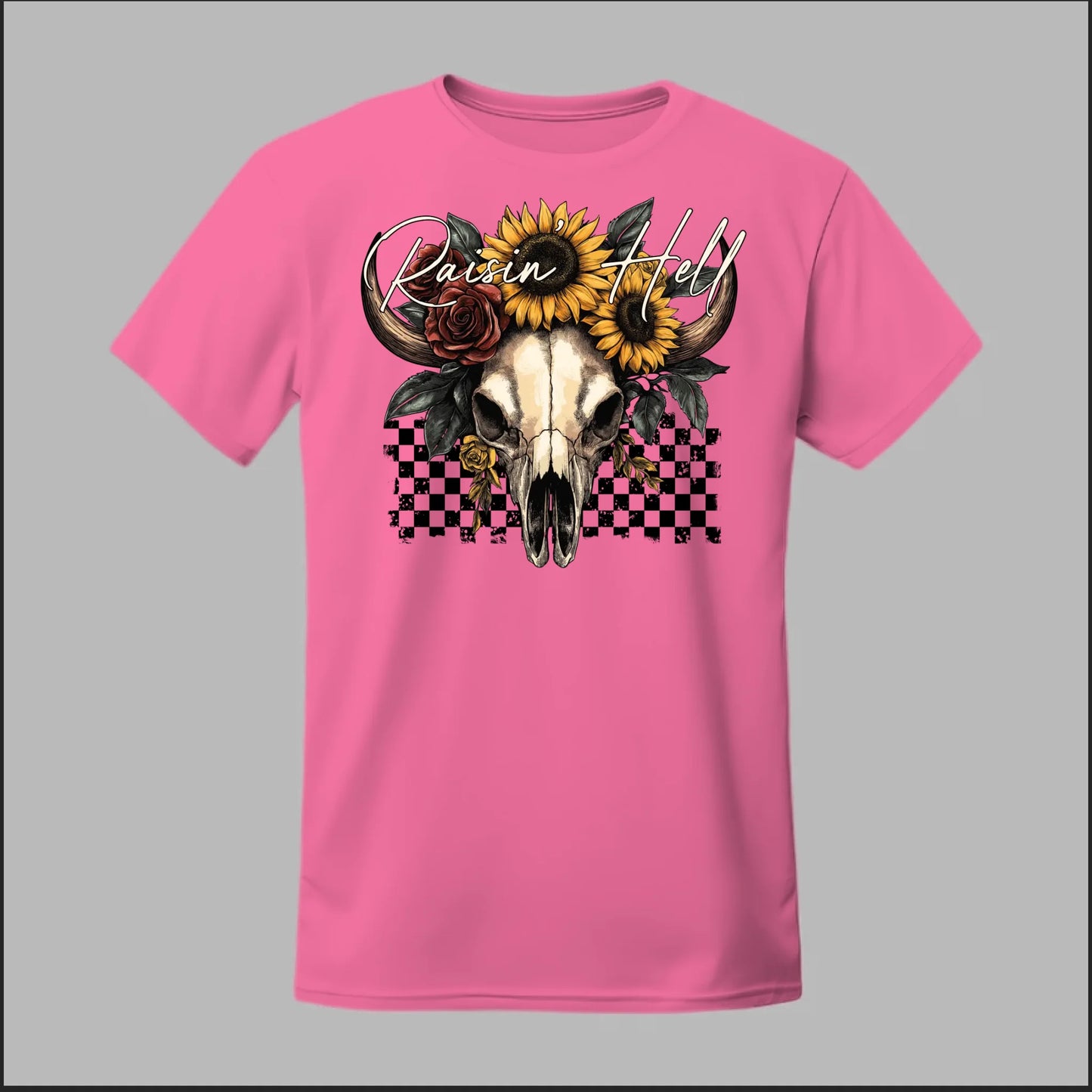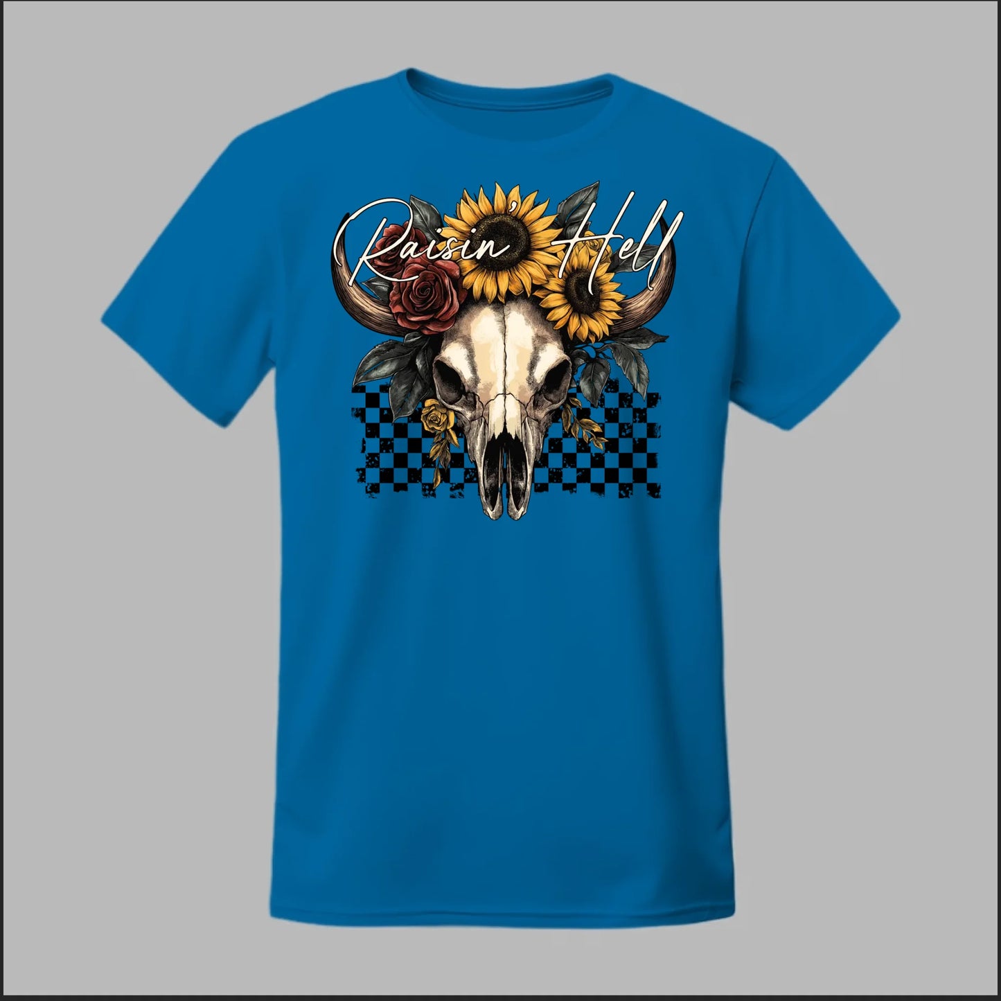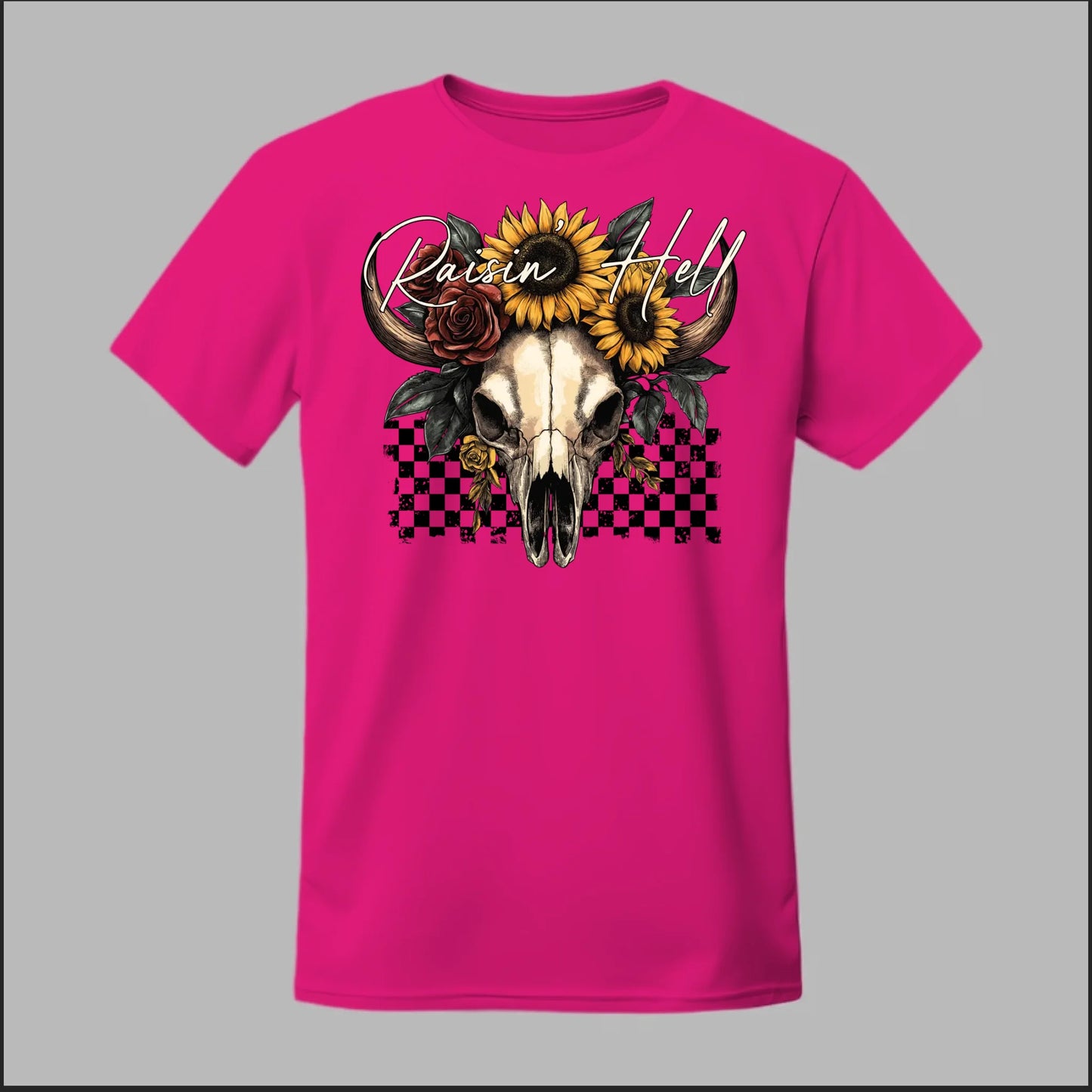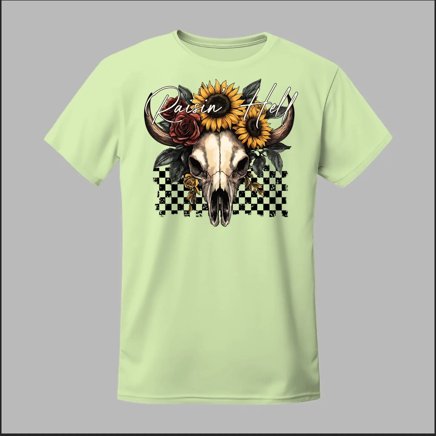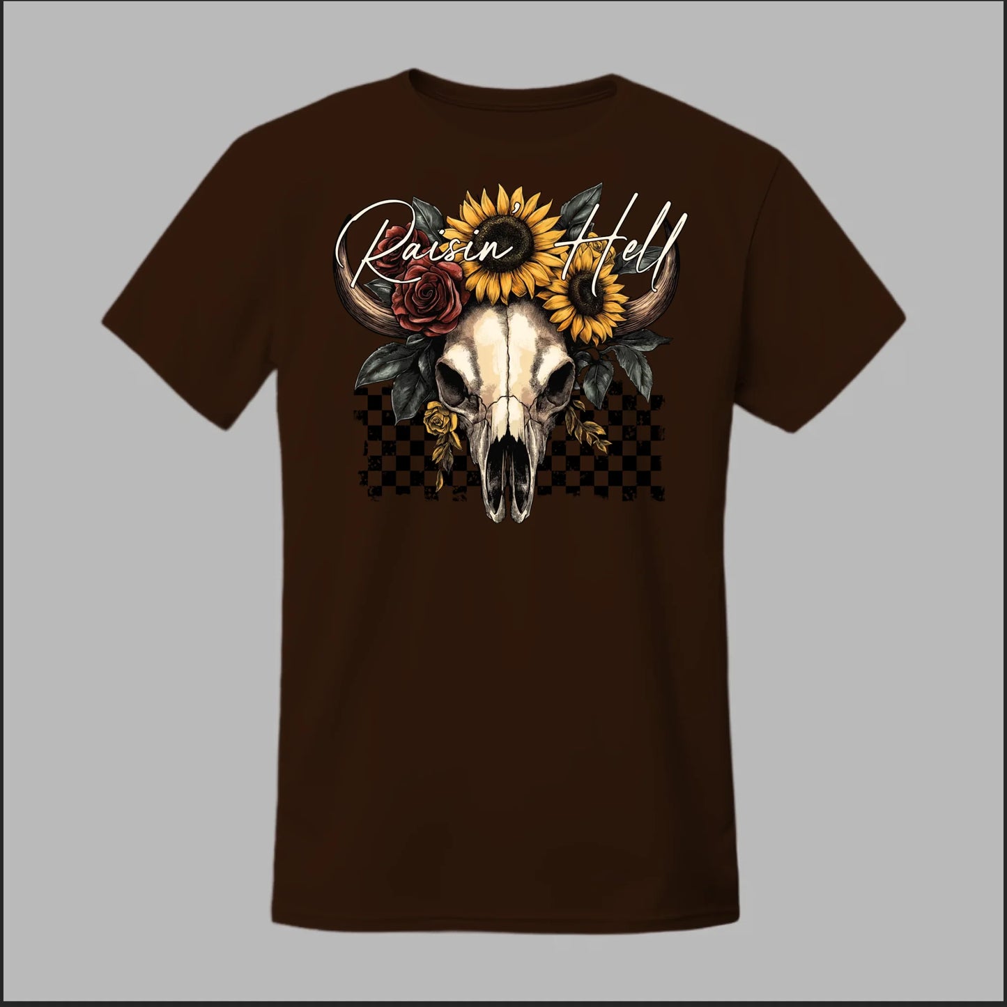 Turn heads and stir up some trouble in style with this striking design! Featuring a rustic cow skull crowned with bold sunflowers and roses, paired with the cheeky phrase “Raisin’ Hell,” this tee is perfect for anyone who’s a little country, a little wild, and not afraid to make a statement.