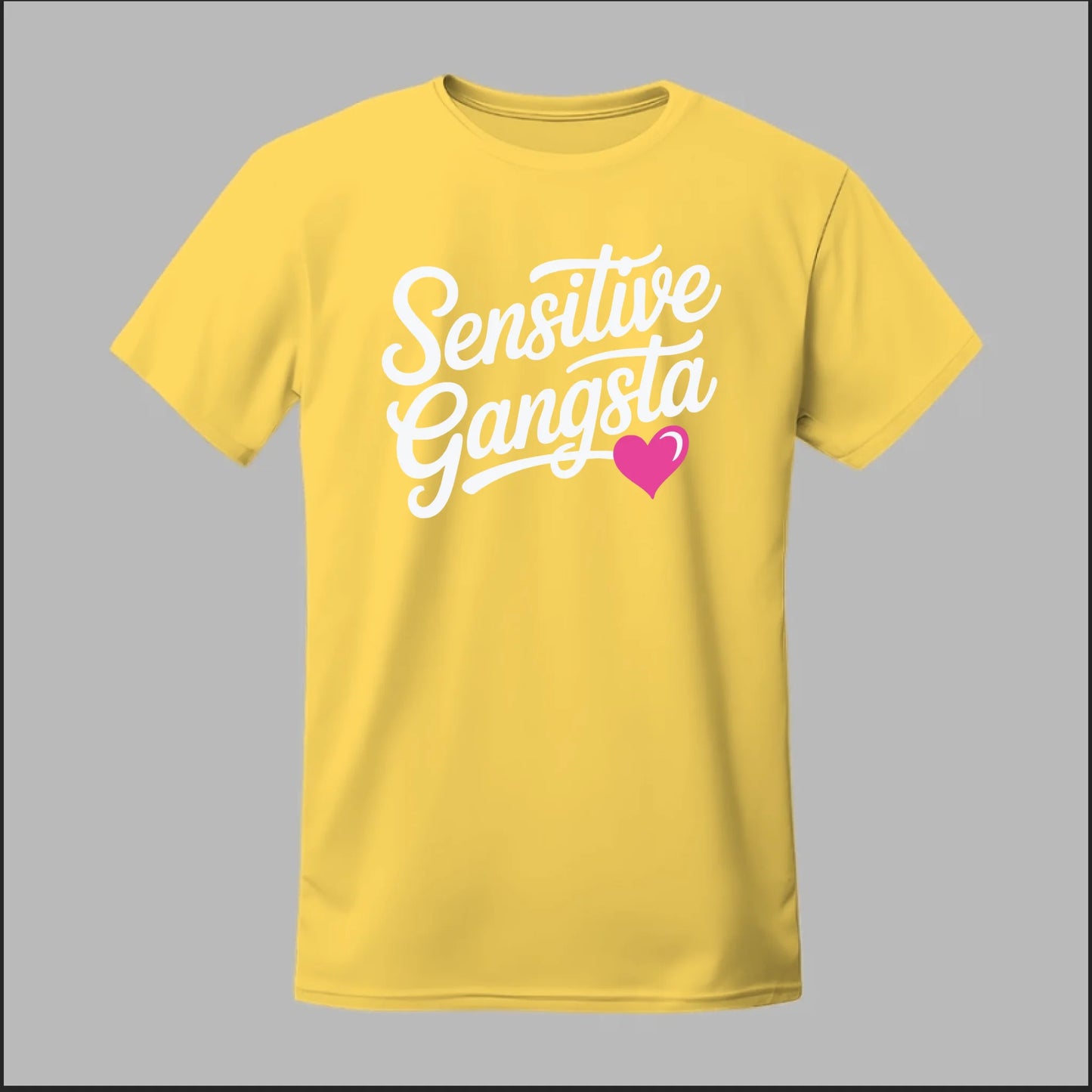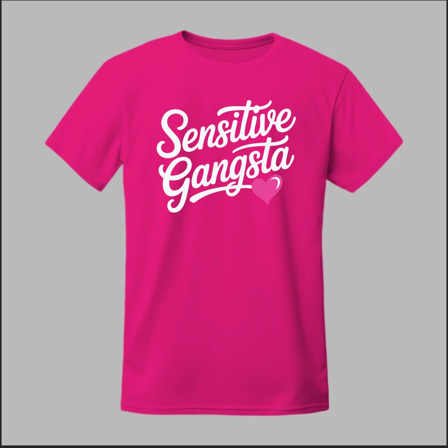 Gangsters need love too.... This shirt says it all with bold script lettering and a playful pink heart. “Sensitive Gangsta” celebrates strength and softness in one stylish design. Perfect for anyone who owns their emotions but keeps their edge.