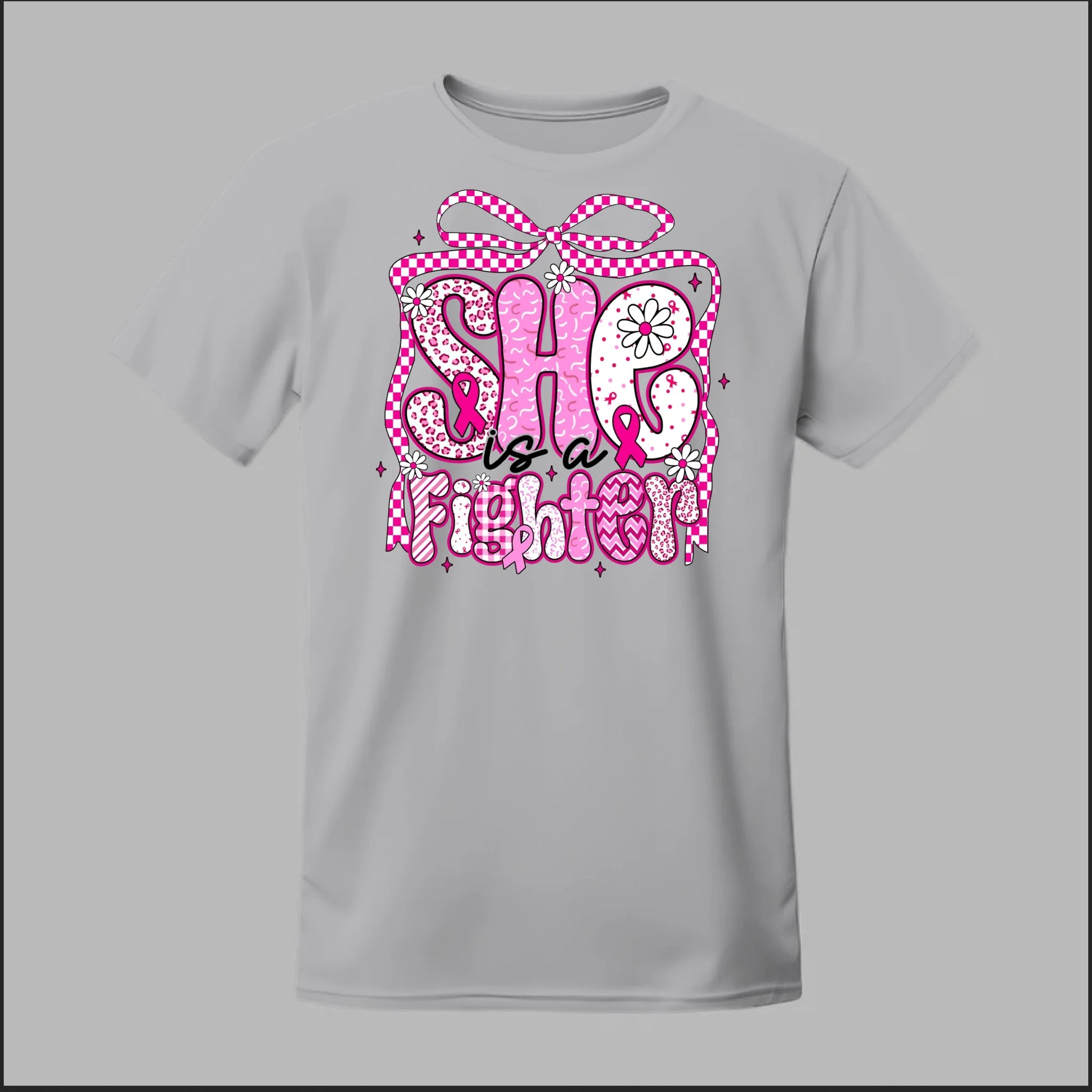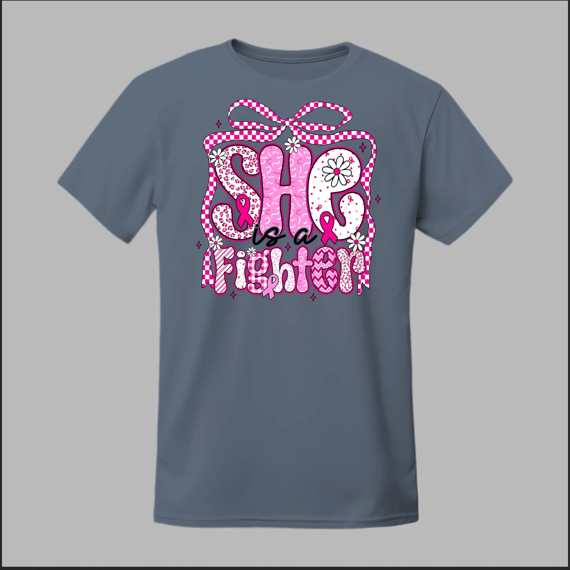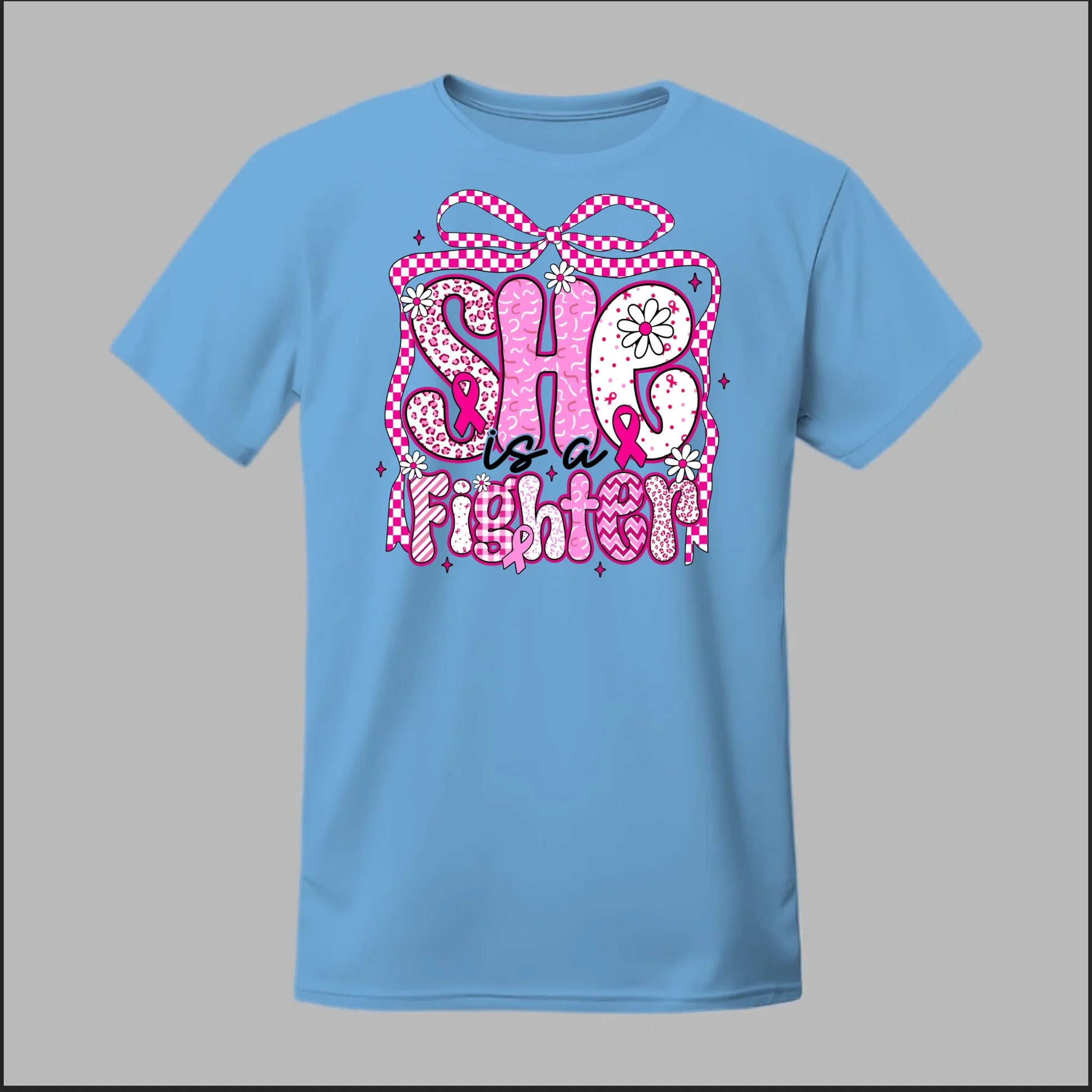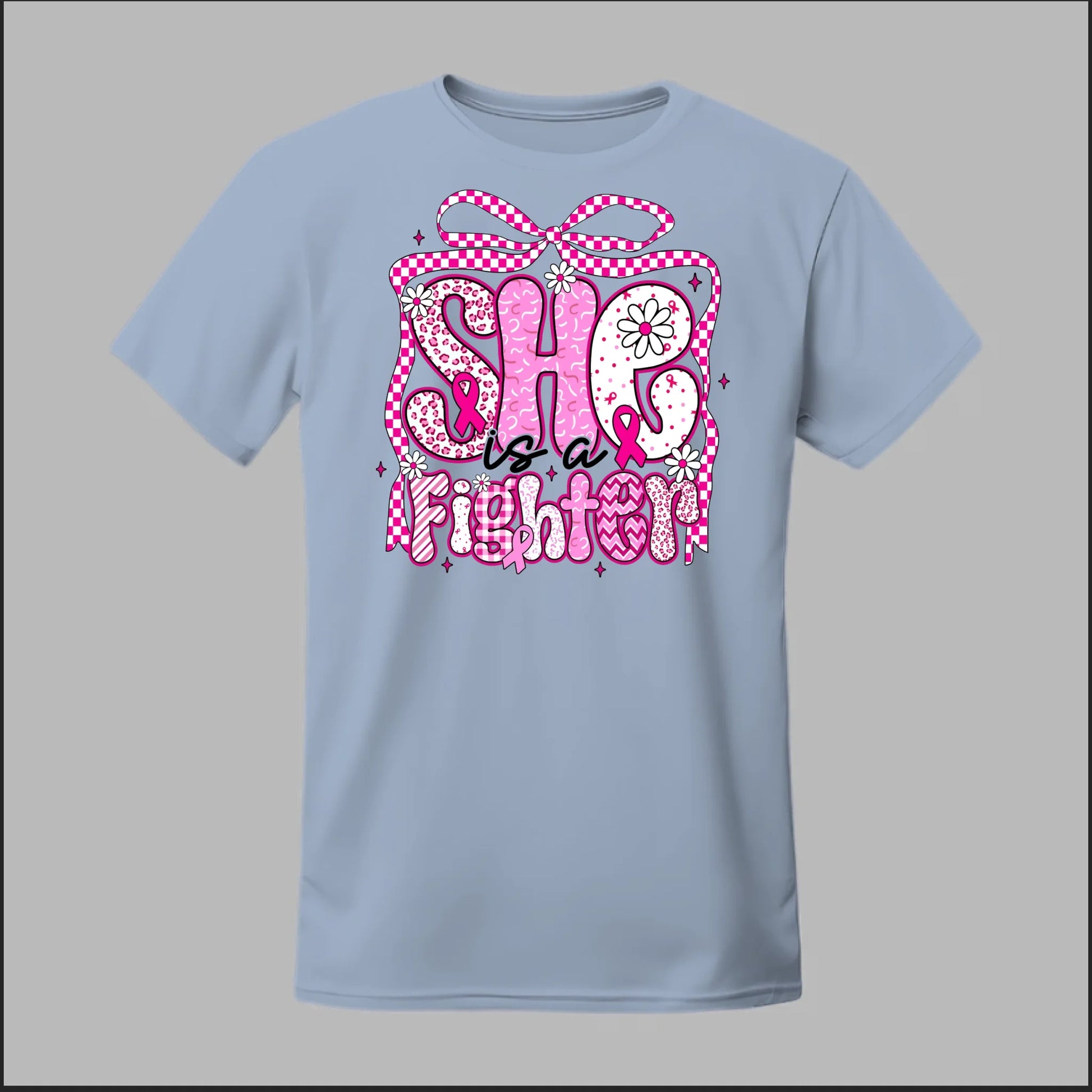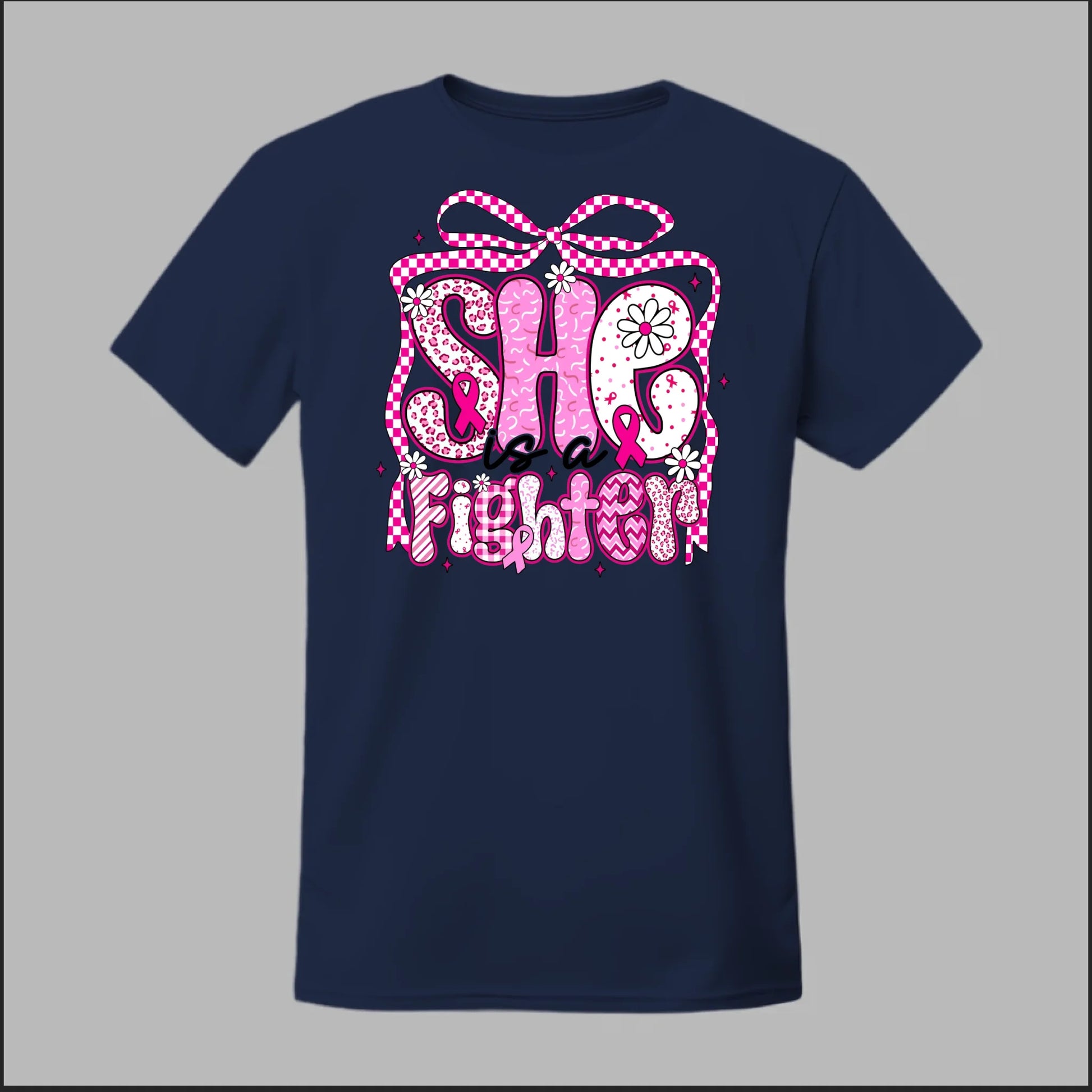 The She Is a Fighter Tee celebrates courage, resilience, and strength with bold pink patterns, playful florals, and the iconic breast cancer ribbon woven into the design. This empowering shirt is a reminder that every woman facing the fight is powerful and unstoppable. Perfect for showing support during Breast Cancer Awareness Month and beyond.
