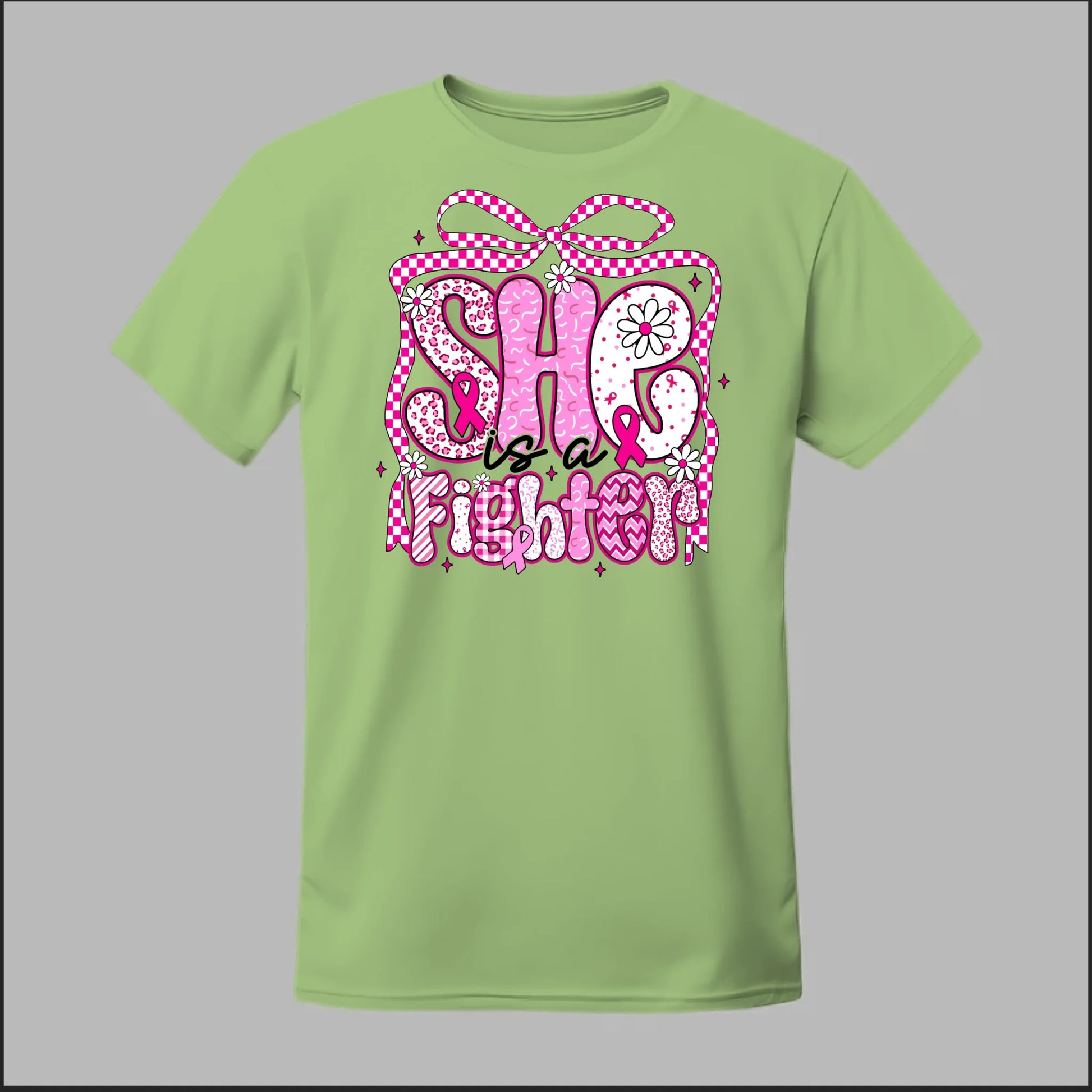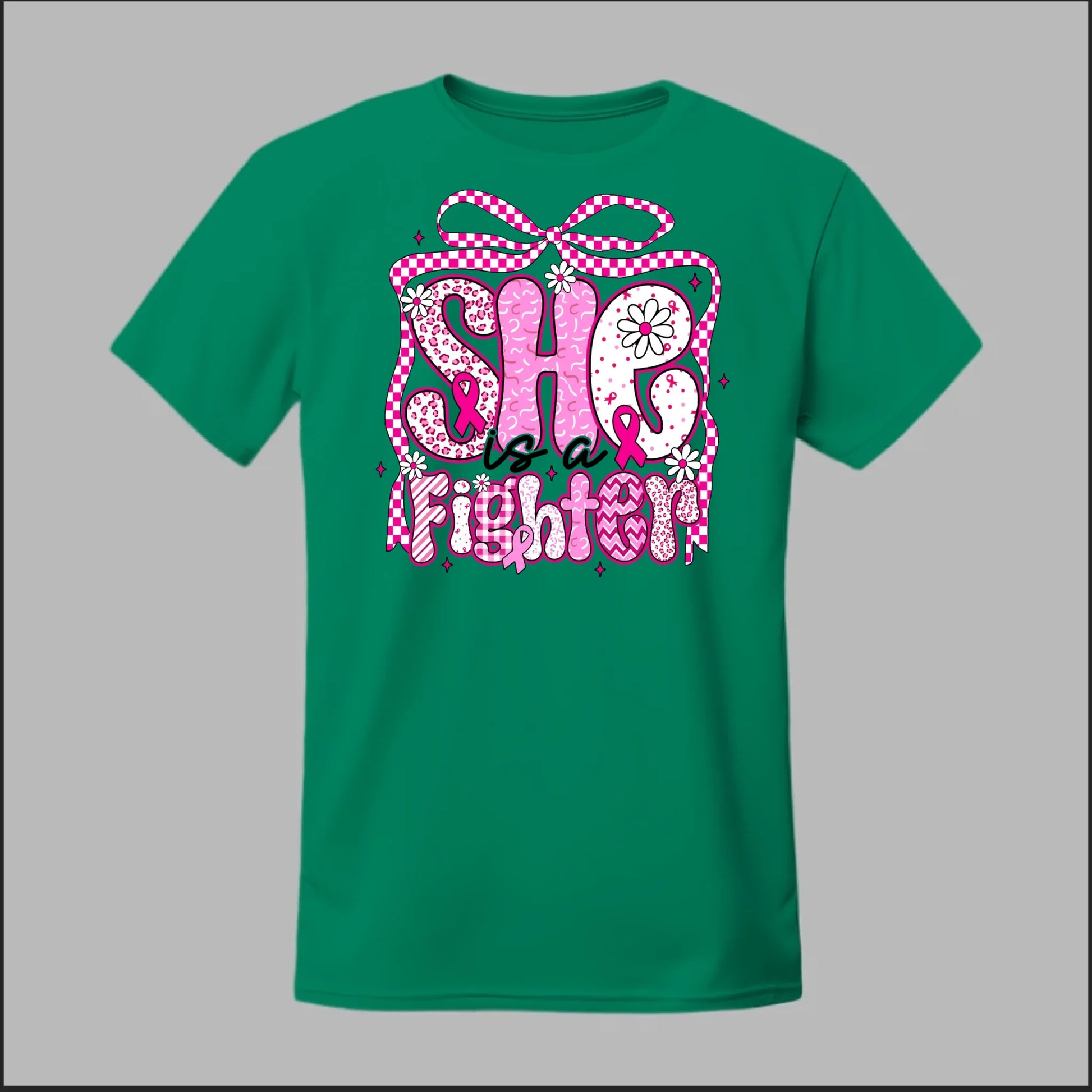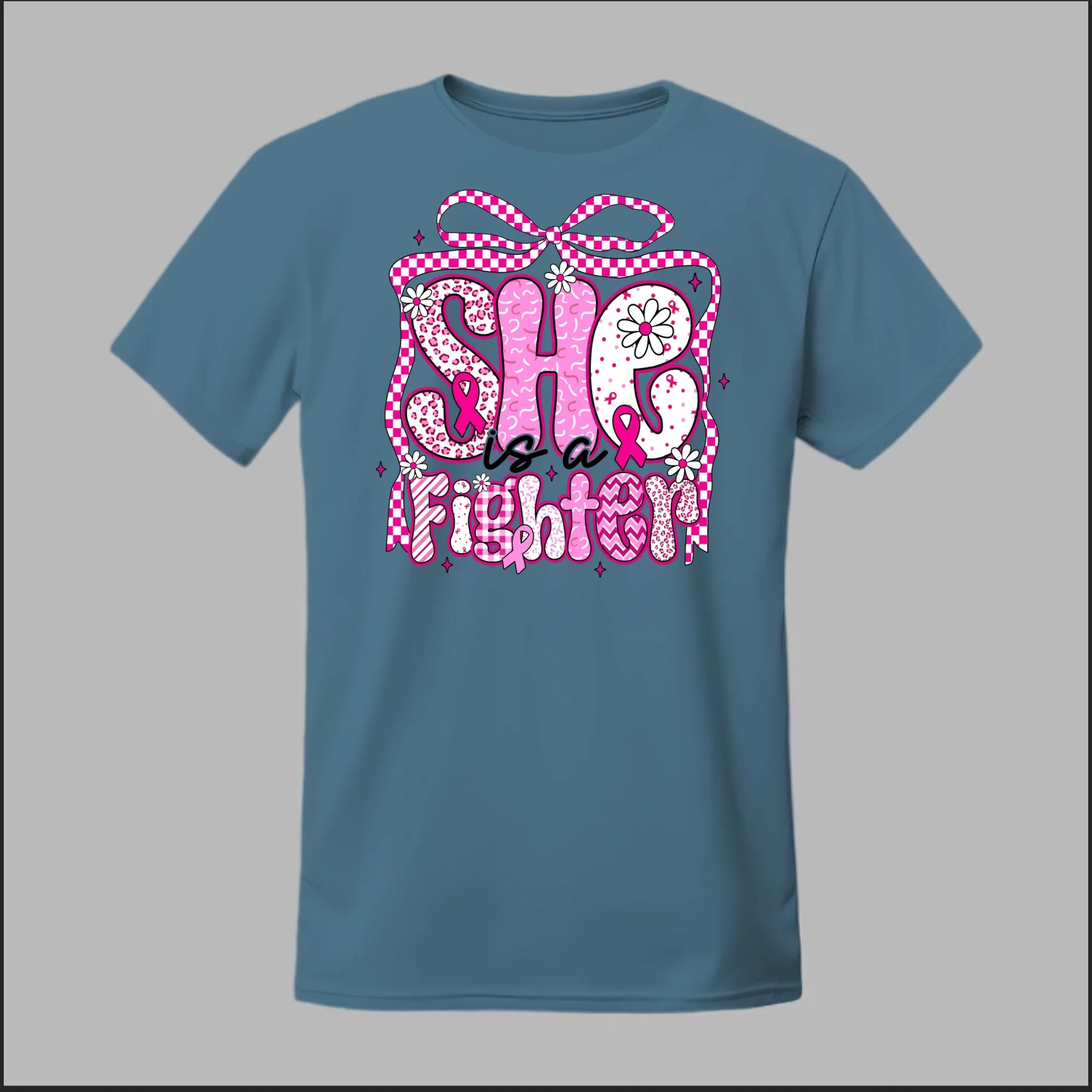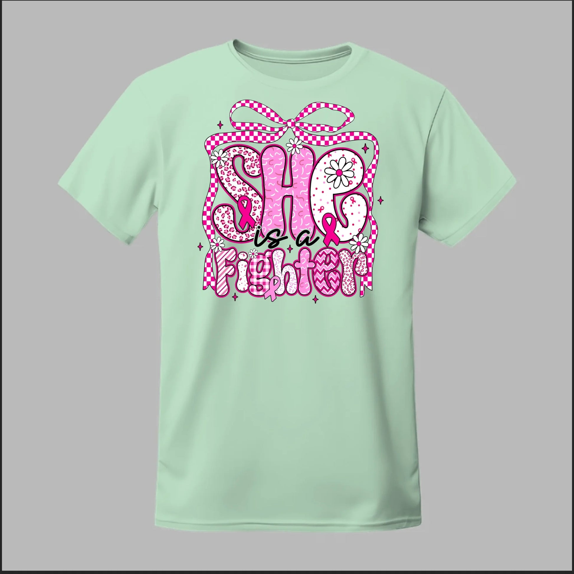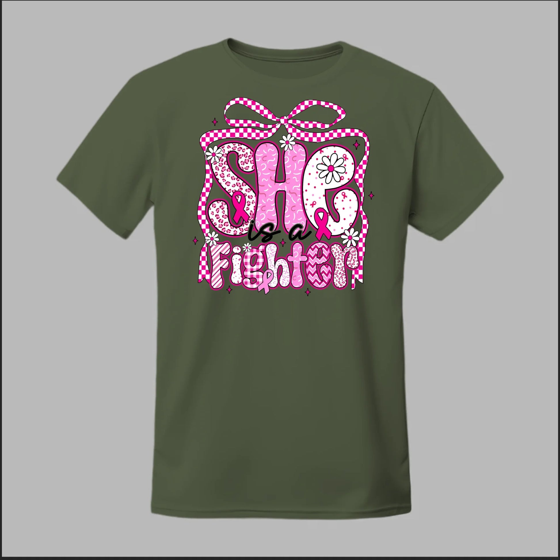 The She Is a Fighter Tee celebrates courage, resilience, and strength with bold pink patterns, playful florals, and the iconic breast cancer ribbon woven into the design. This empowering shirt is a reminder that every woman facing the fight is powerful and unstoppable. Perfect for showing support during Breast Cancer Awareness Month and beyond.