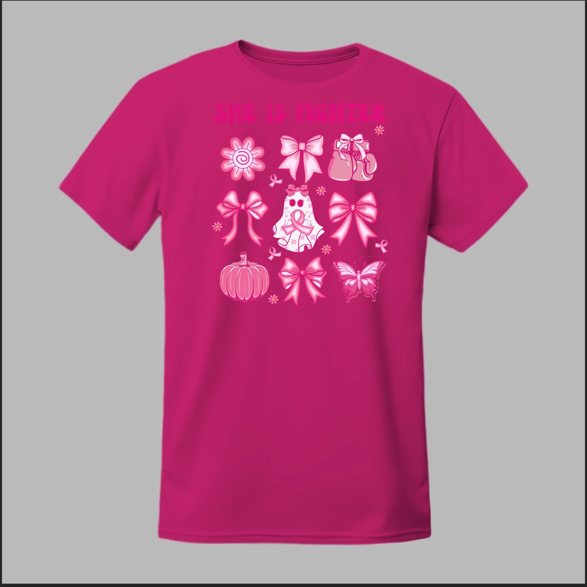 The She Is Fighter – Faith & Strength Tee combines empowering affirmations with bold pink icons like ribbons, bows, boxing gloves, and a playful ghost, all accented with inspirational scripture references. This uplifting design celebrates resilience, faith, and hope for those fighting breast cancer, reminding wearers they are chosen, strong, victorious, and never alone. A perfect shirt for Breast Cancer Awareness Month to inspire courage and spread love.