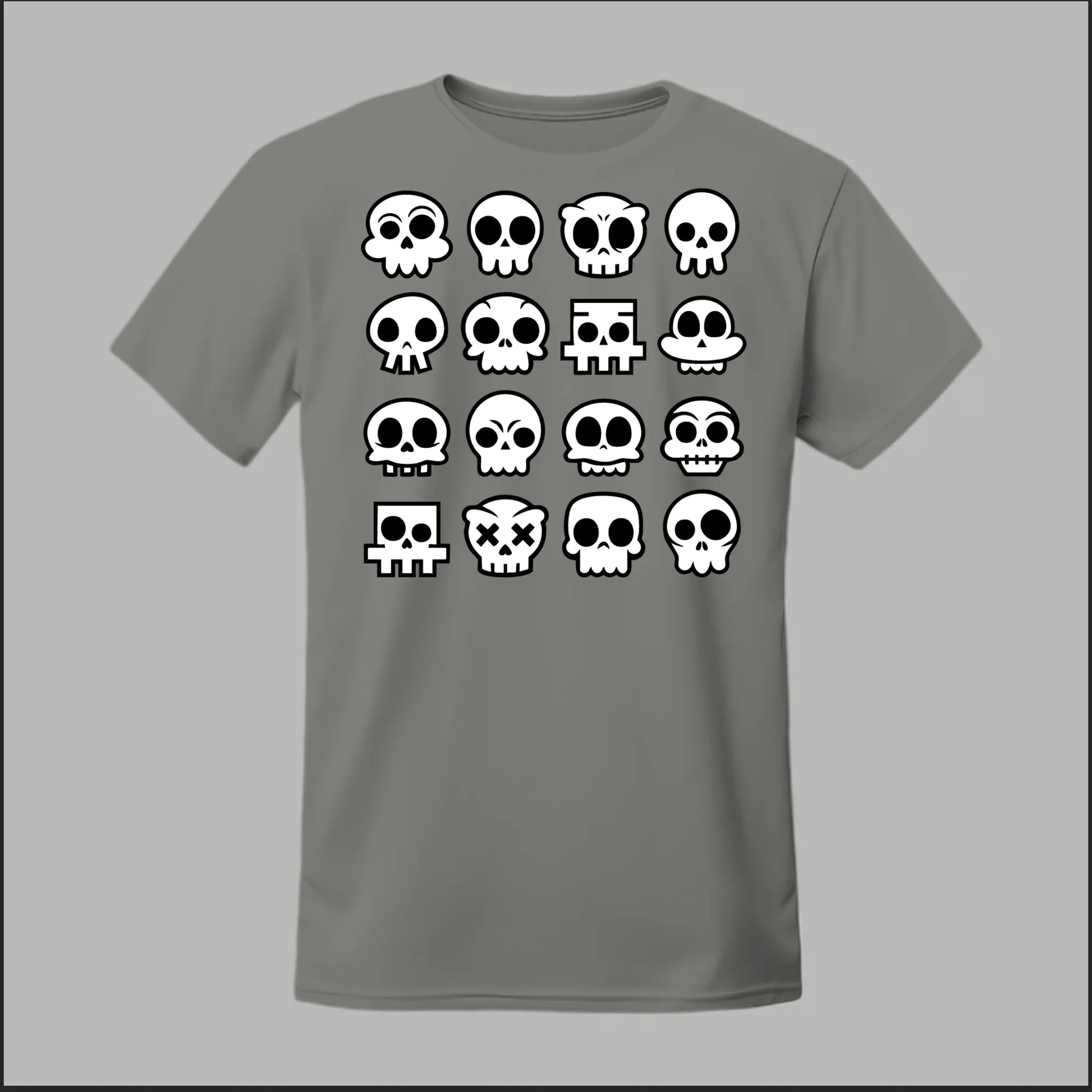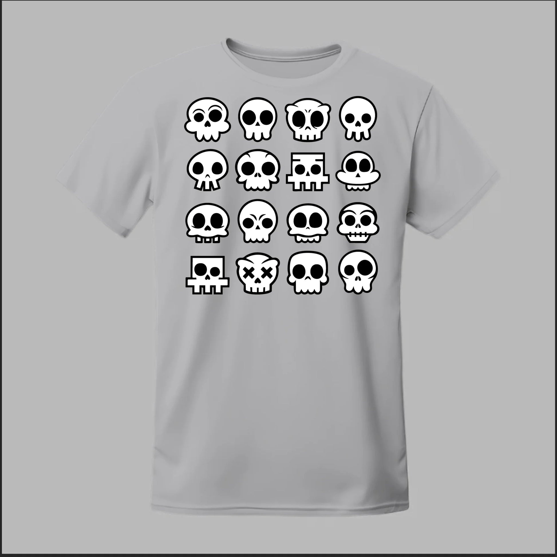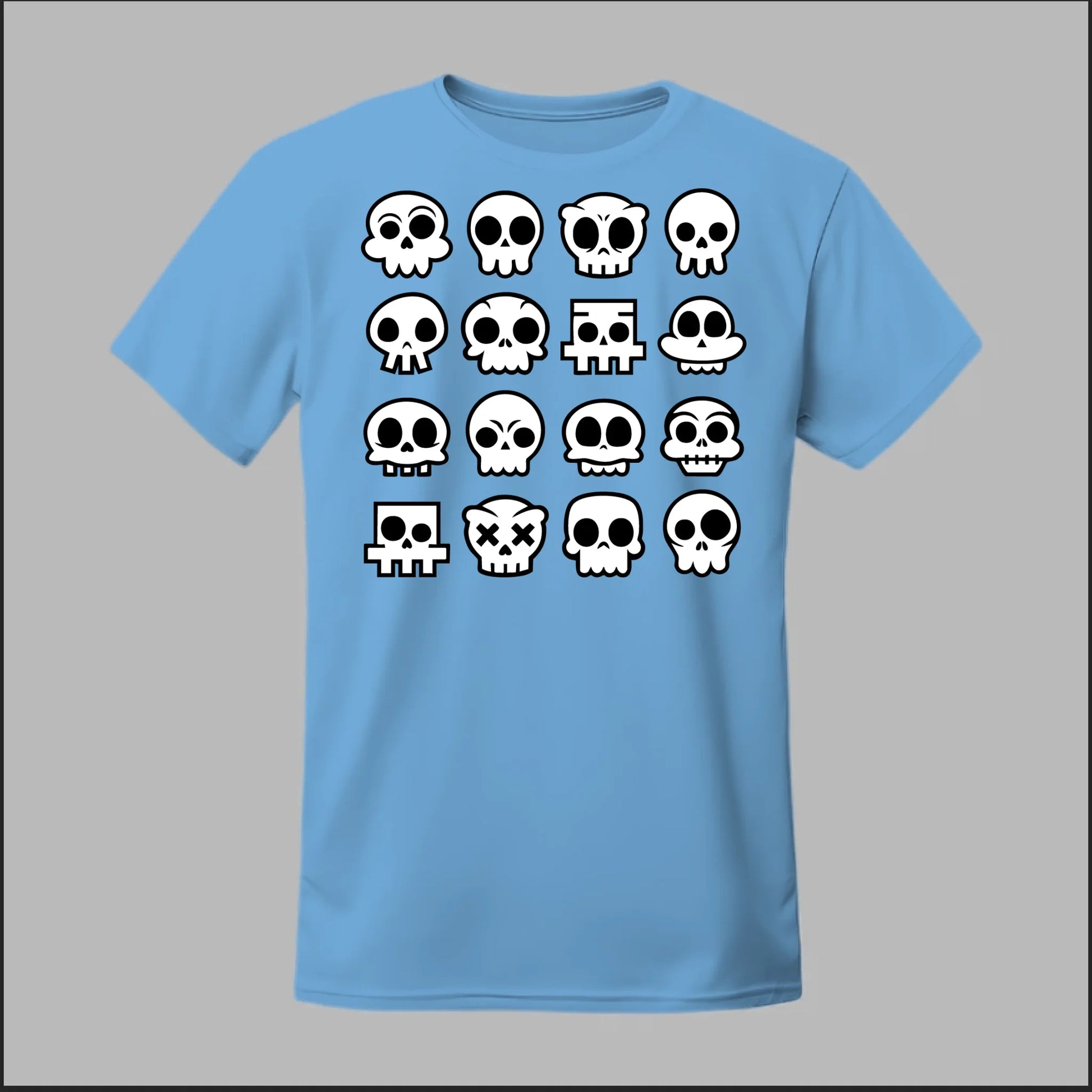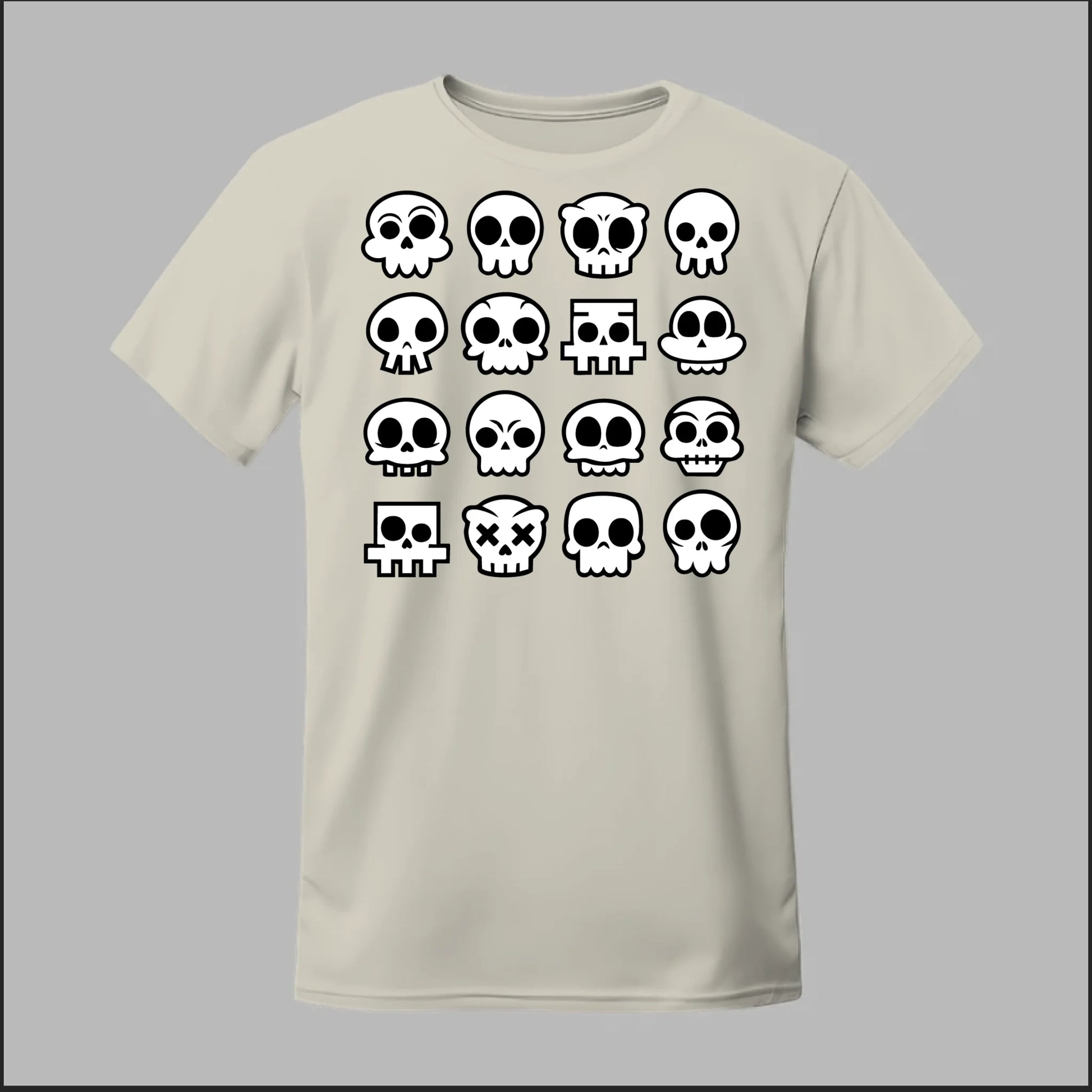 Add some playful spook to your wardrobe with this Cute Skull Cluster design! Featuring a grid of quirky and adorable skull faces, this design is equal parts spooky and fun — perfect for Halloween or everyday wear for skull lovers.