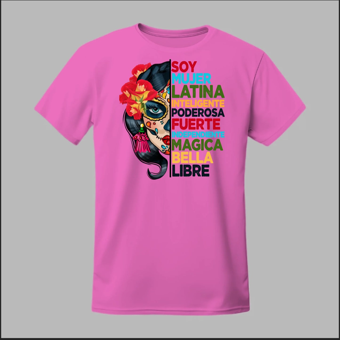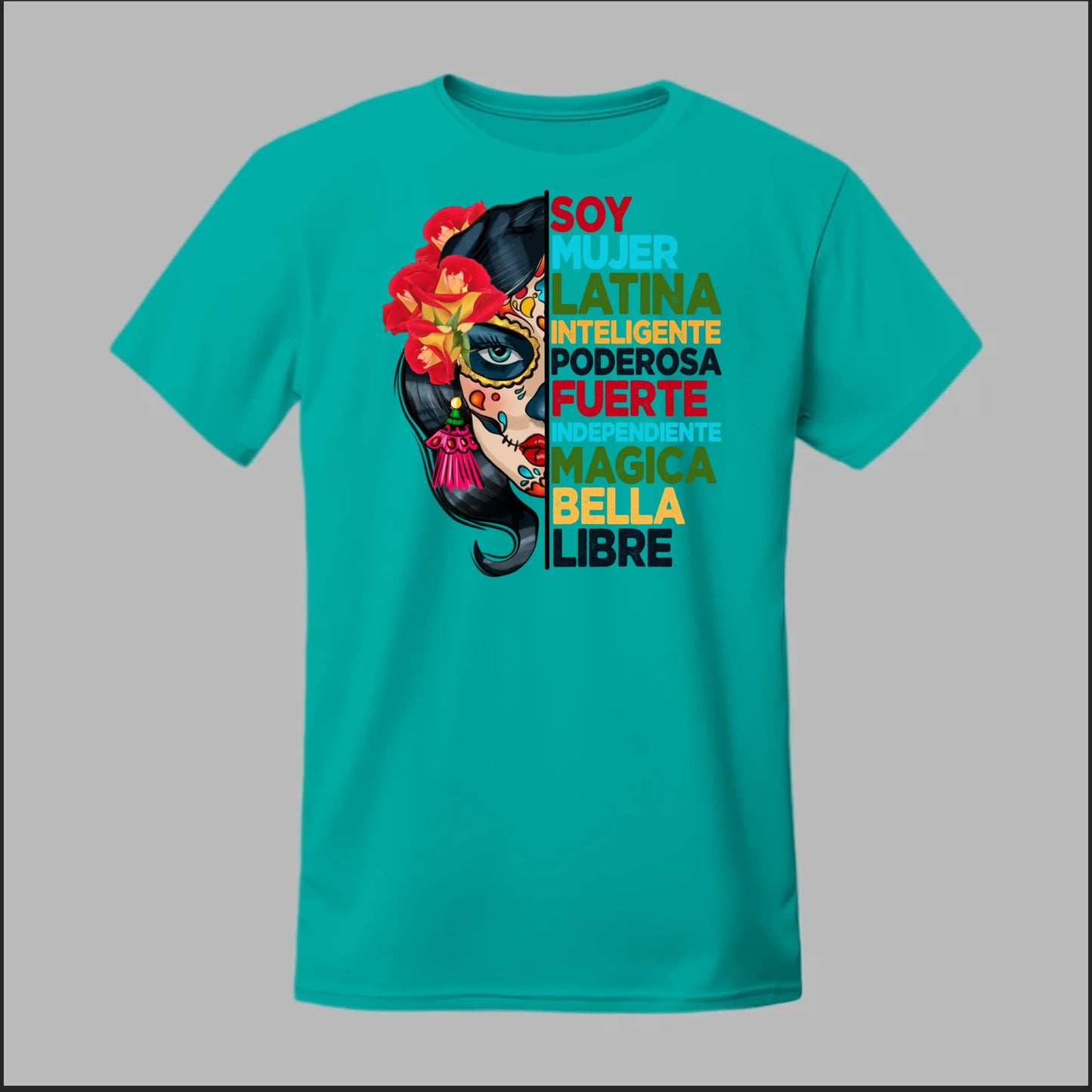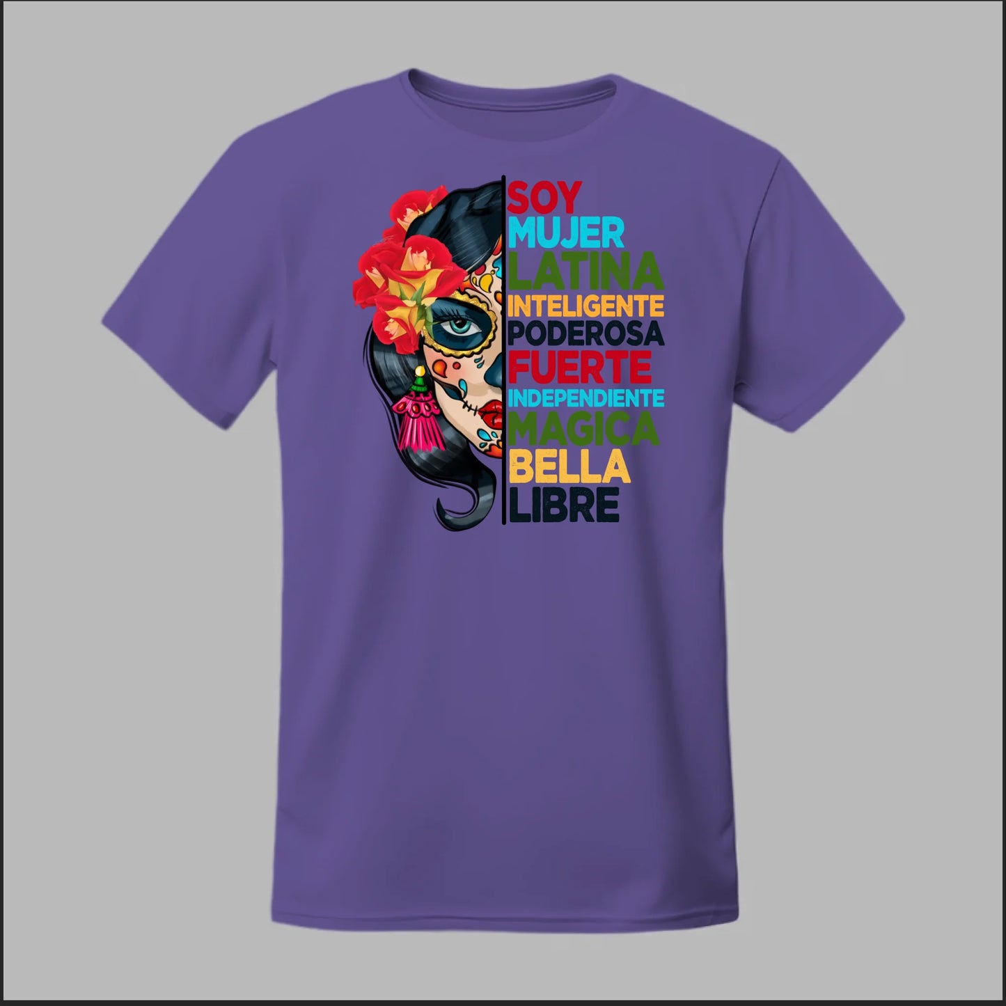 Stand proud in this Soy Mujer Latina shirt featuring a bold sugar skull portrait framed by powerful words: Inteligente, Poderosa, Fuerte, Independiente, Mágica, Bella, Libre. A vibrant celebration of Latina identity, strength, and beauty. Perfect for Hispanic Heritage Month or everyday empowerment.