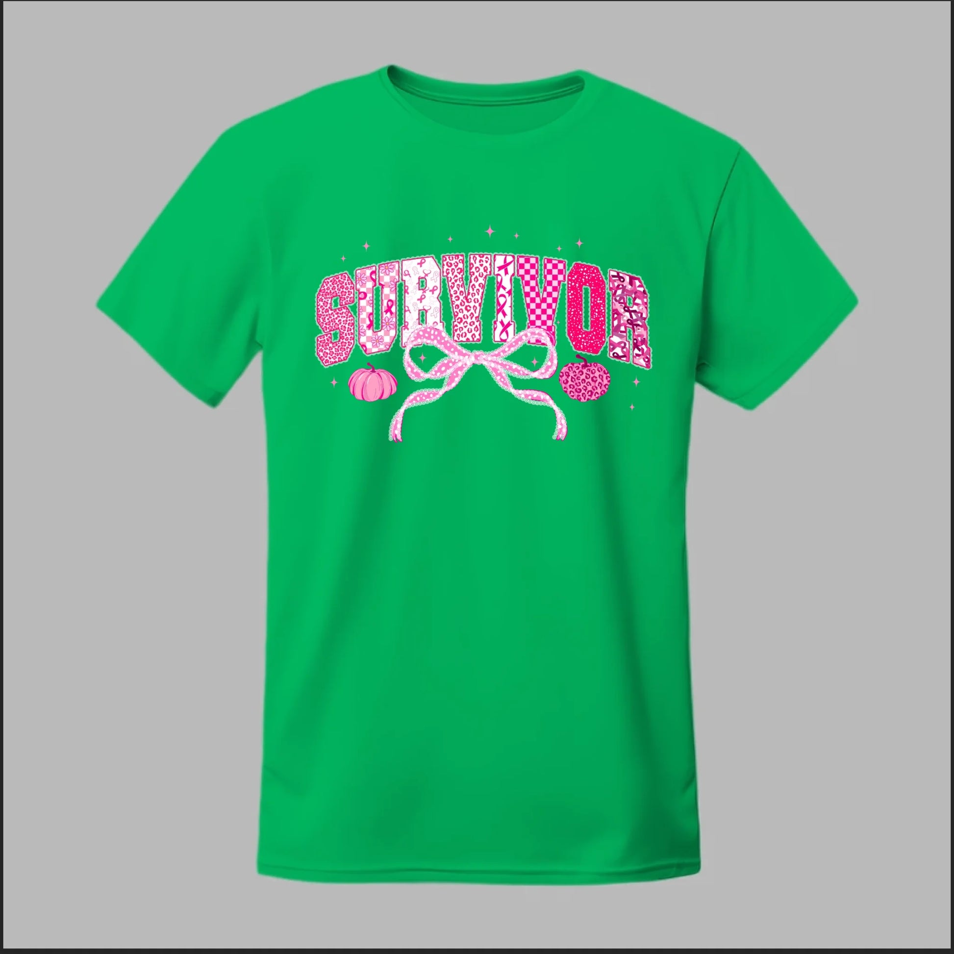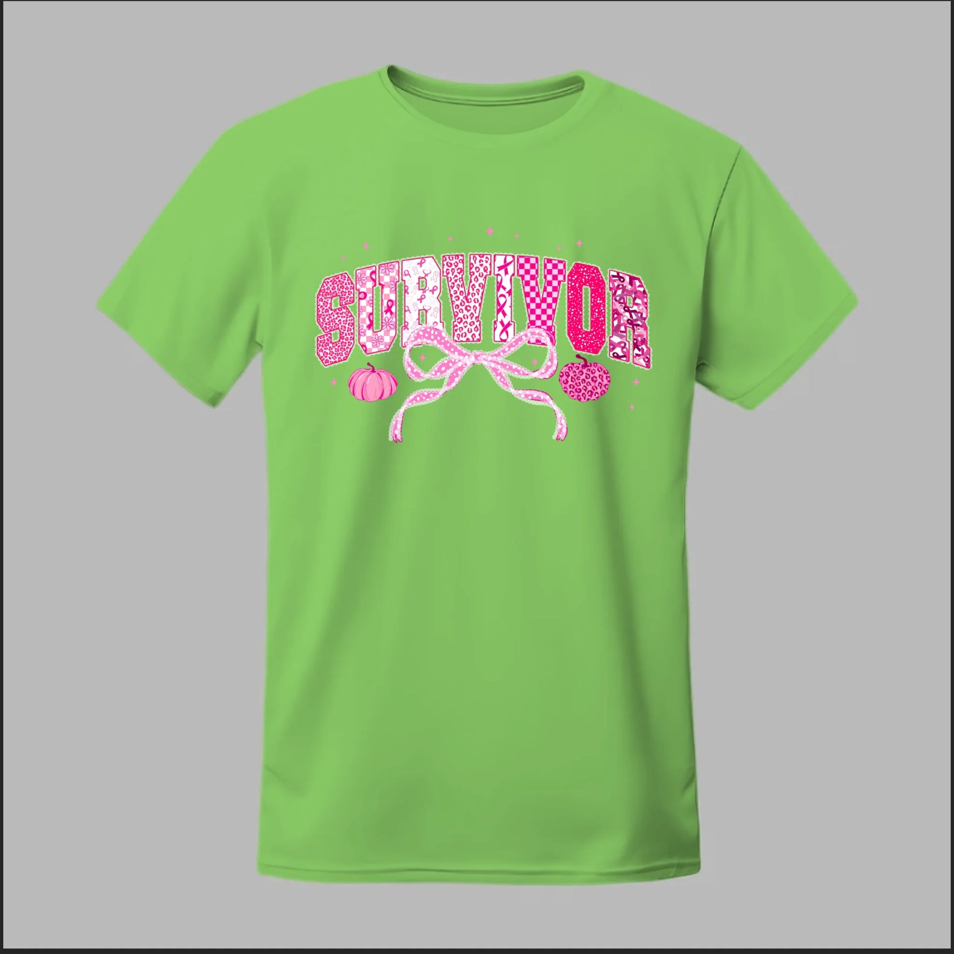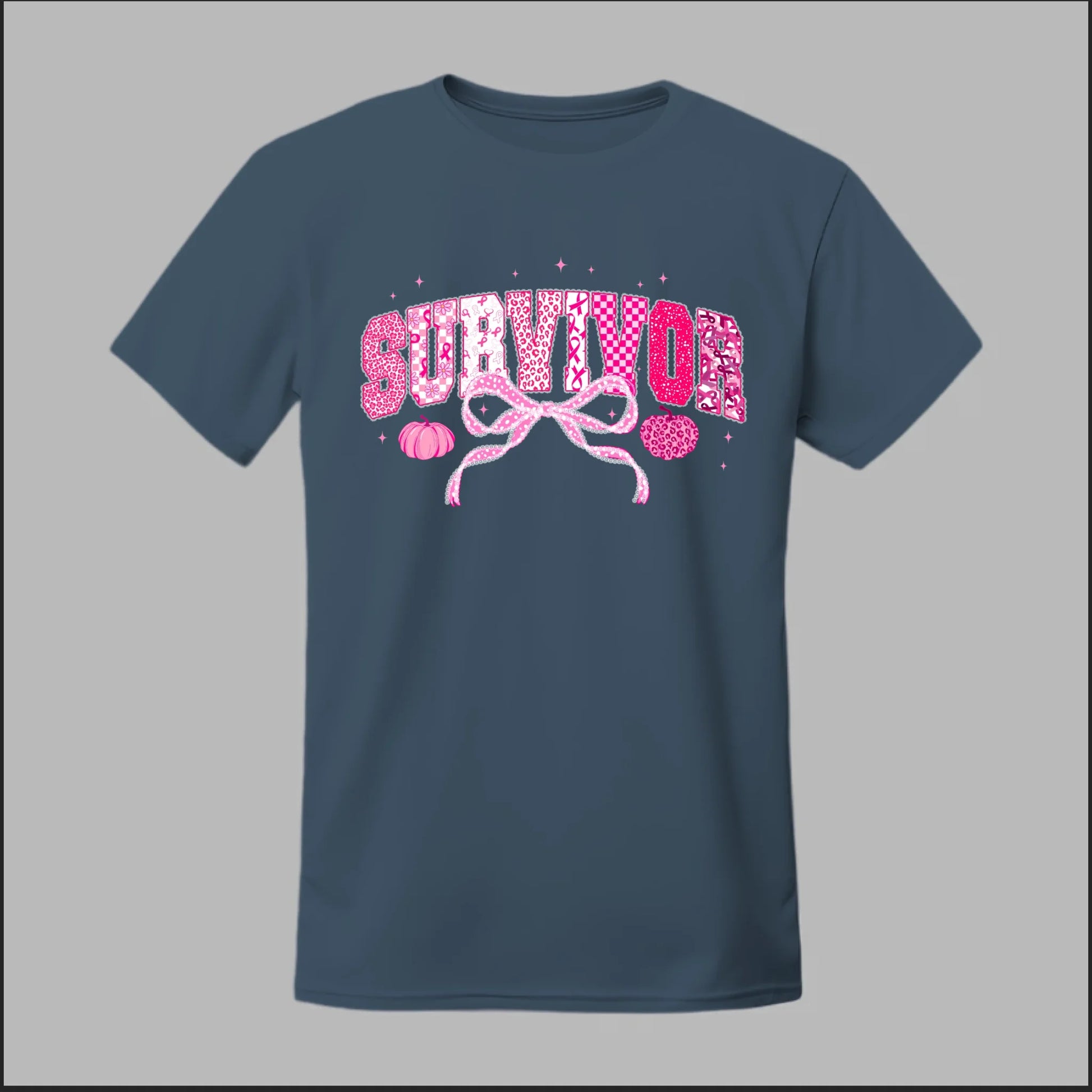The Survivor Lace Strength Tee combines resilience with delicate detail. Bold pink patterned letters are edged in lace-like trim, accented by ribbons and pumpkins for a powerful yet elegant tribute to survivors. Crafted from soft, breathable fabric, it’s ideal for October awareness events or year-round empowerment.