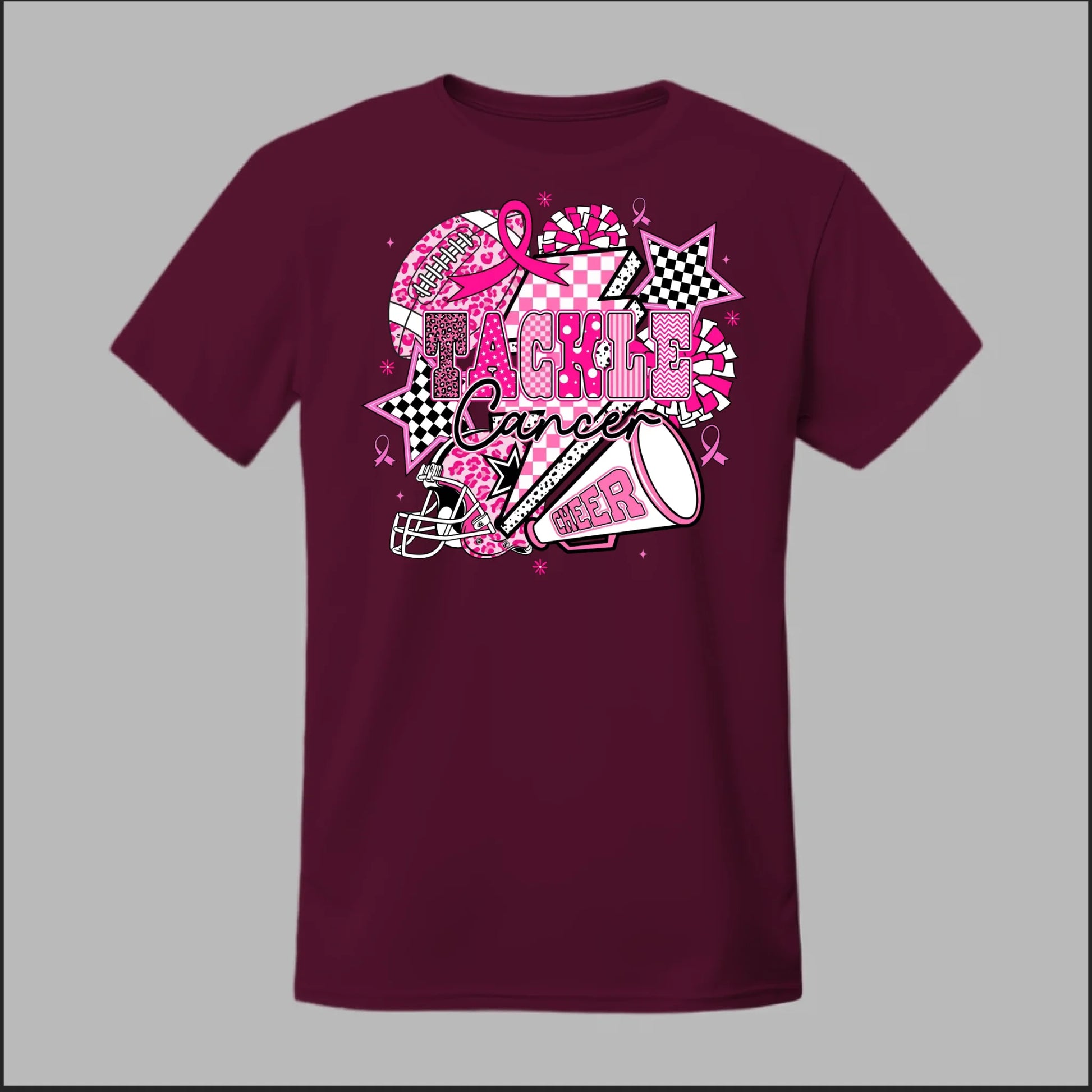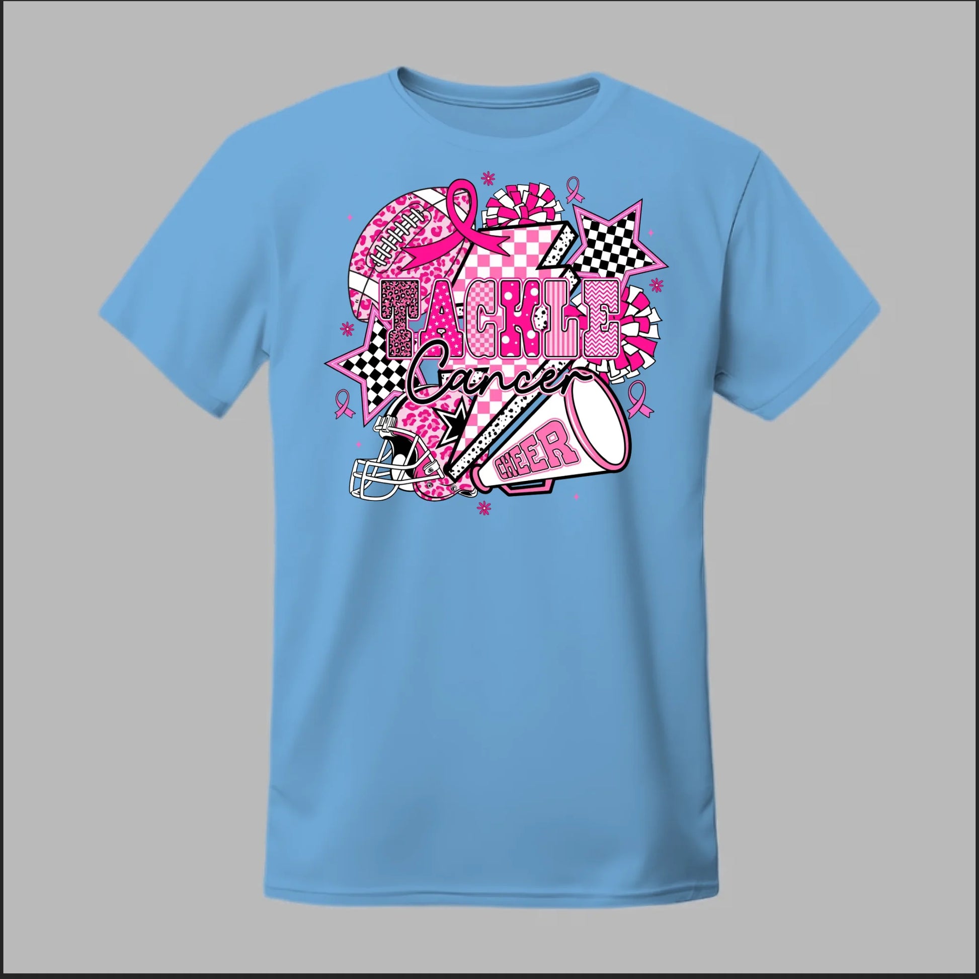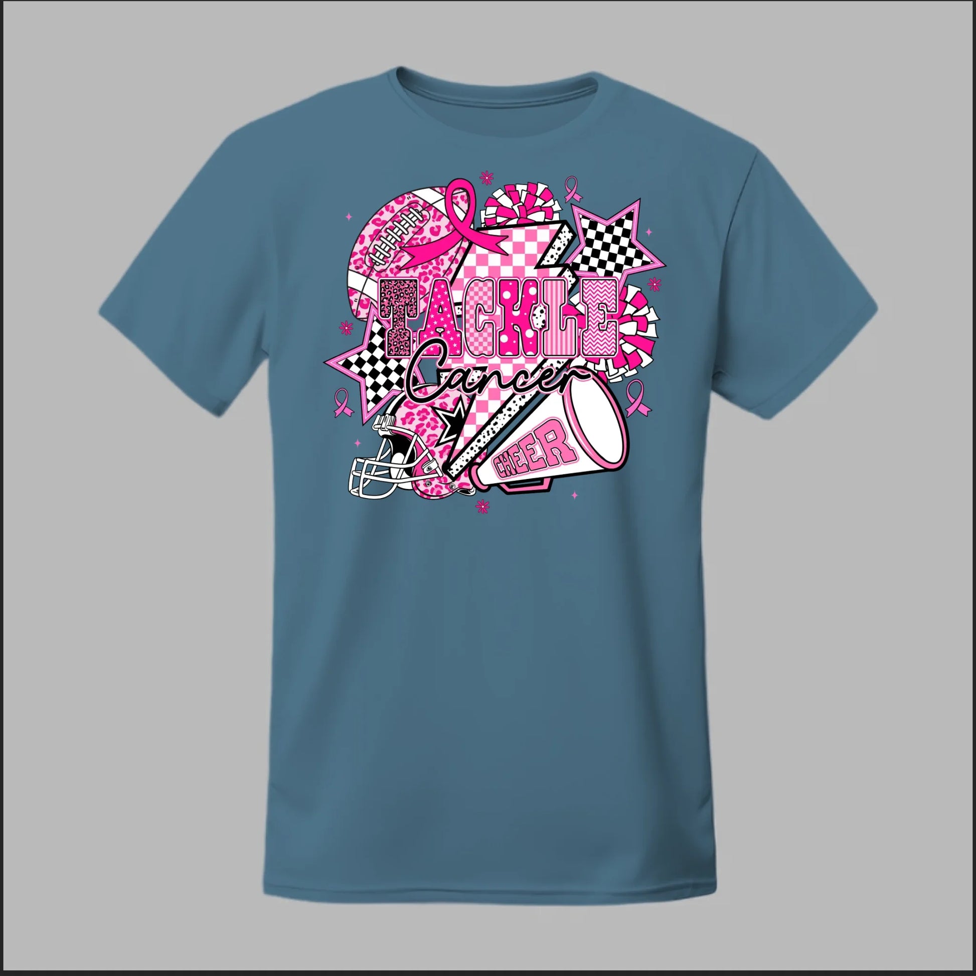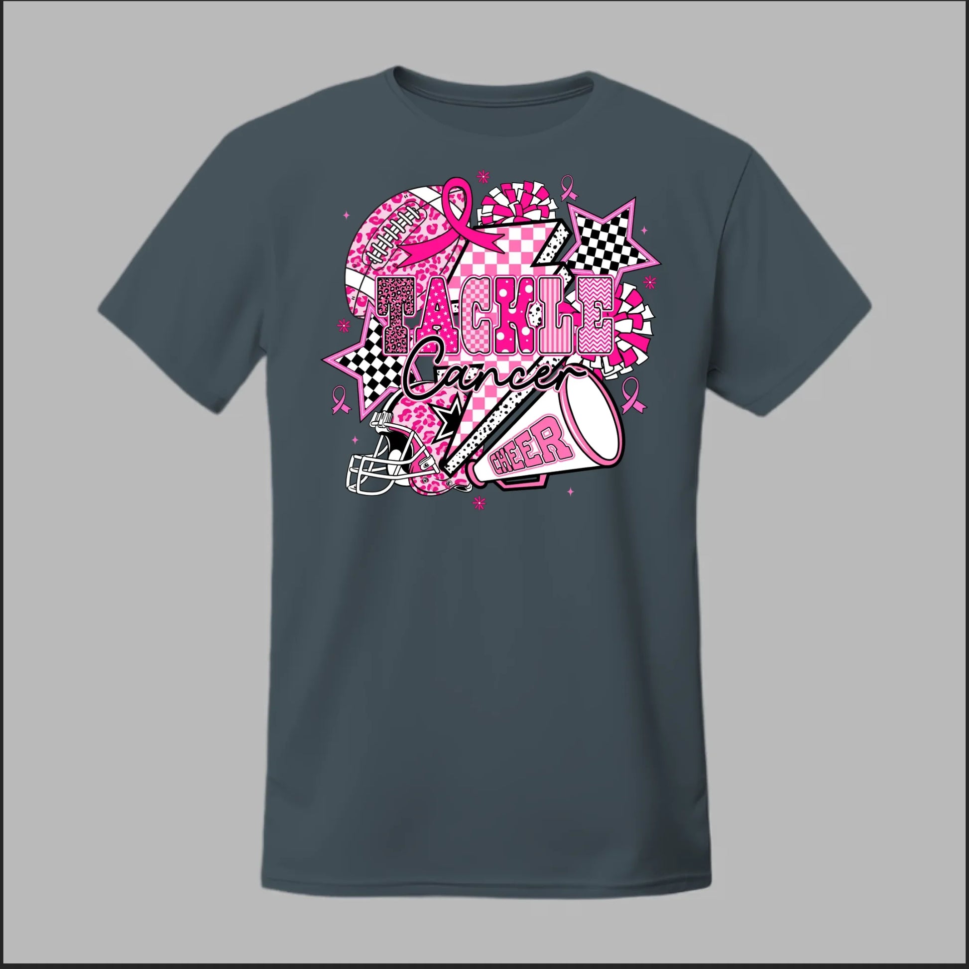 Show your spirit and strength with the Trendy Tackle Cancer tee. Featuring bold patterns, a football, pom-poms, and a megaphone, this design is perfect for athletes, cheerleaders, and fans rallying behind Breast Cancer Awareness.