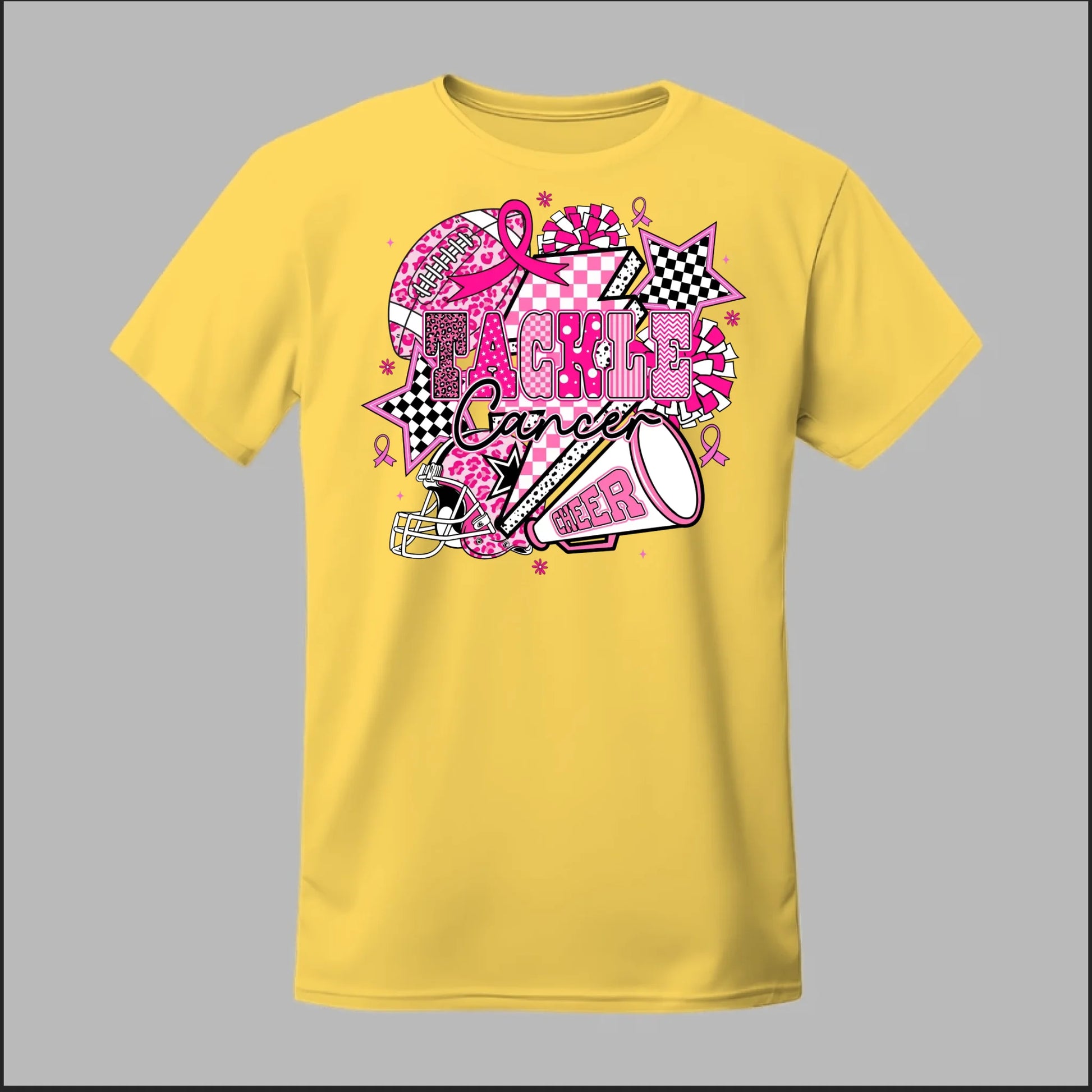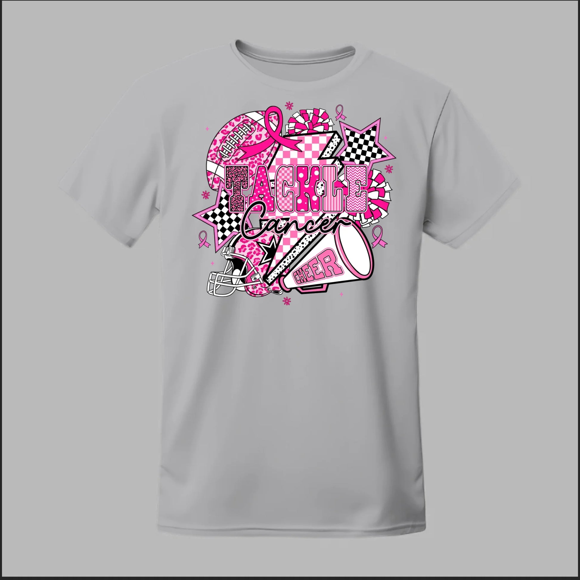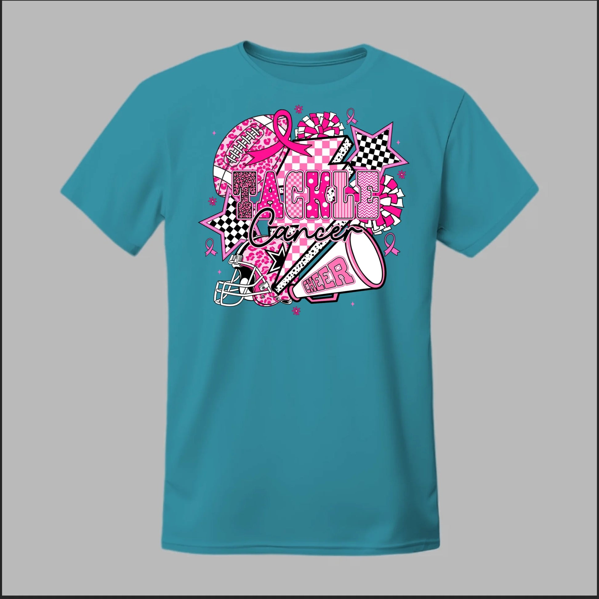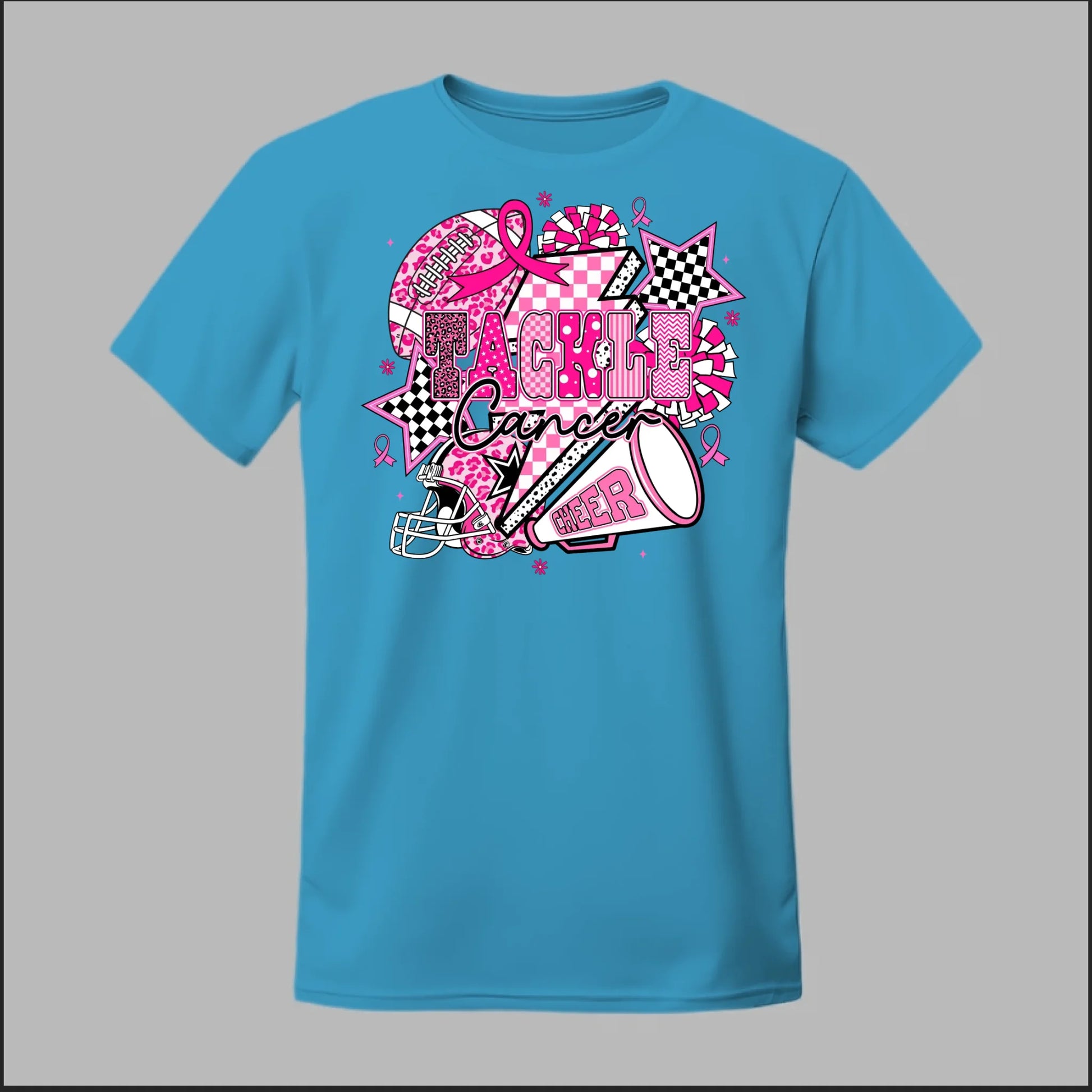 Show your spirit and strength with the Trendy Tackle Cancer tee. Featuring bold patterns, a football, pom-poms, and a megaphone, this design is perfect for athletes, cheerleaders, and fans rallying behind Breast Cancer Awareness.