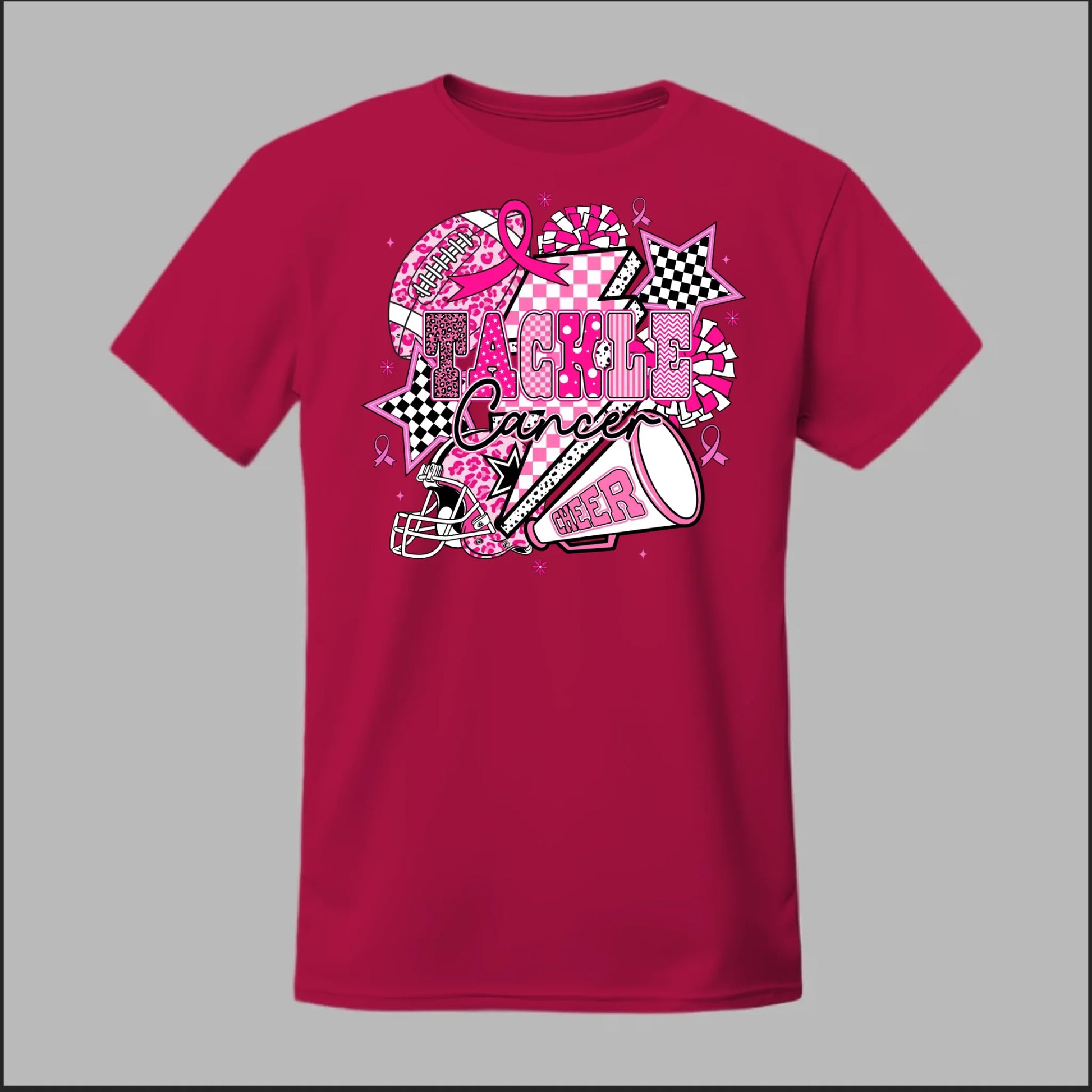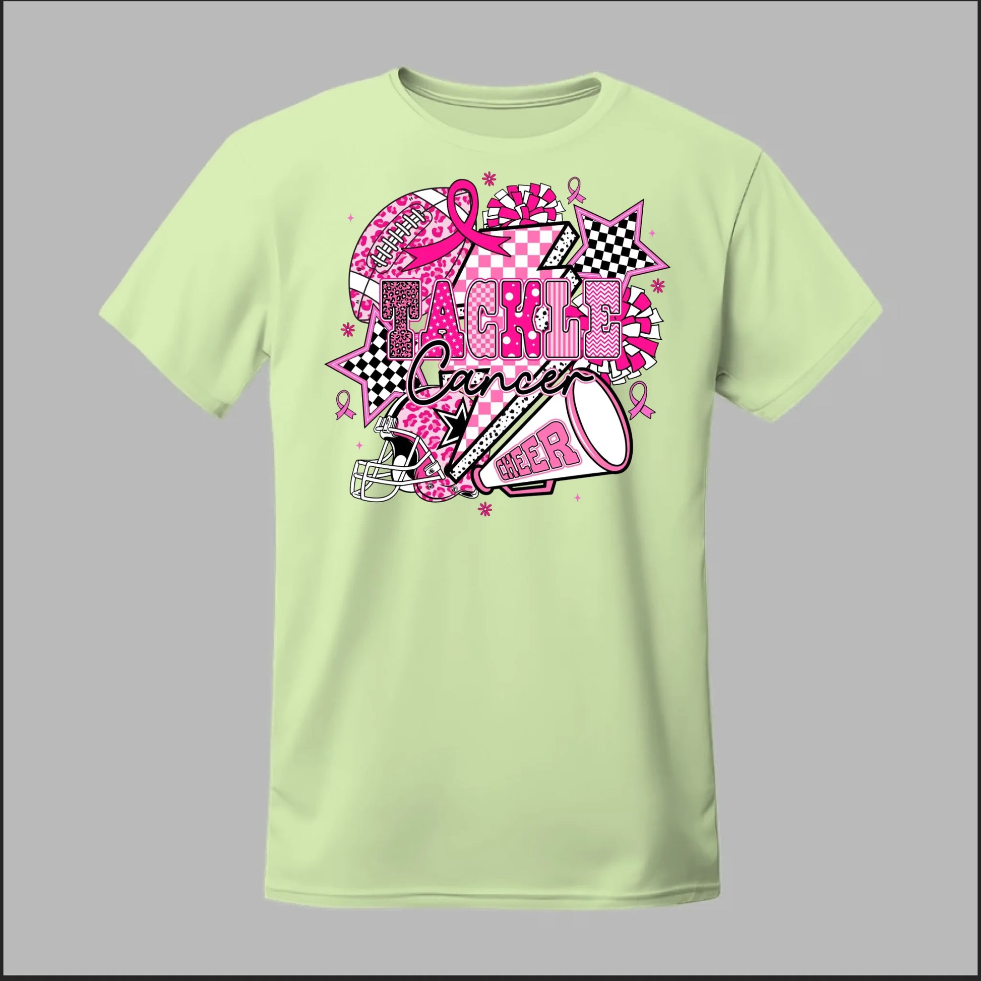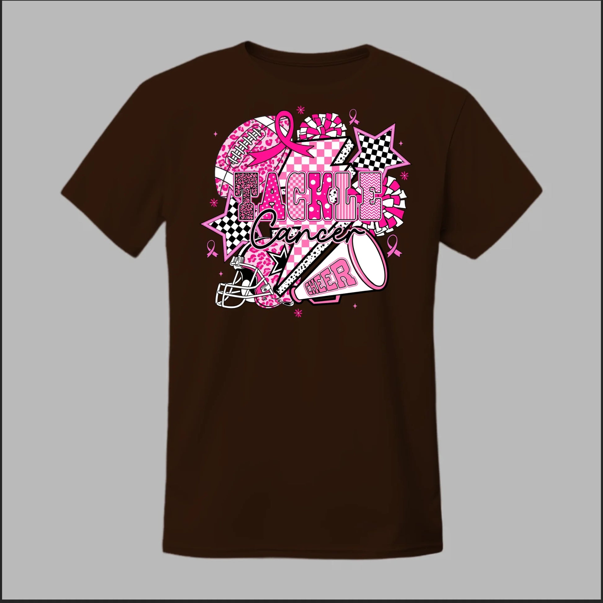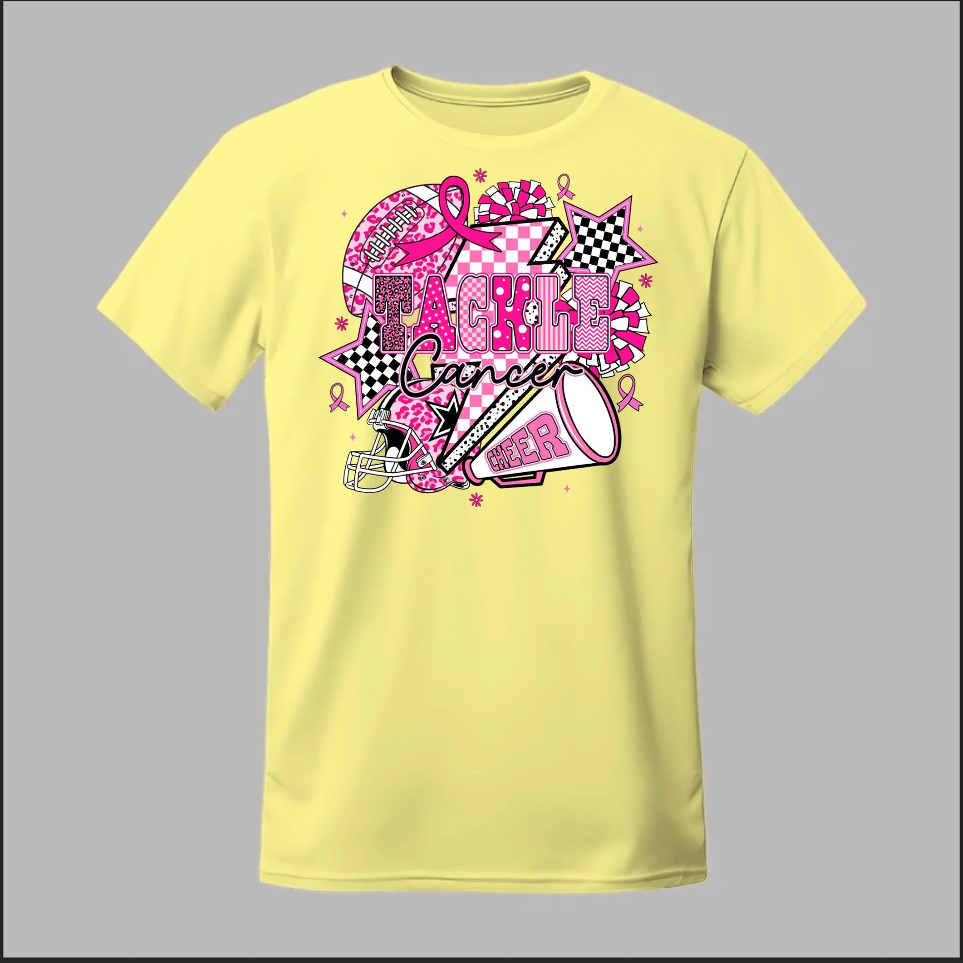Show your spirit and strength with the Trendy Tackle Cancer tee. Featuring bold patterns, a football, pom-poms, and a megaphone, this design is perfect for athletes, cheerleaders, and fans rallying behind Breast Cancer Awareness.