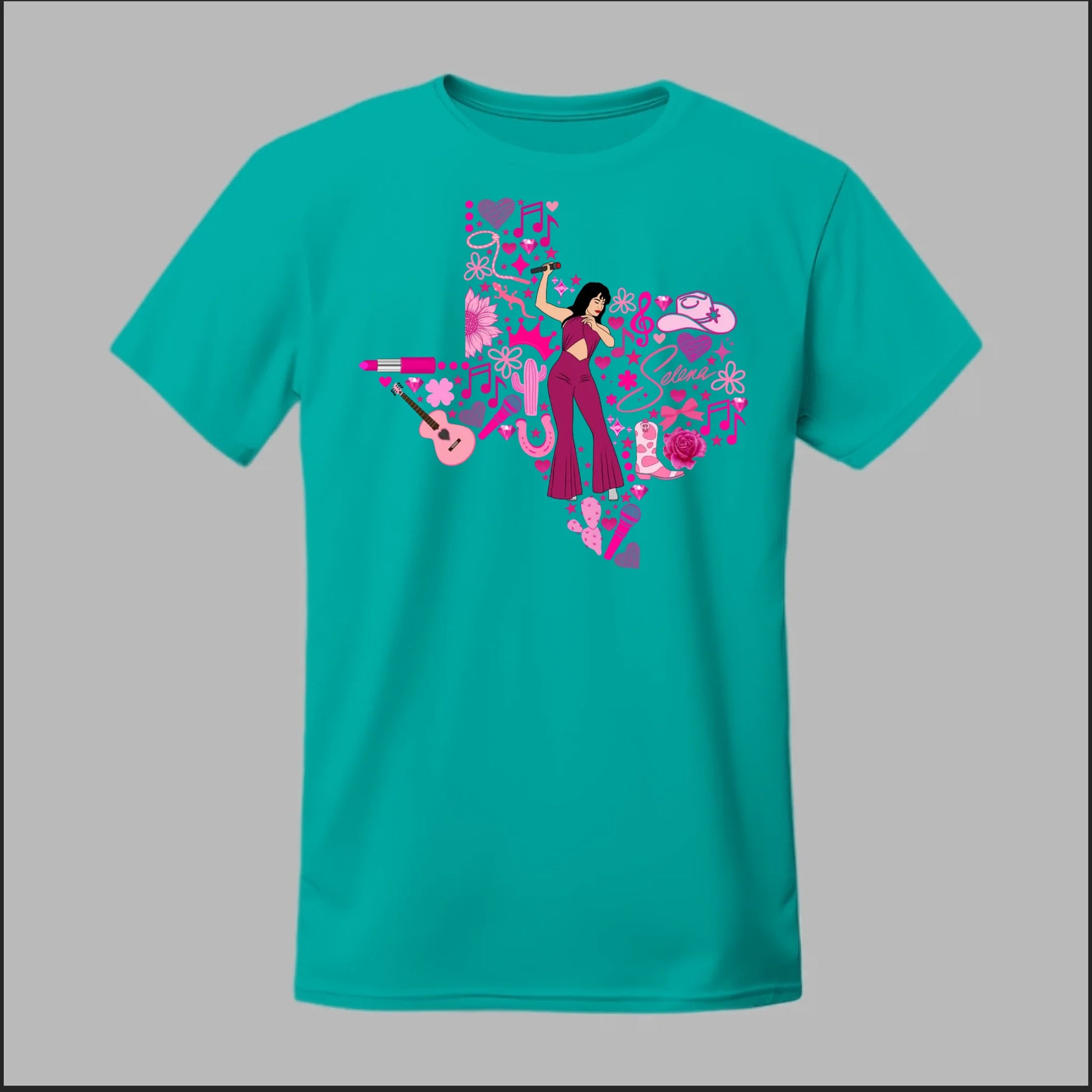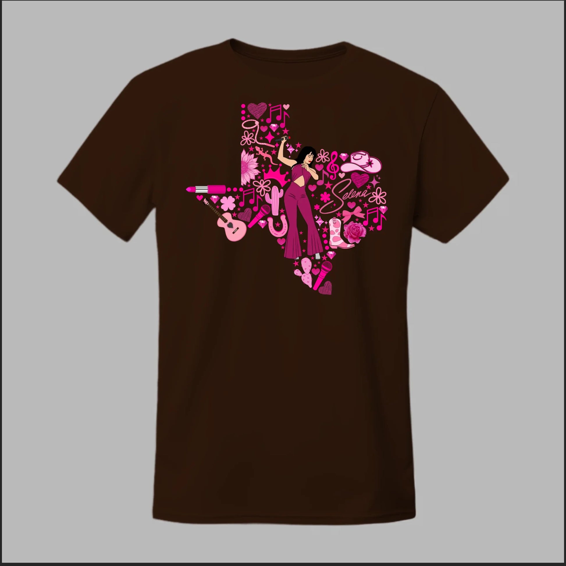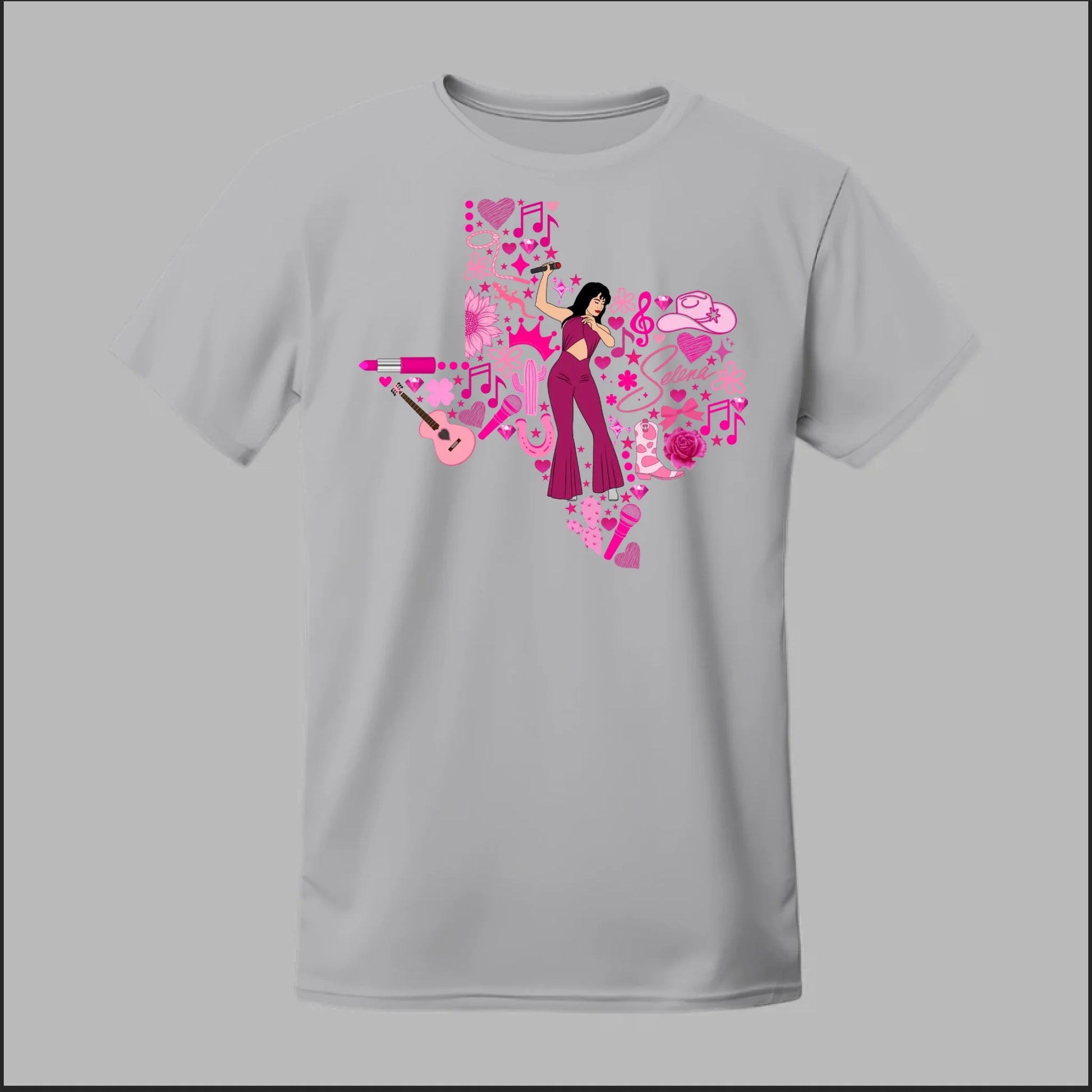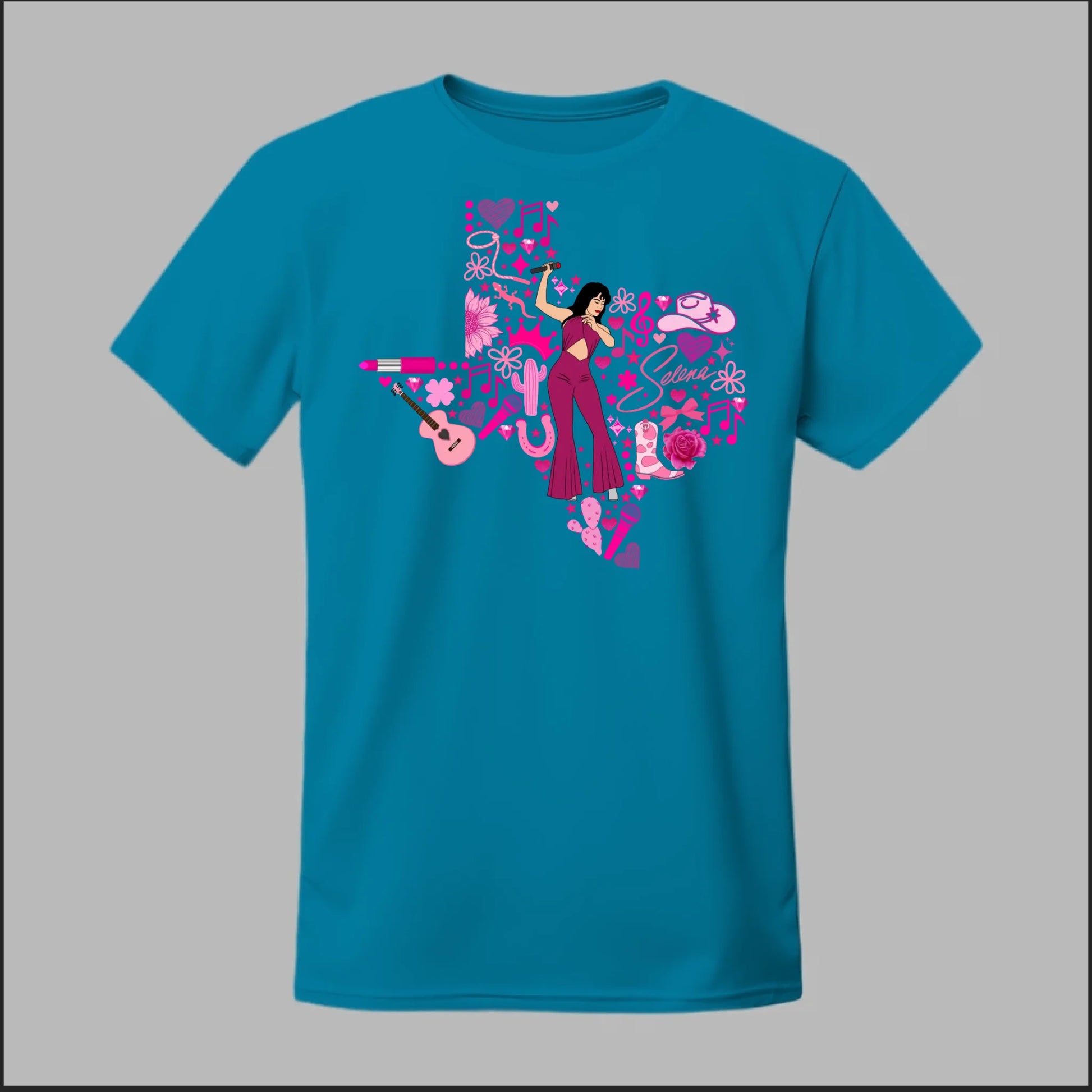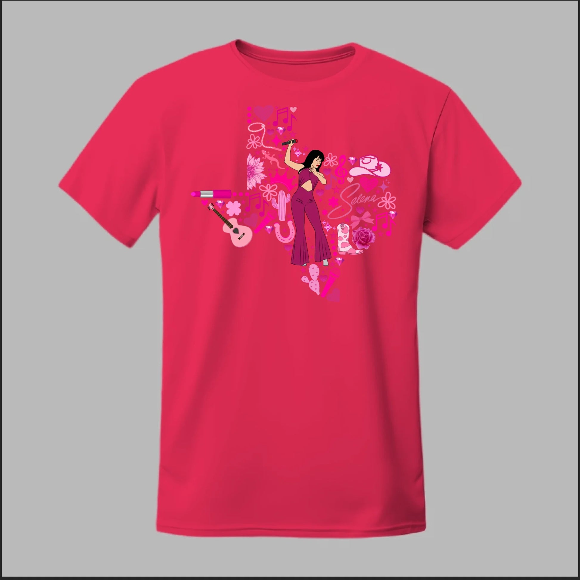 Celebrate the Queen of Tejano with this bold Texas Rose Selena Tribute Tee! 🌟 The design features a radiant Selena in her iconic purple jumpsuit, set inside the outline of Texas and surrounded by vibrant pink accents—music notes, guitars, cowboy boots, lipstick, and roses. This shirt is more than just apparel—it’s a tribute to Texas pride, Tejano culture, and Selena’s unforgettable legacy. Perfect for concerts, festivals, or everyday wear, this tee lets you honor her spirit in style.