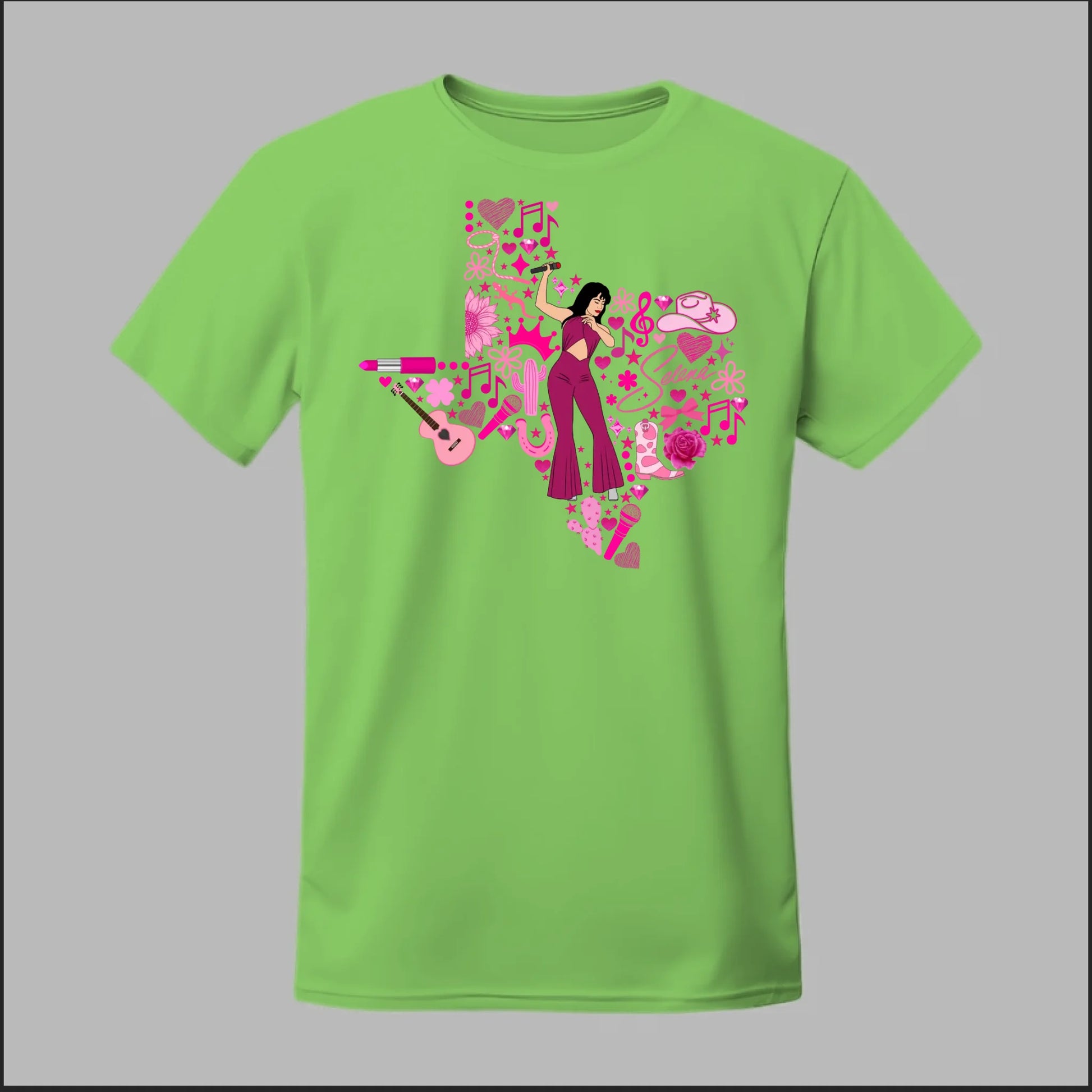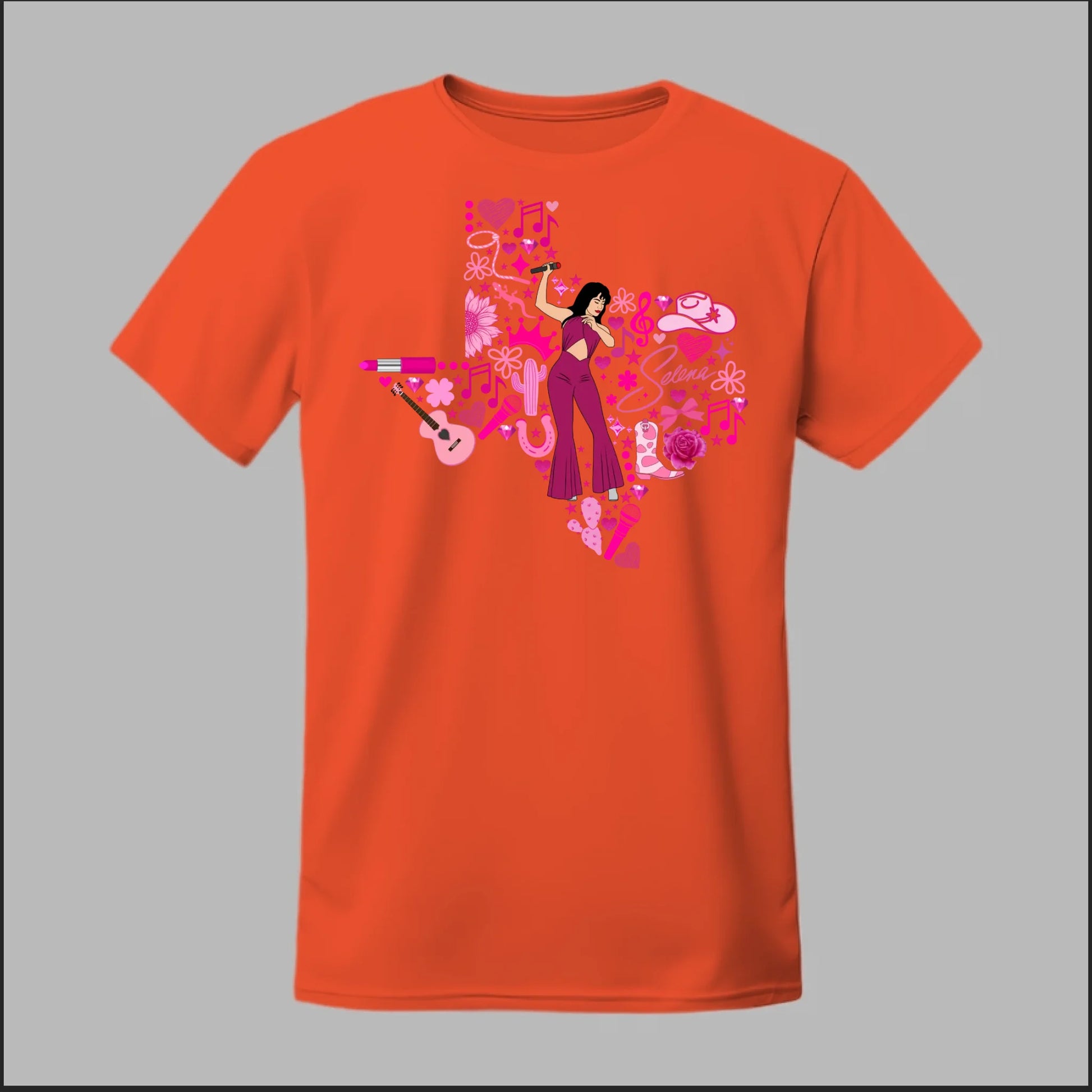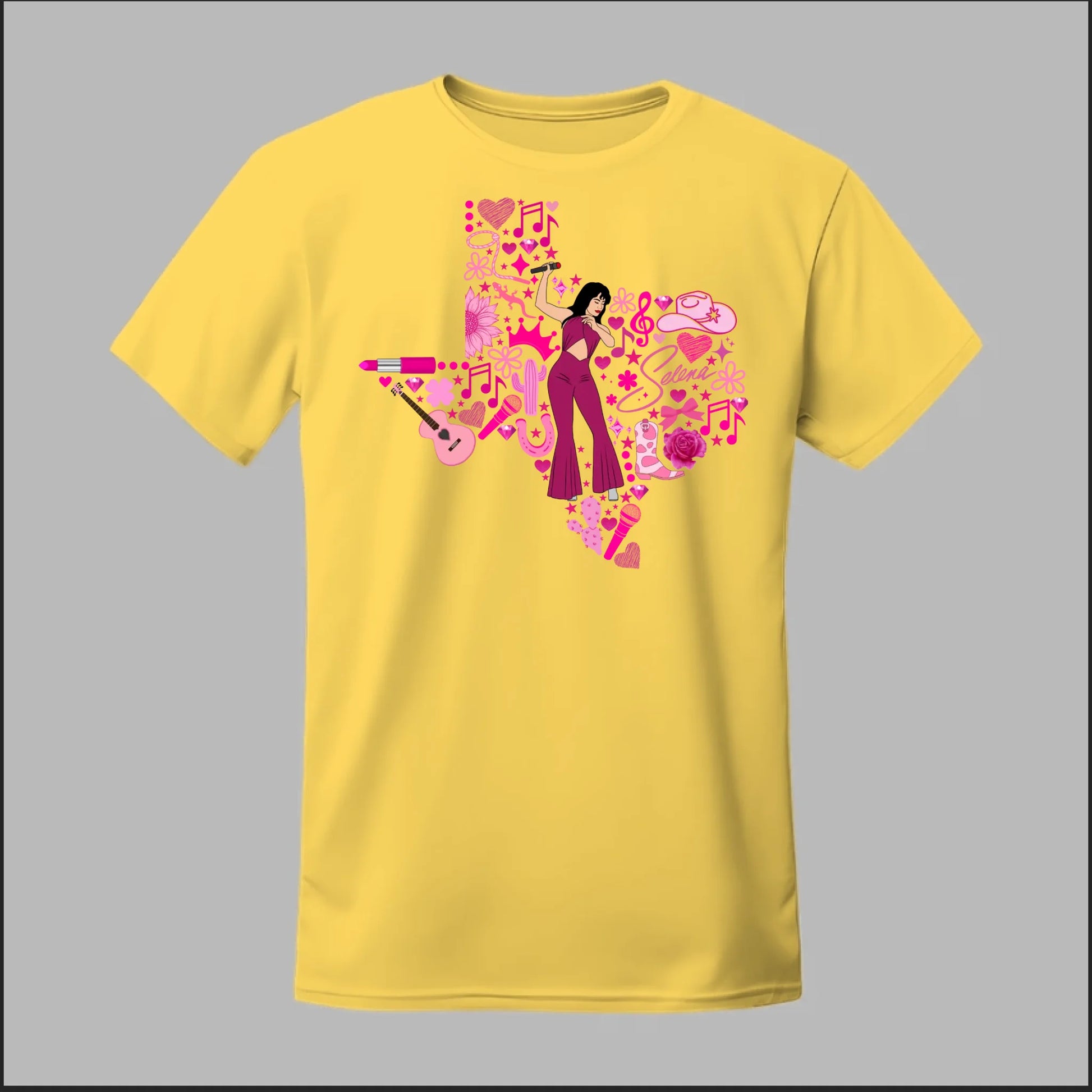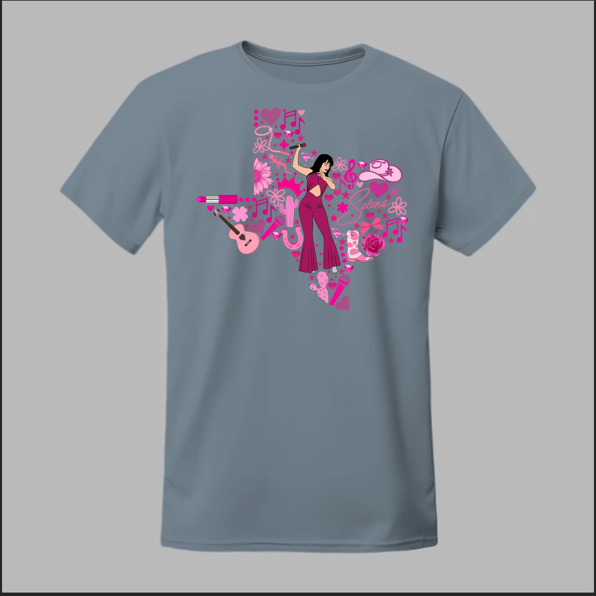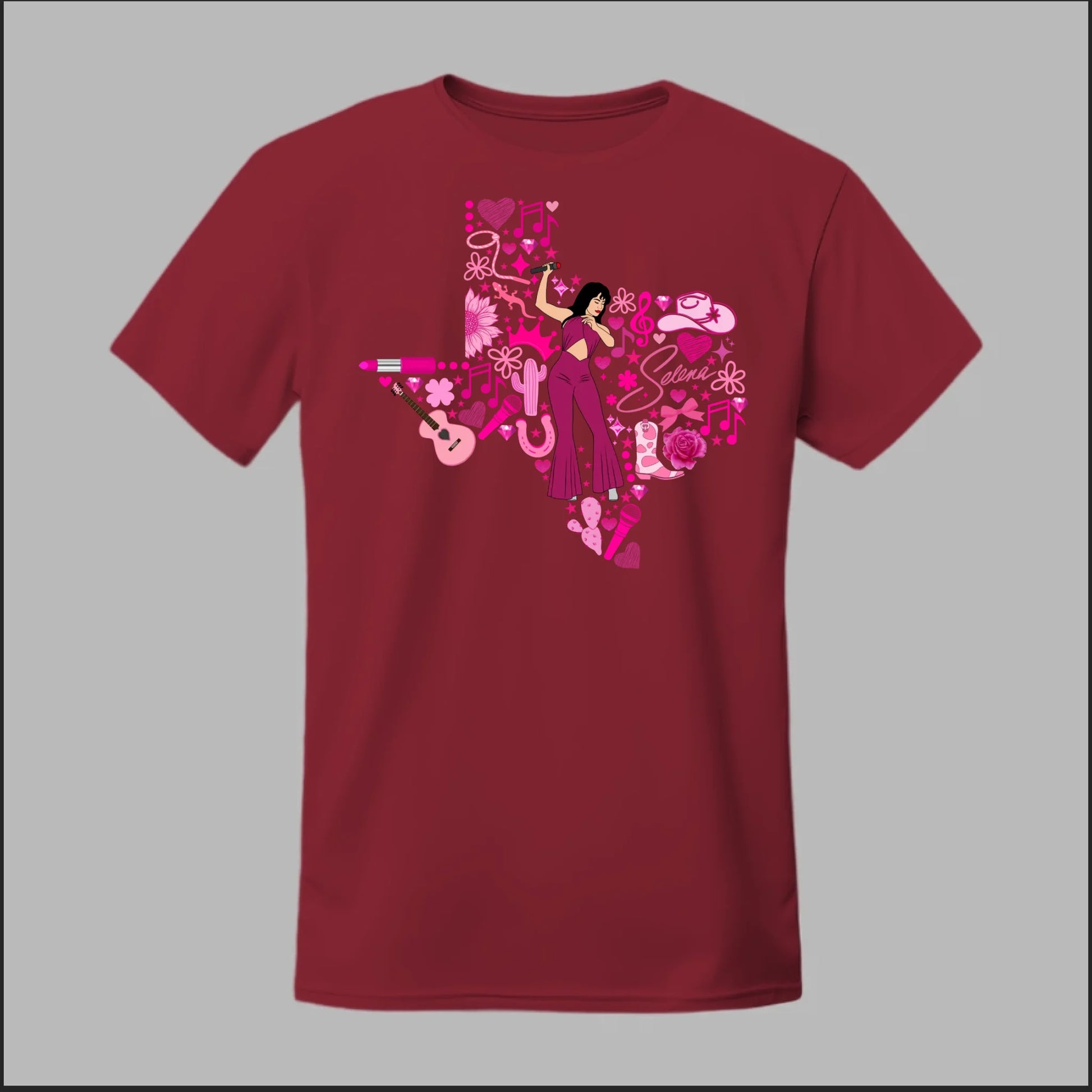 Celebrate the Queen of Tejano with this bold Texas Rose Selena Tribute Tee! 🌟 The design features a radiant Selena in her iconic purple jumpsuit, set inside the outline of Texas and surrounded by vibrant pink accents—music notes, guitars, cowboy boots, lipstick, and roses. This shirt is more than just apparel—it’s a tribute to Texas pride, Tejano culture, and Selena’s unforgettable legacy. Perfect for concerts, festivals, or everyday wear, this tee lets you honor her spirit in style.