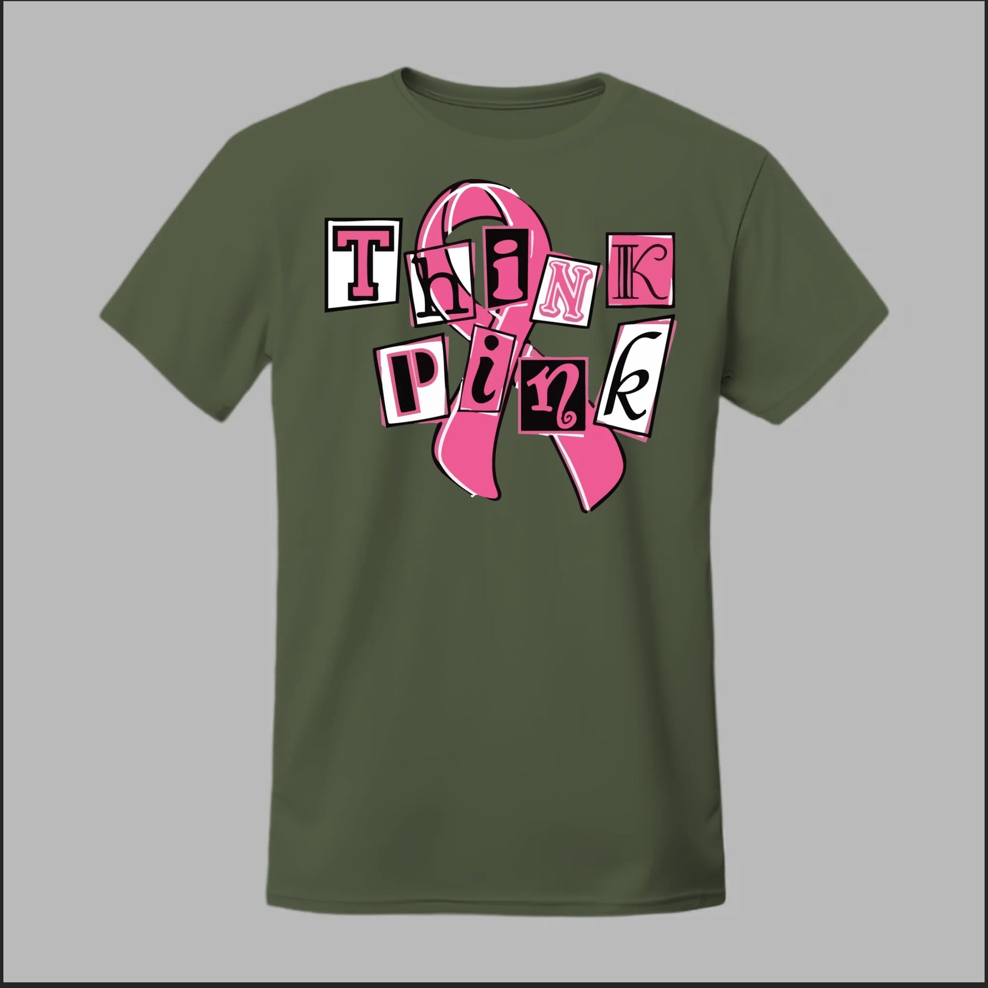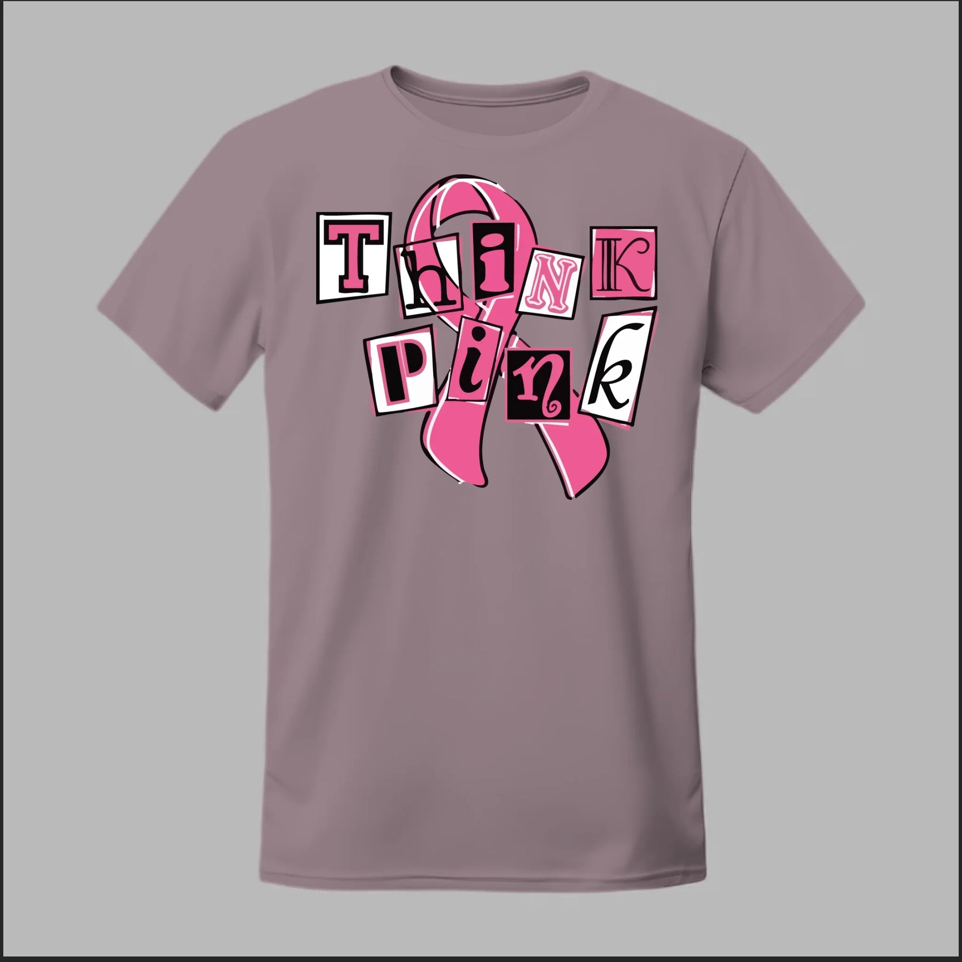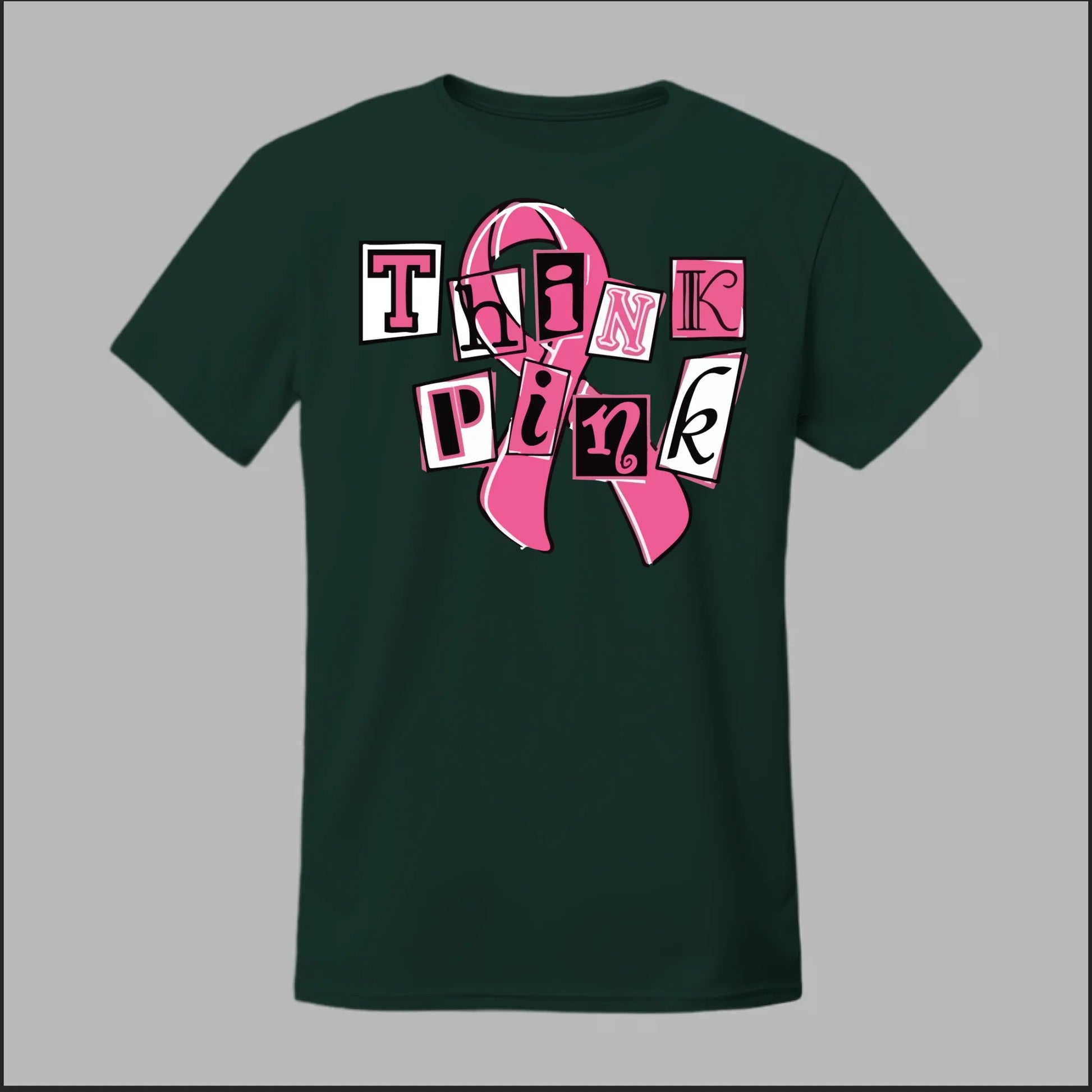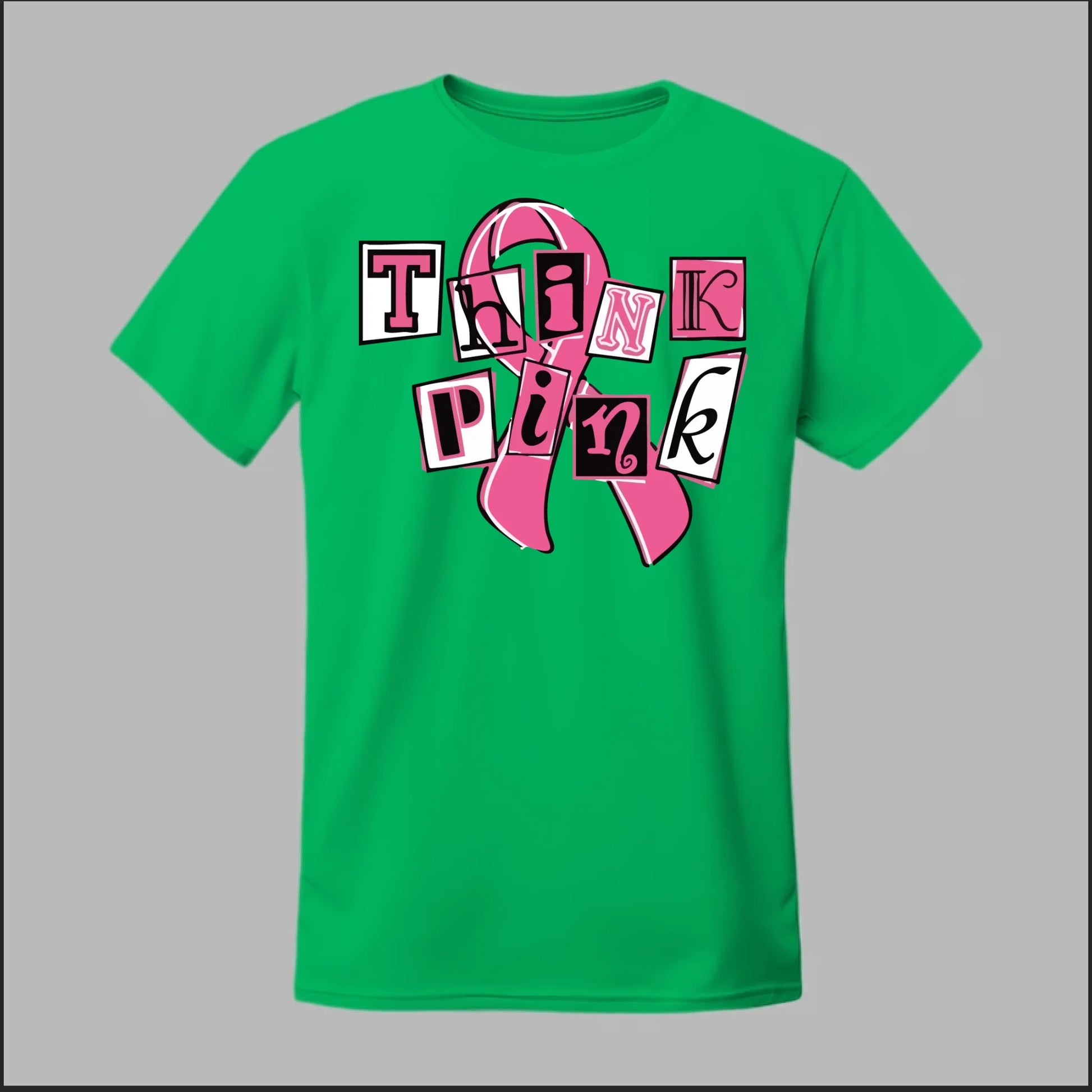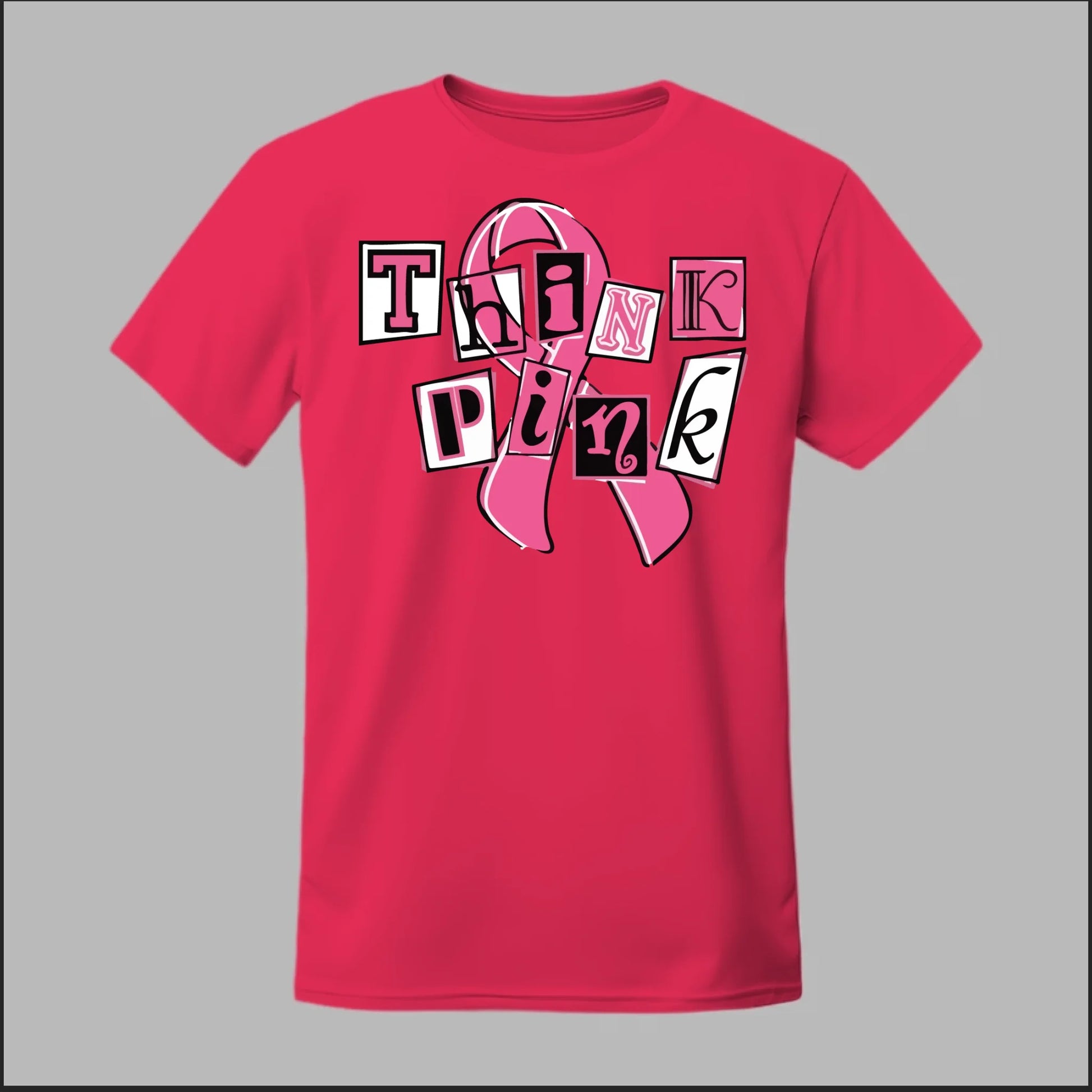 Make a statement of strength and solidarity with the Think Pink Tee. Featuring bold, collage-style lettering over a classic breast cancer ribbon, this shirt is designed to grab attention while spreading awareness. Perfect for Breast Cancer Awareness Month, walks, fundraisers, or everyday wear, it’s a fun yet powerful way to show your support.