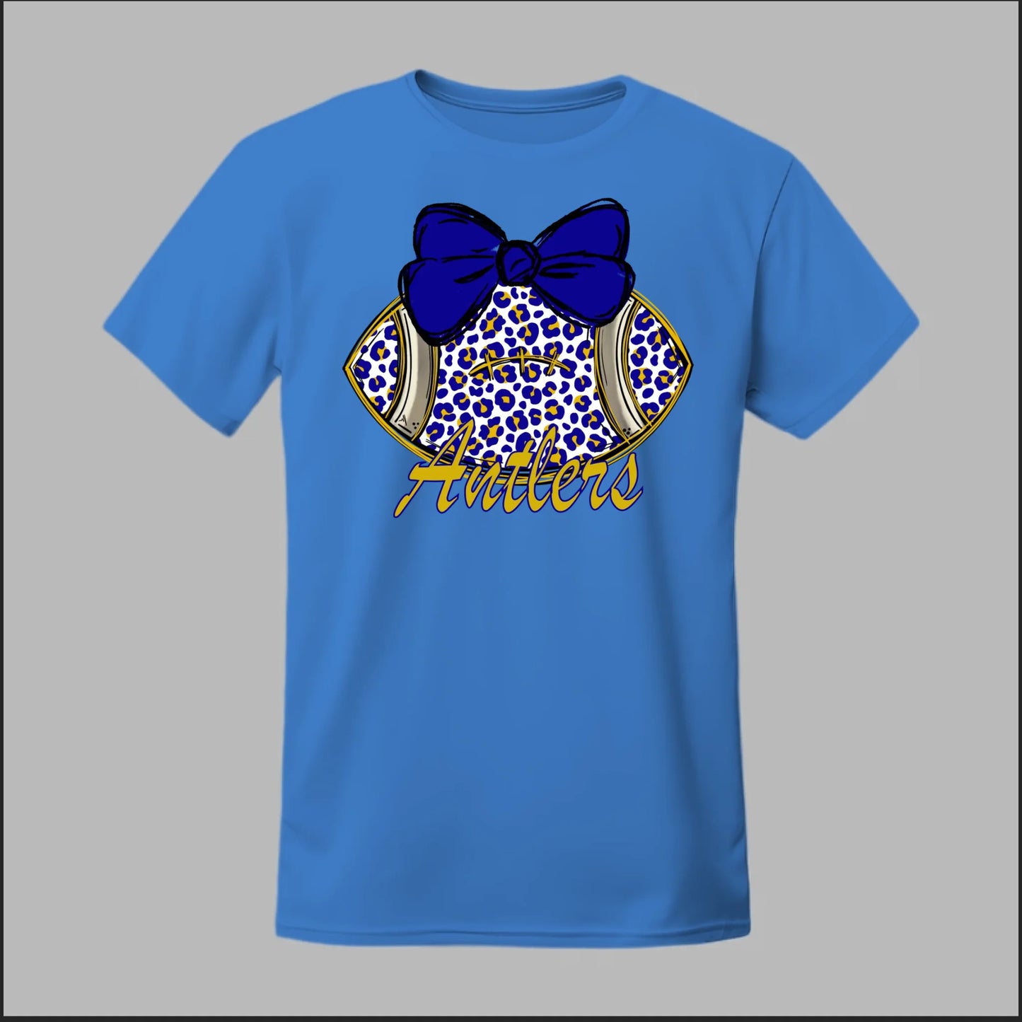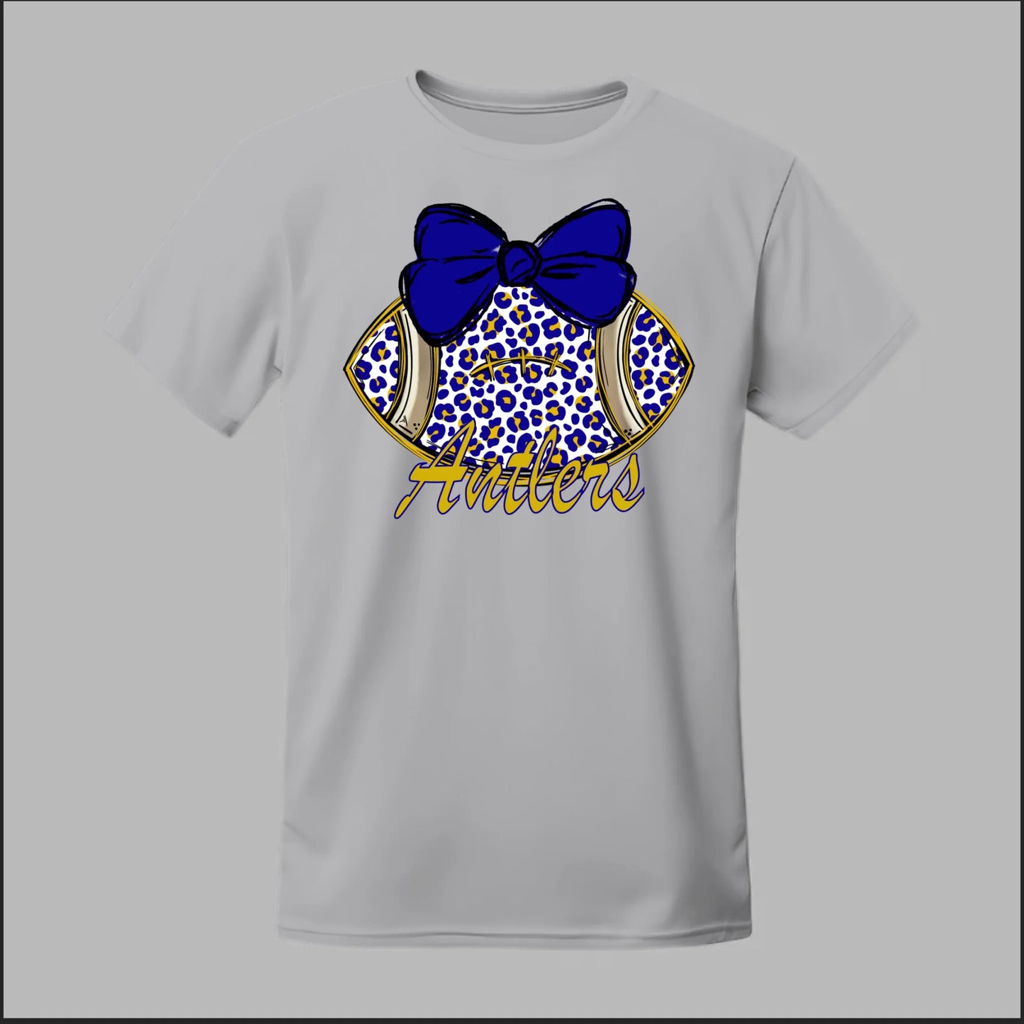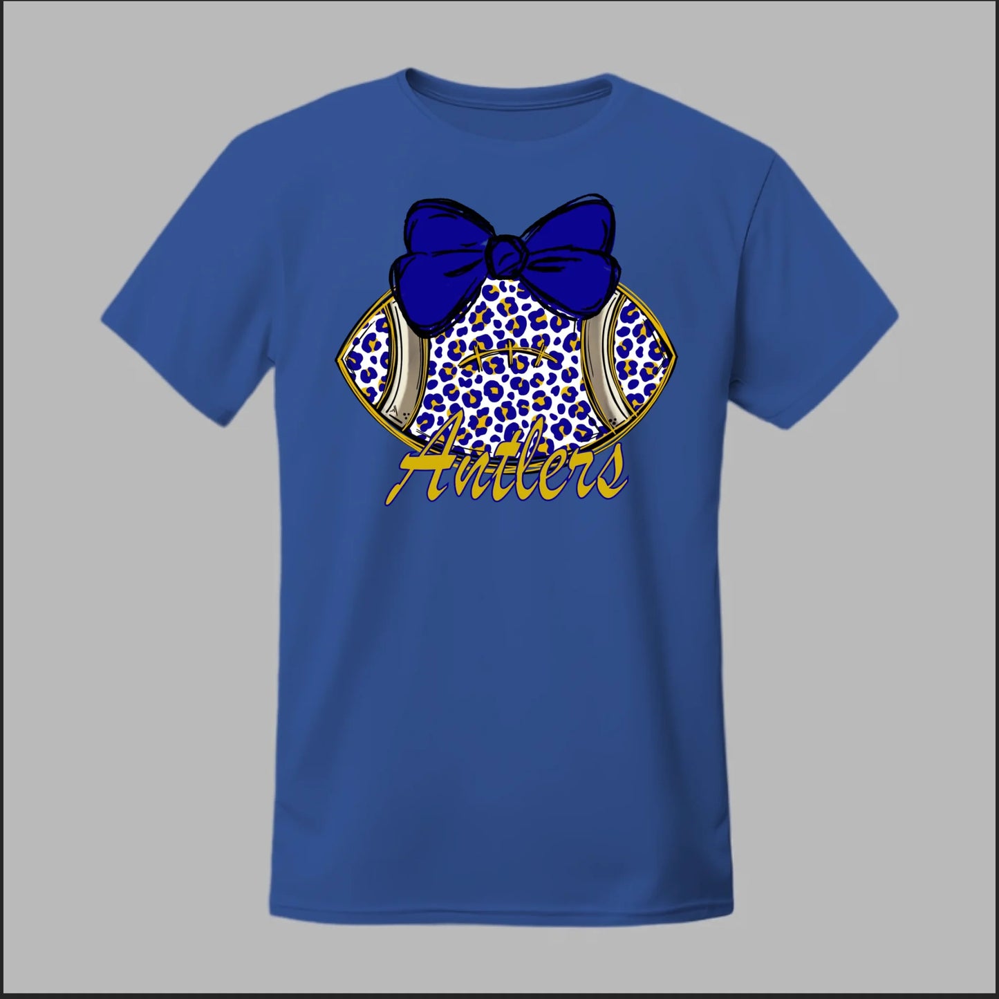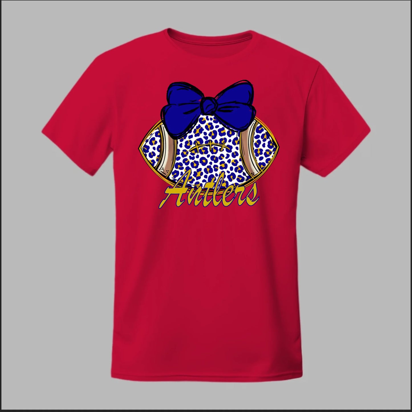 Bring the perfect mix of fierce and fun to game day with this Antlers Leopard Bow Football tee! Featuring a bold leopard print football topped with a standout blue bow and classic Antlers script, this shirt is the ultimate show of school spirit. Designed for comfort and style, it’s perfect for cheering from the stands, pep rallies, or everyday wear to show your pride.