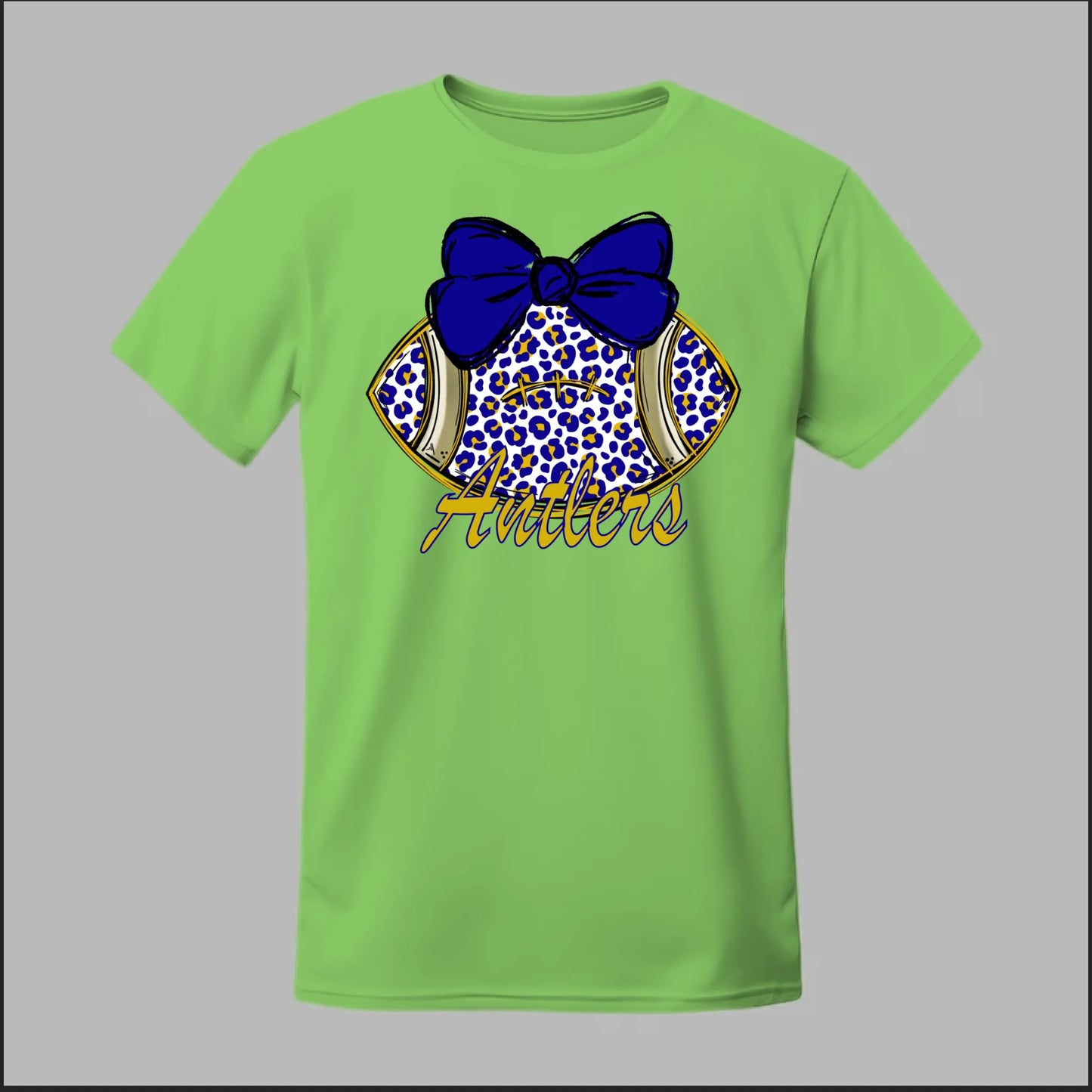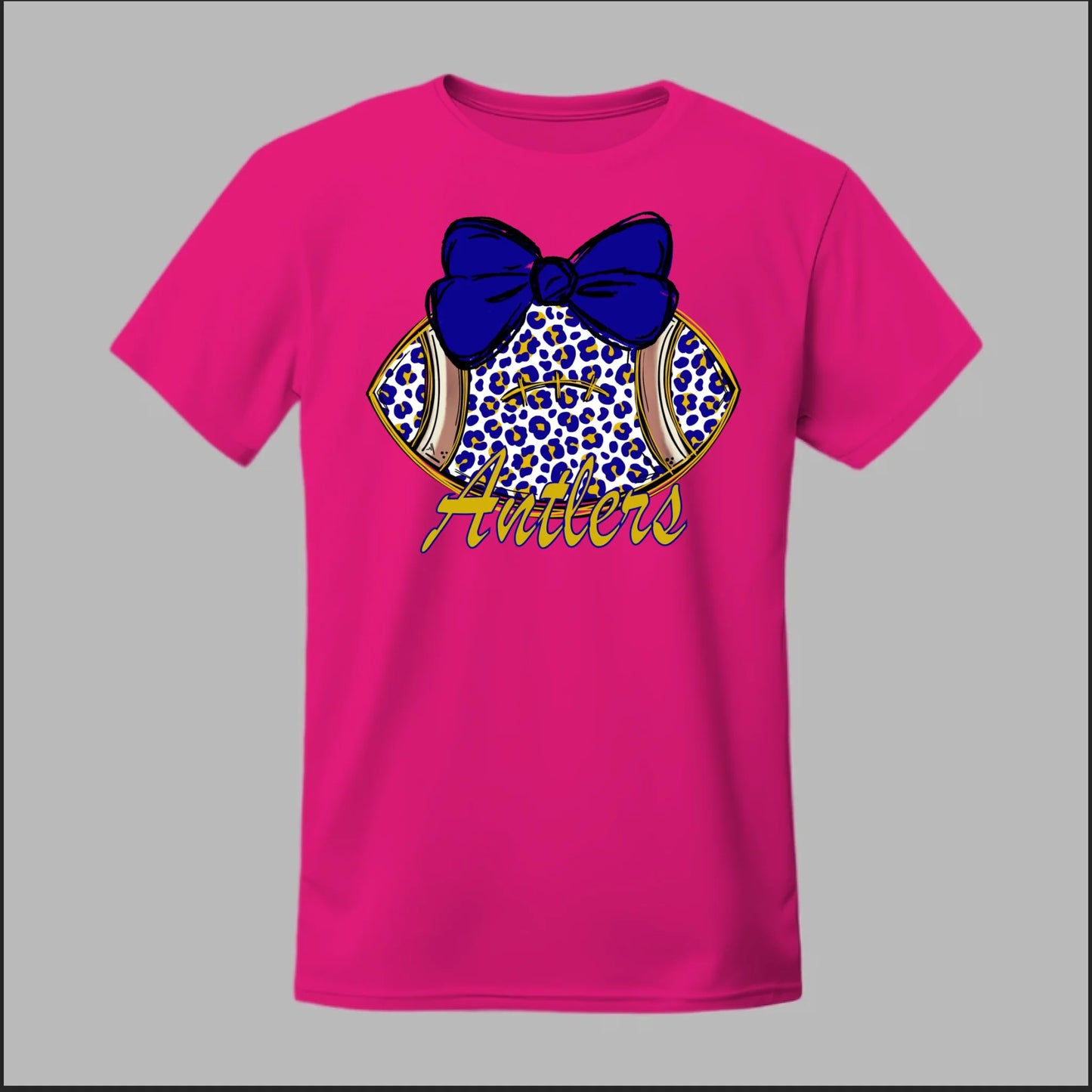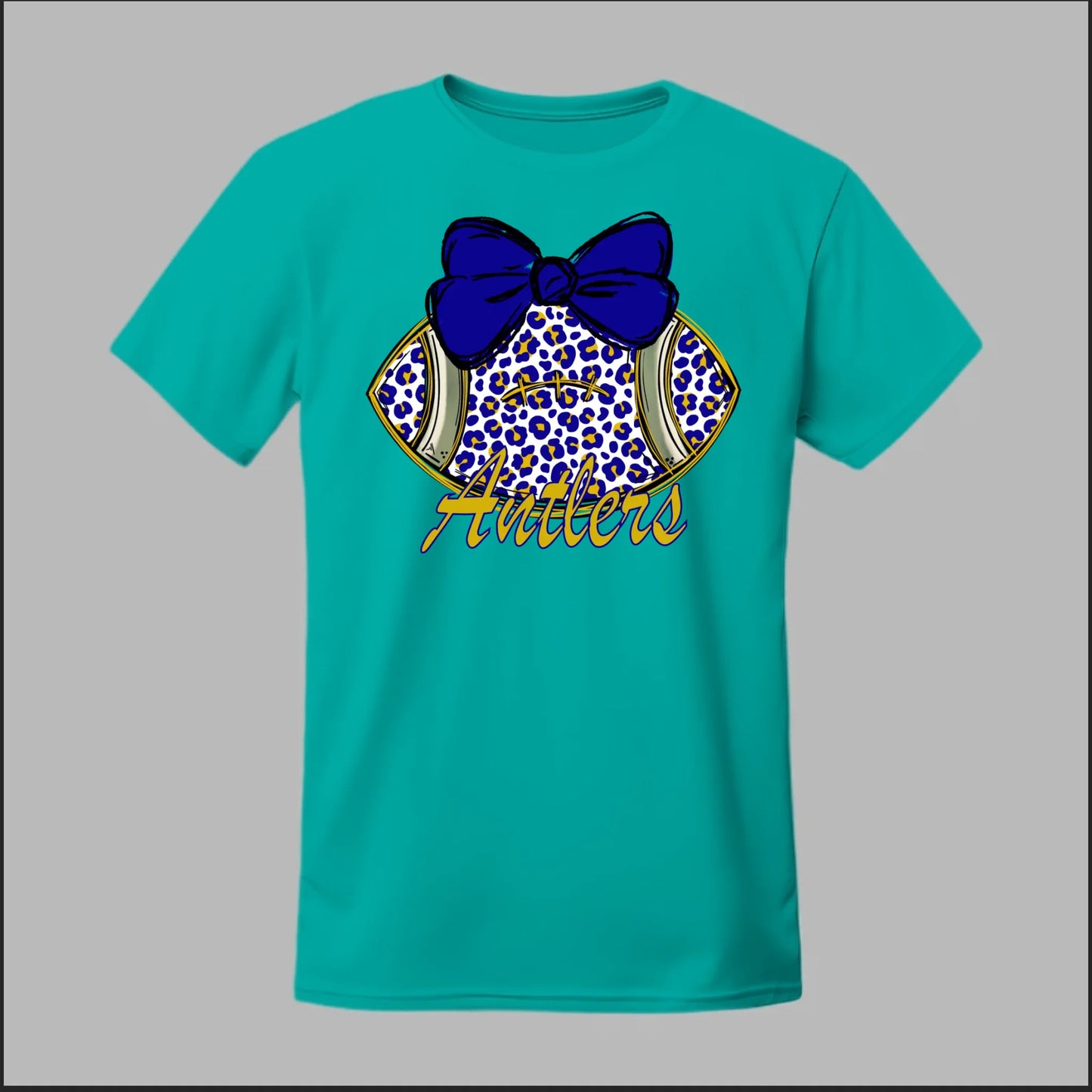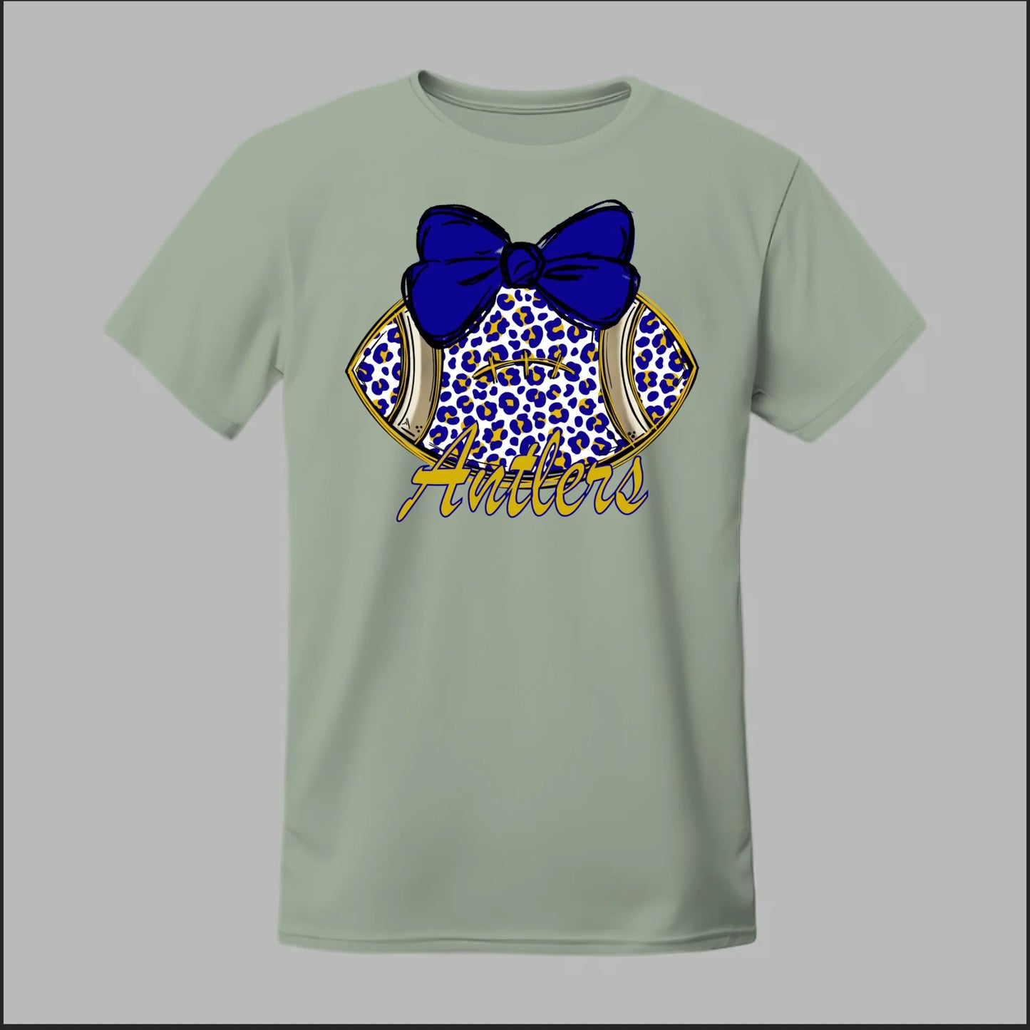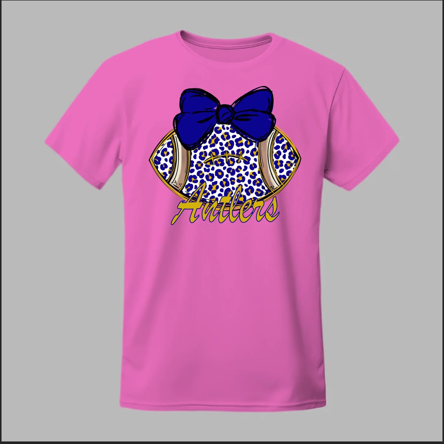 Bring the perfect mix of fierce and fun to game day with this Antlers Leopard Bow Football tee! Featuring a bold leopard print football topped with a standout blue bow and classic Antlers script, this shirt is the ultimate show of school spirit. Designed for comfort and style, it’s perfect for cheering from the stands, pep rallies, or everyday wear to show your pride.