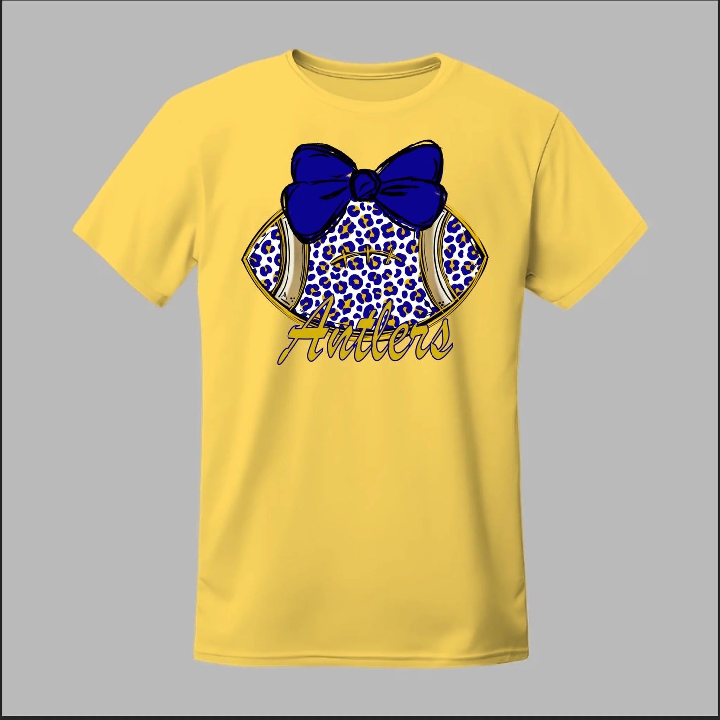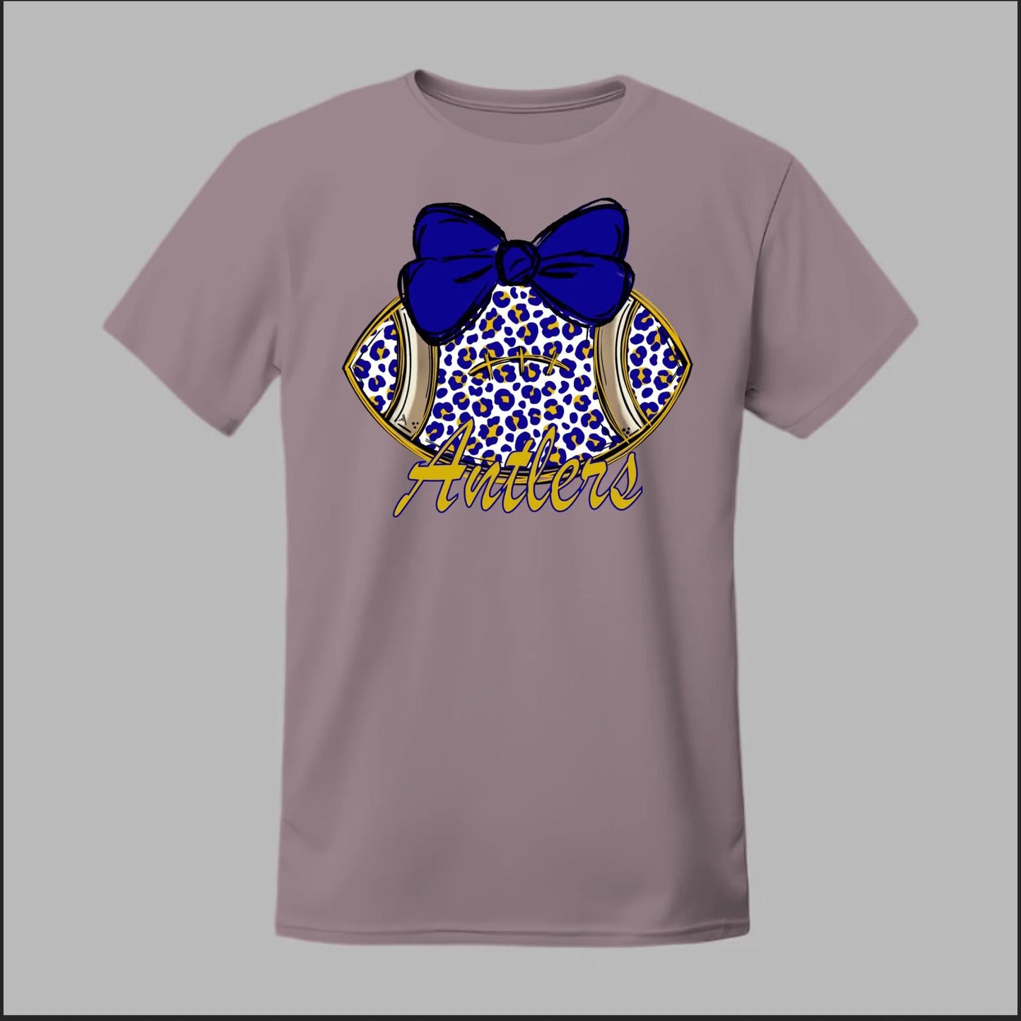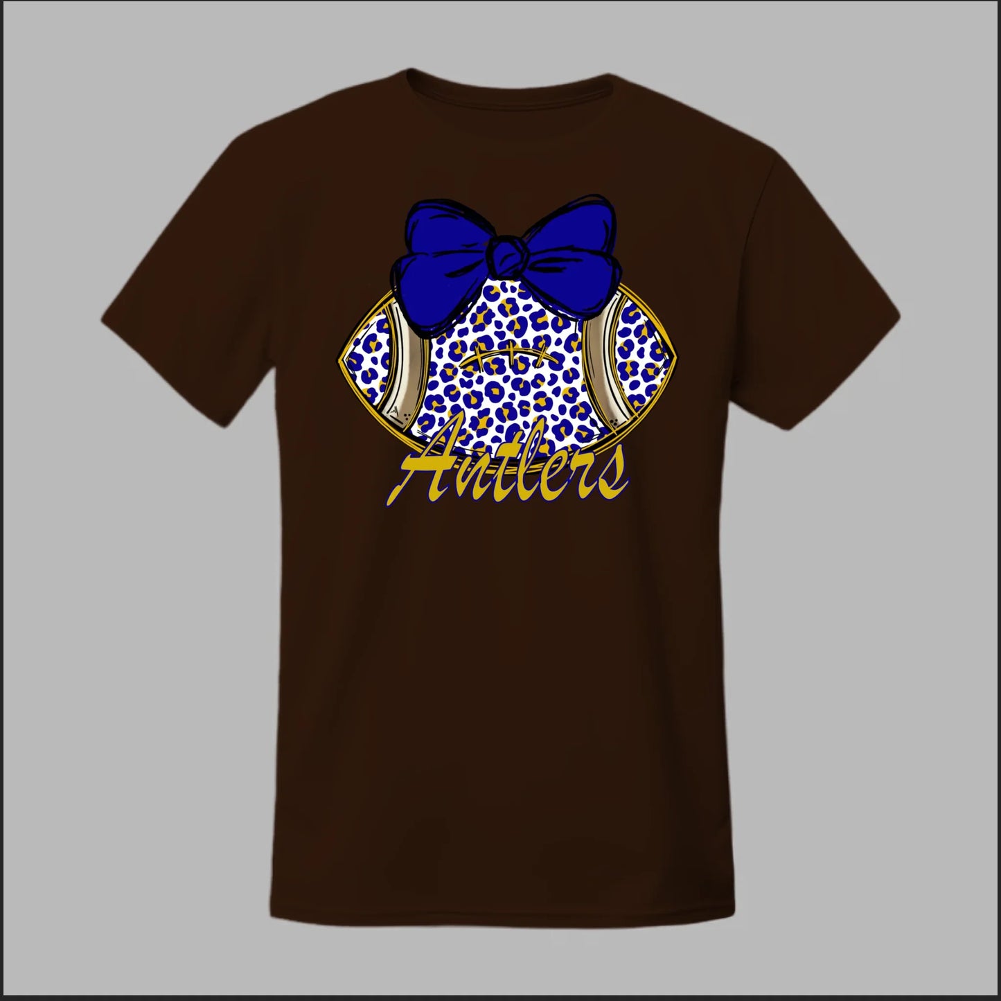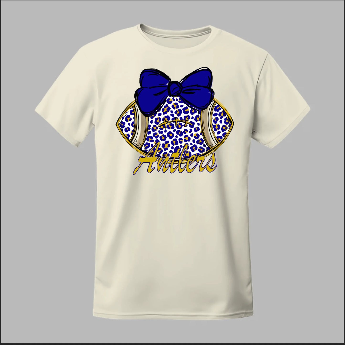 Bring the perfect mix of fierce and fun to game day with this Antlers Leopard Bow Football tee! Featuring a bold leopard print football topped with a standout blue bow and classic Antlers script, this shirt is the ultimate show of school spirit. Designed for comfort and style, it’s perfect for cheering from the stands, pep rallies, or everyday wear to show your pride.