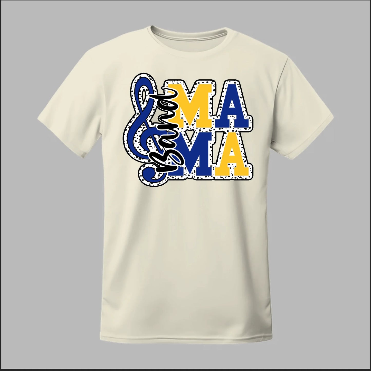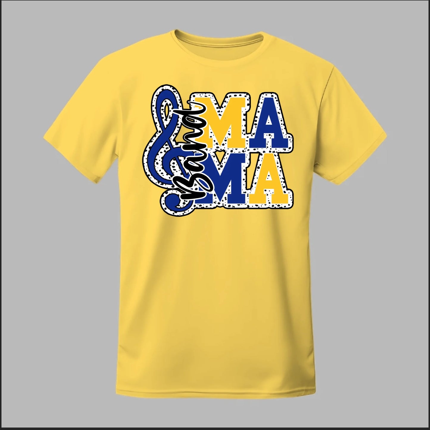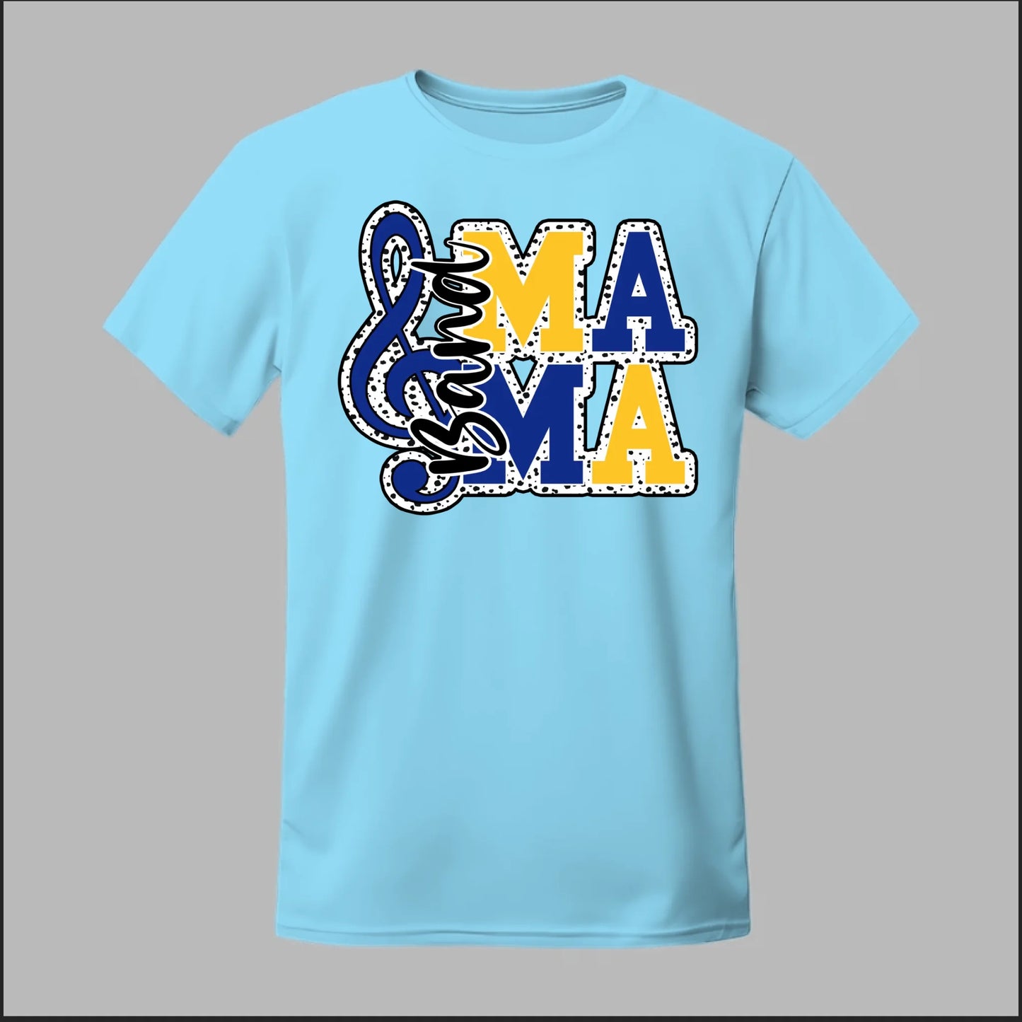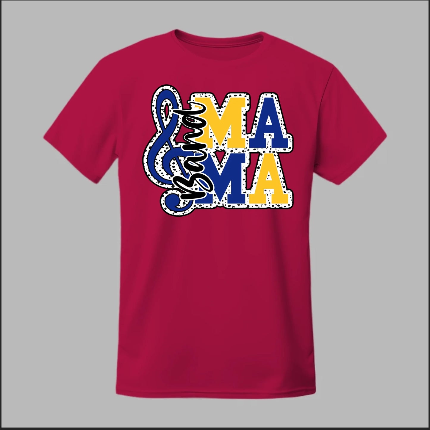 Show your pride loud and clear with this bold Band Mama tee! Featuring a striking treble clef and standout block lettering in school colors, this design is perfect for every rehearsal, halftime show, and competition. Comfy, stylish, and full of spirit, it’s a must-have for moms who cheer the band on from the stands and beyond.