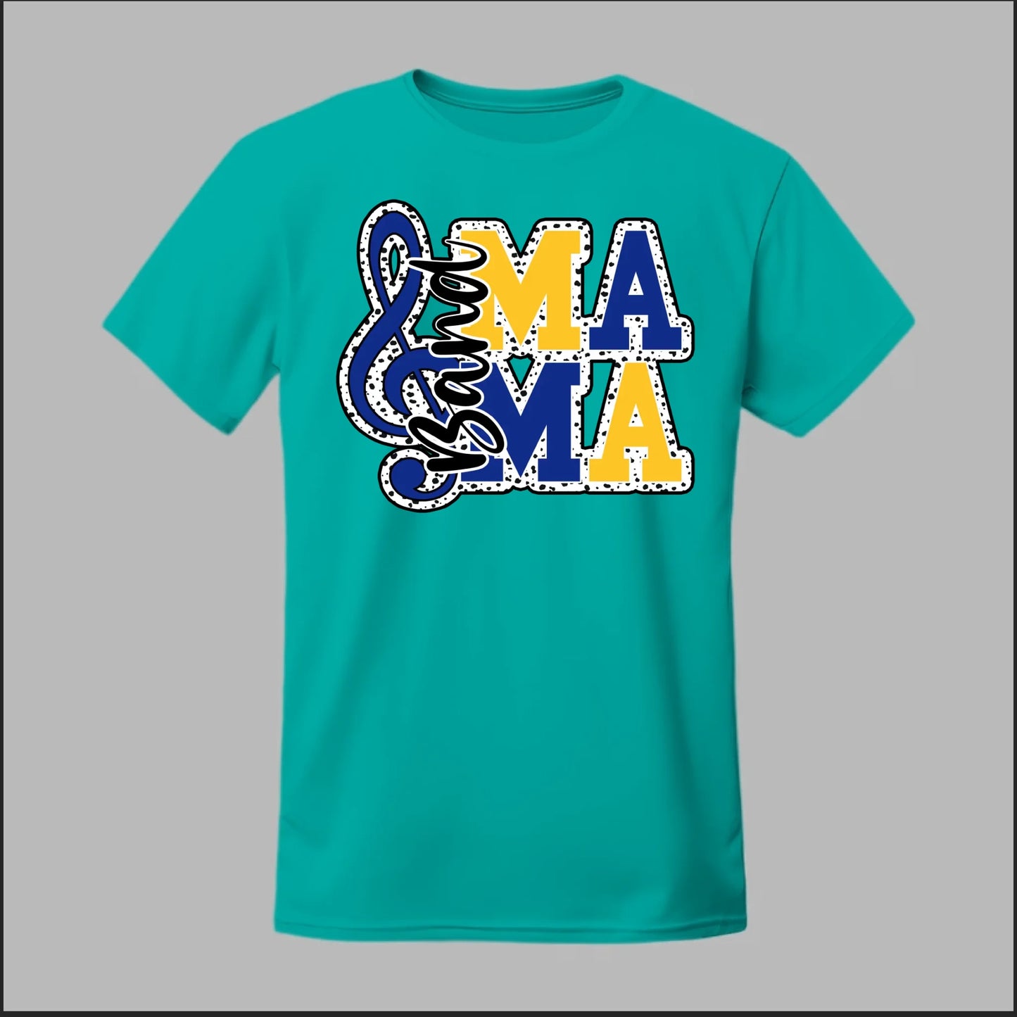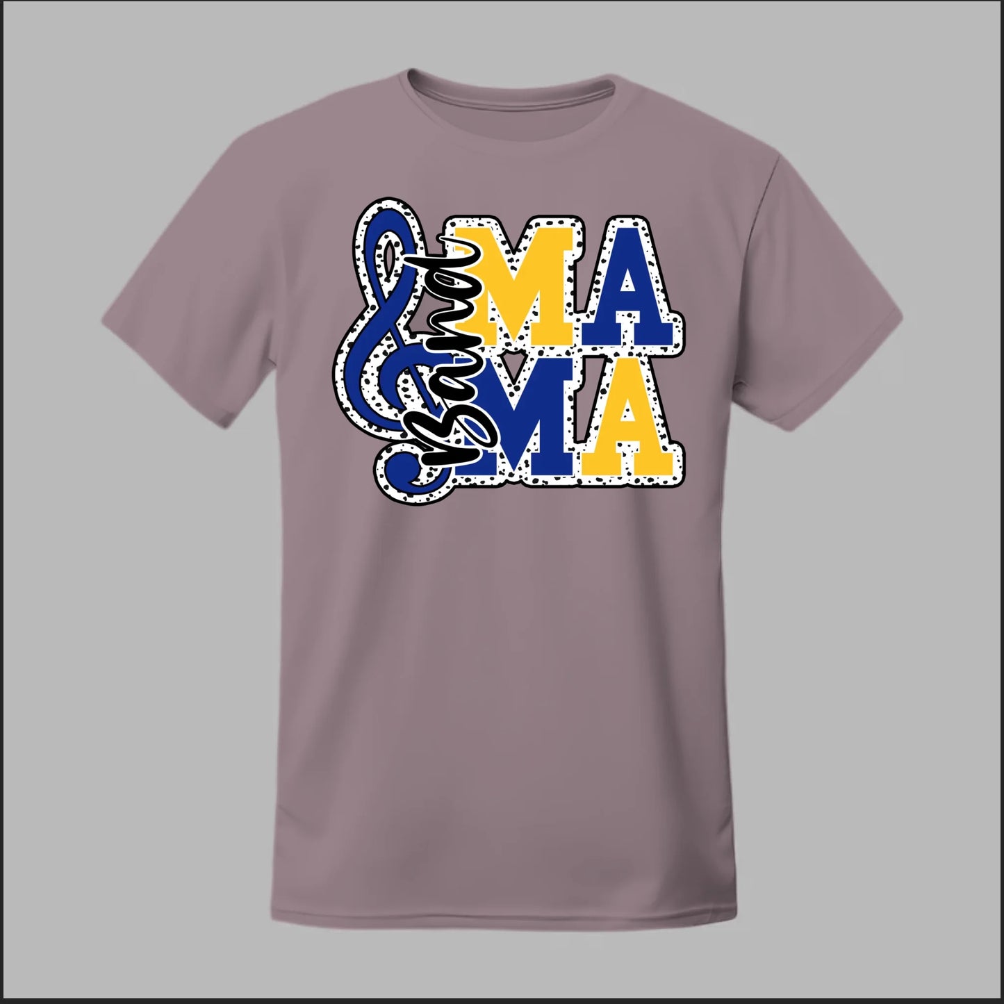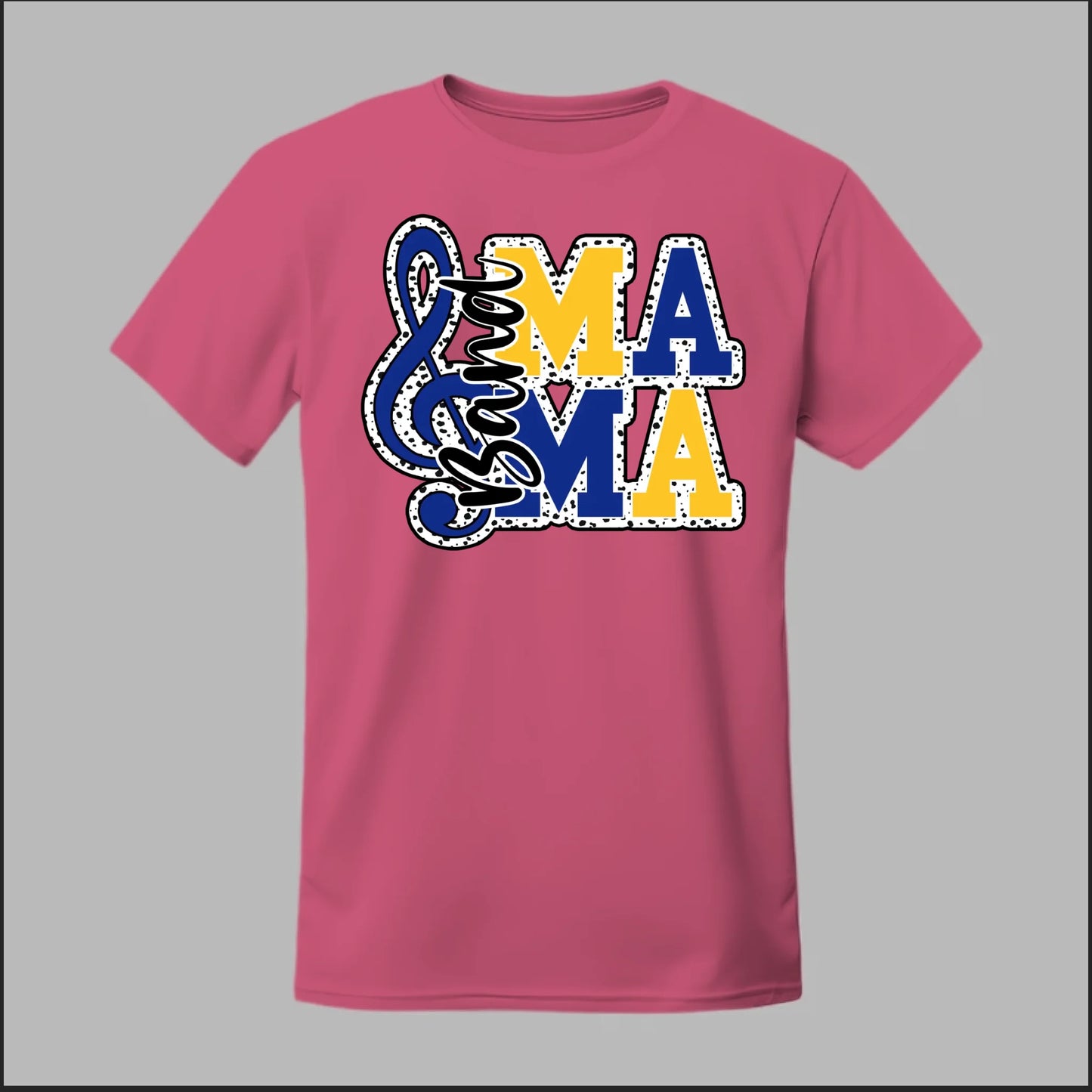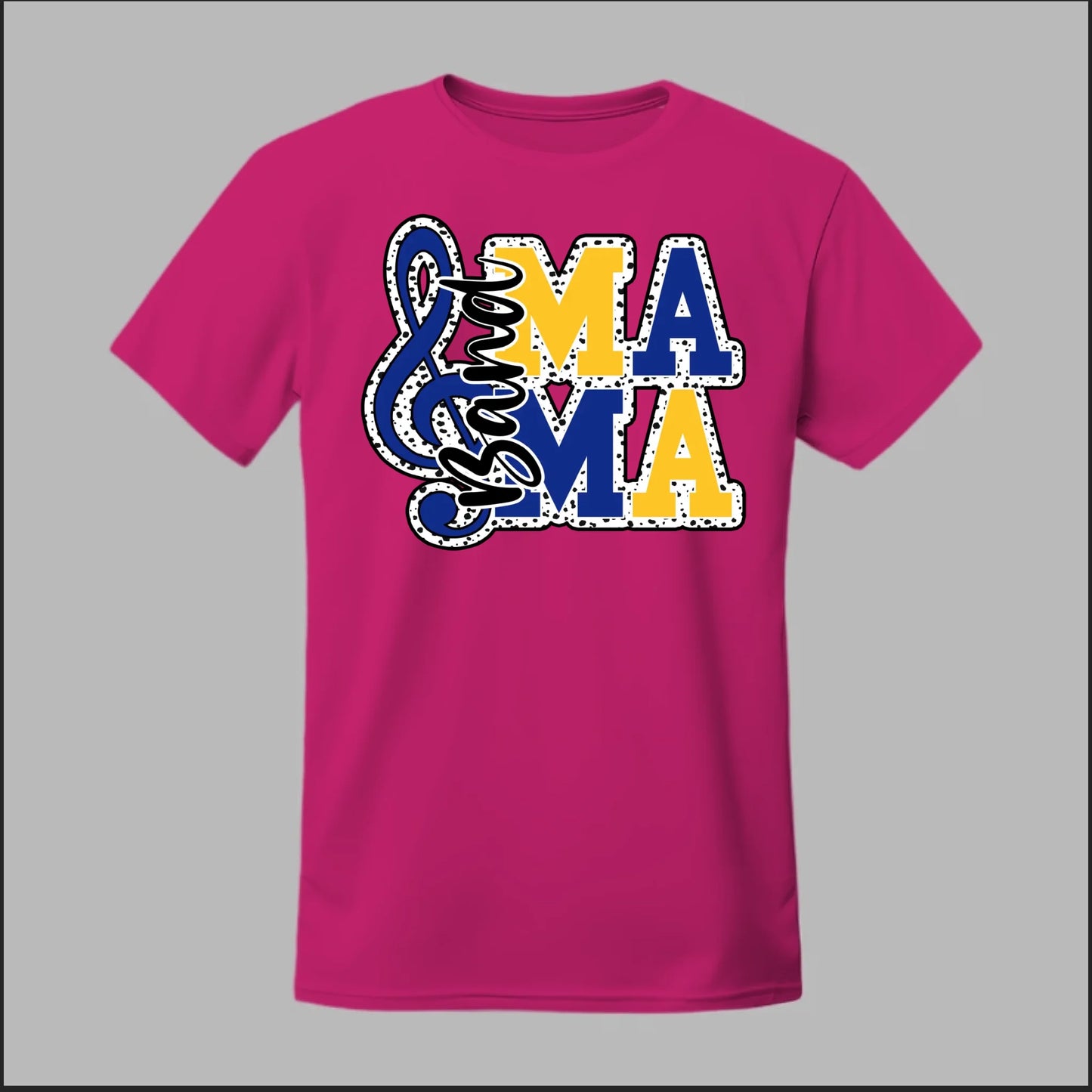 Show your pride loud and clear with this bold Band Mama tee! Featuring a striking treble clef and standout block lettering in school colors, this design is perfect for every rehearsal, halftime show, and competition. Comfy, stylish, and full of spirit, it’s a must-have for moms who cheer the band on from the stands and beyond.