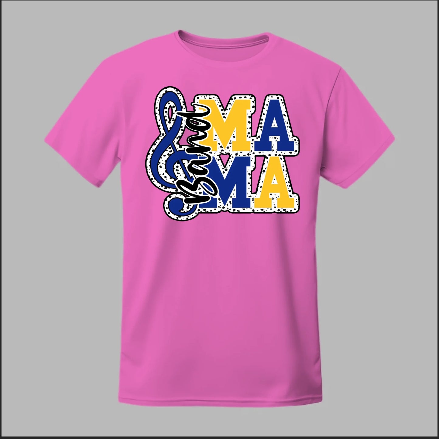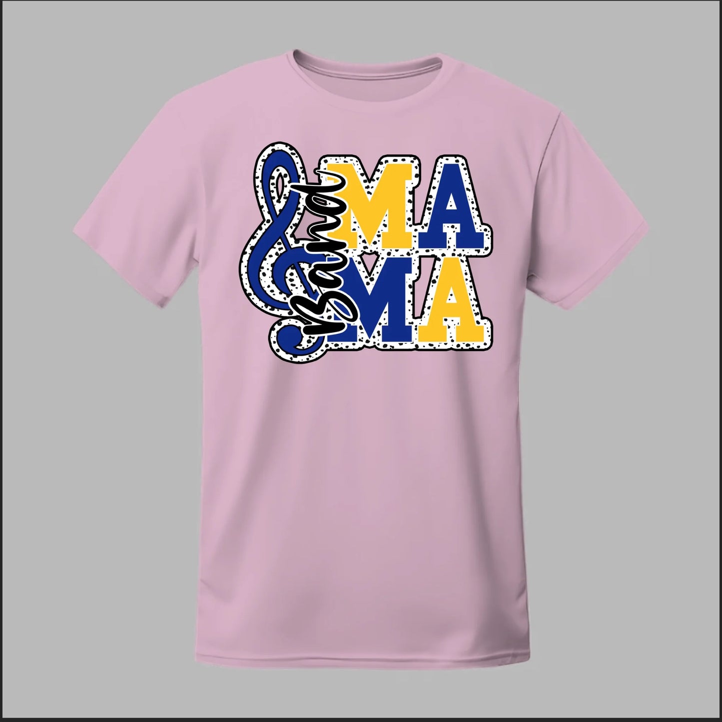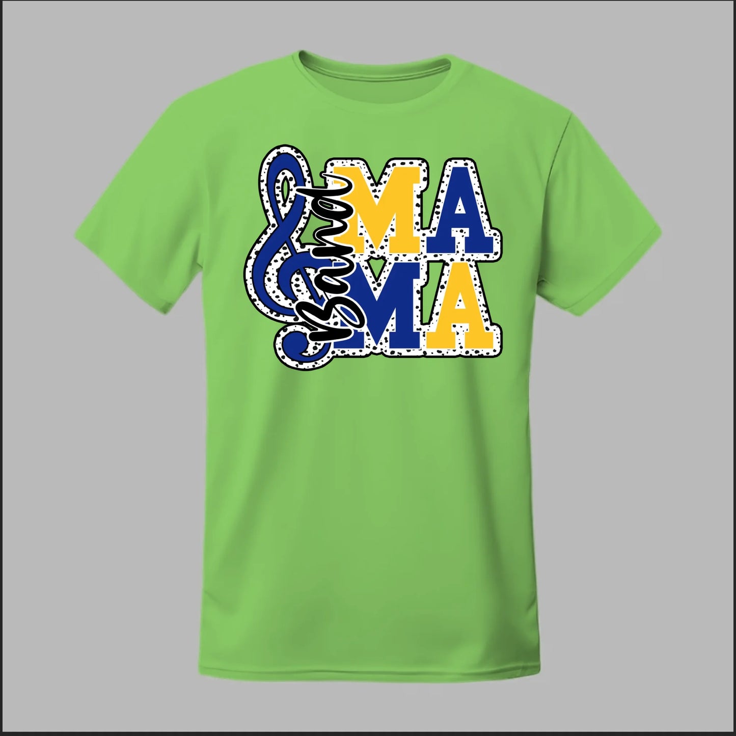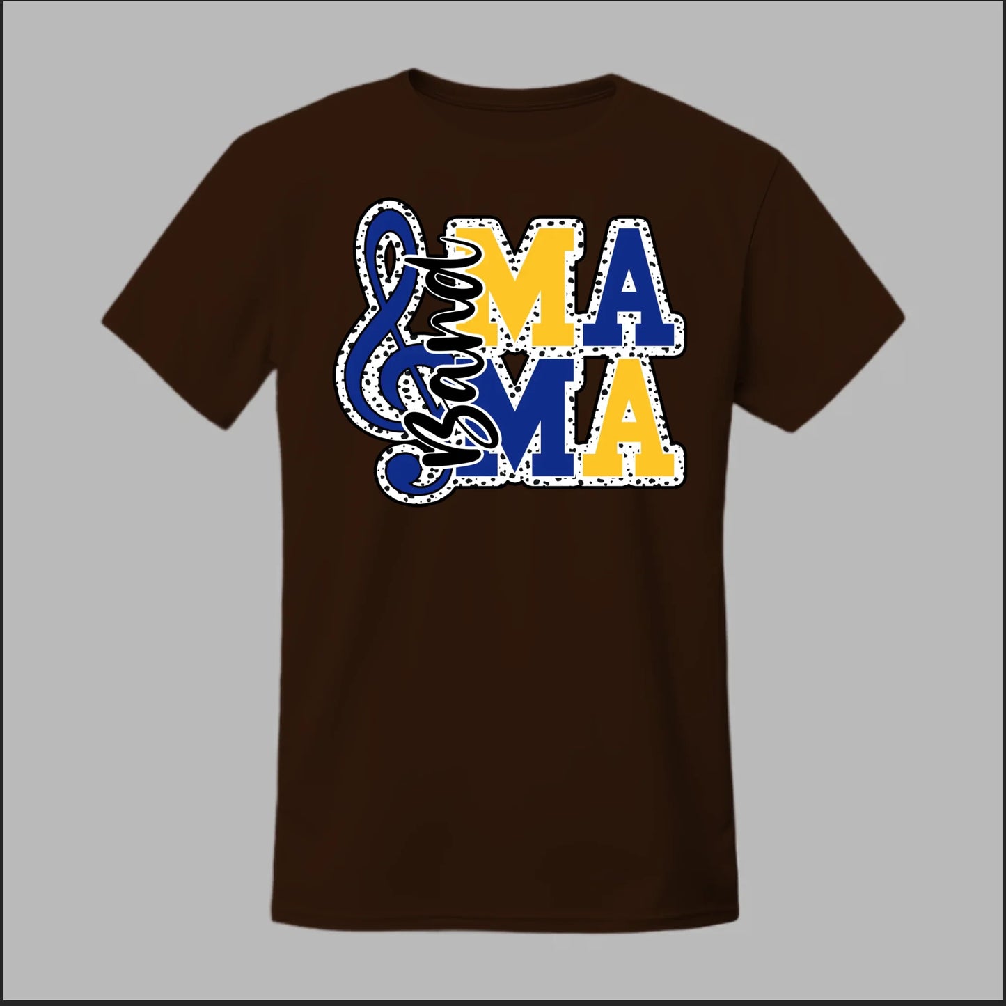 Show your pride loud and clear with this bold Band Mama tee! Featuring a striking treble clef and standout block lettering in school colors, this design is perfect for every rehearsal, halftime show, and competition. Comfy, stylish, and full of spirit, it’s a must-have for moms who cheer the band on from the stands and beyond.