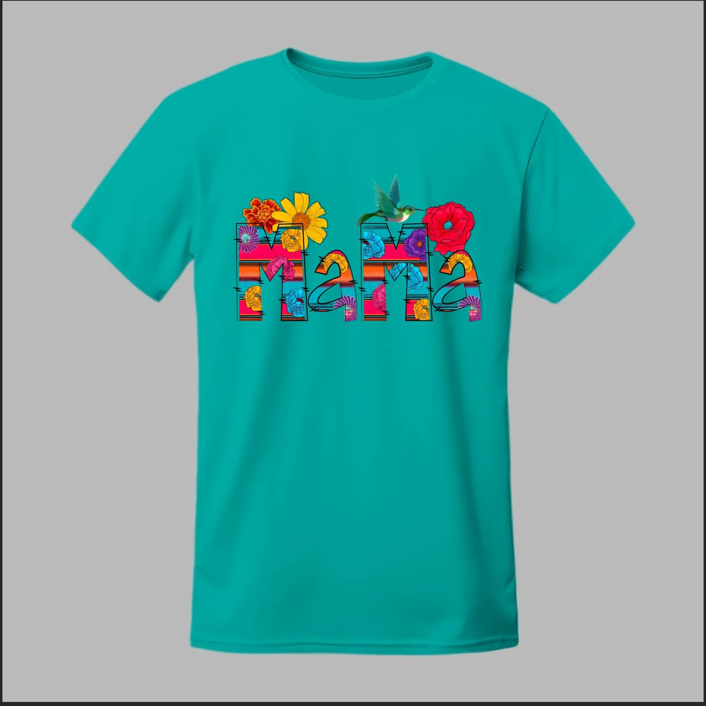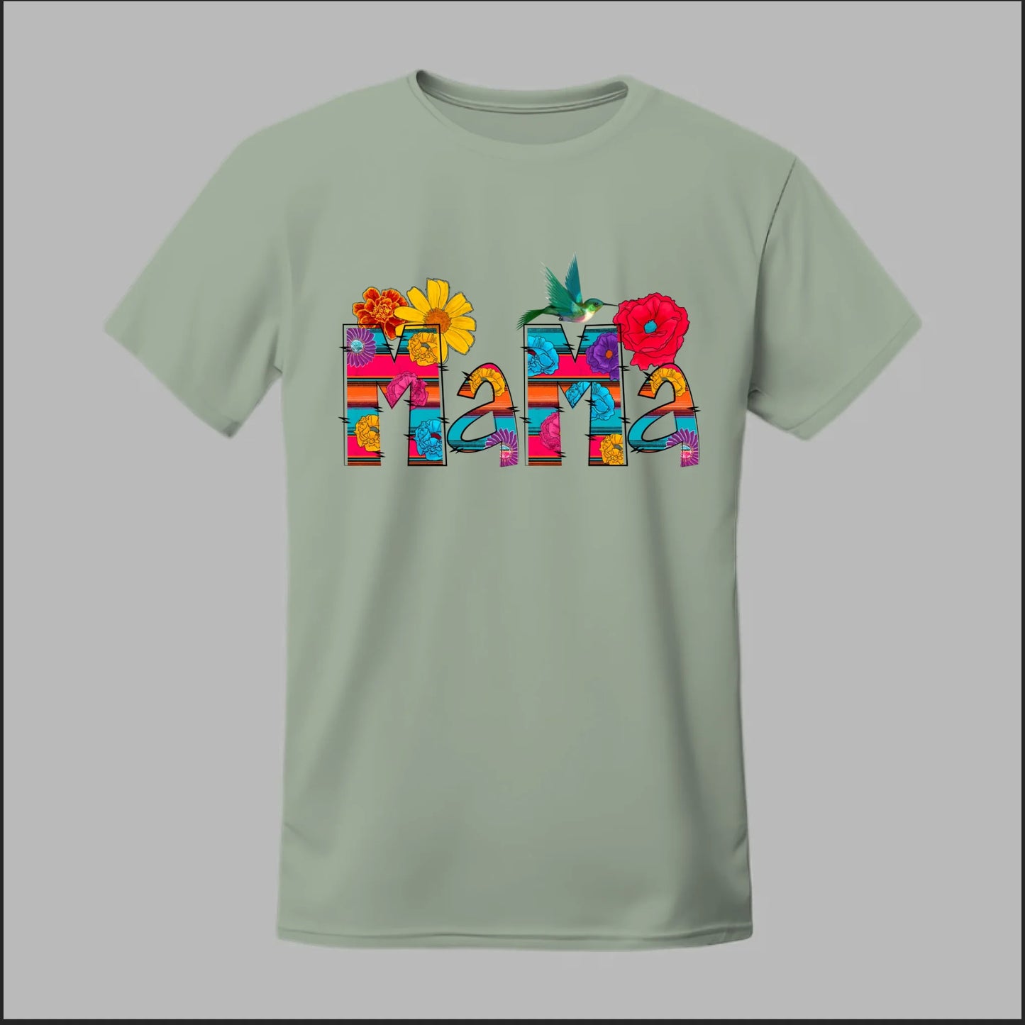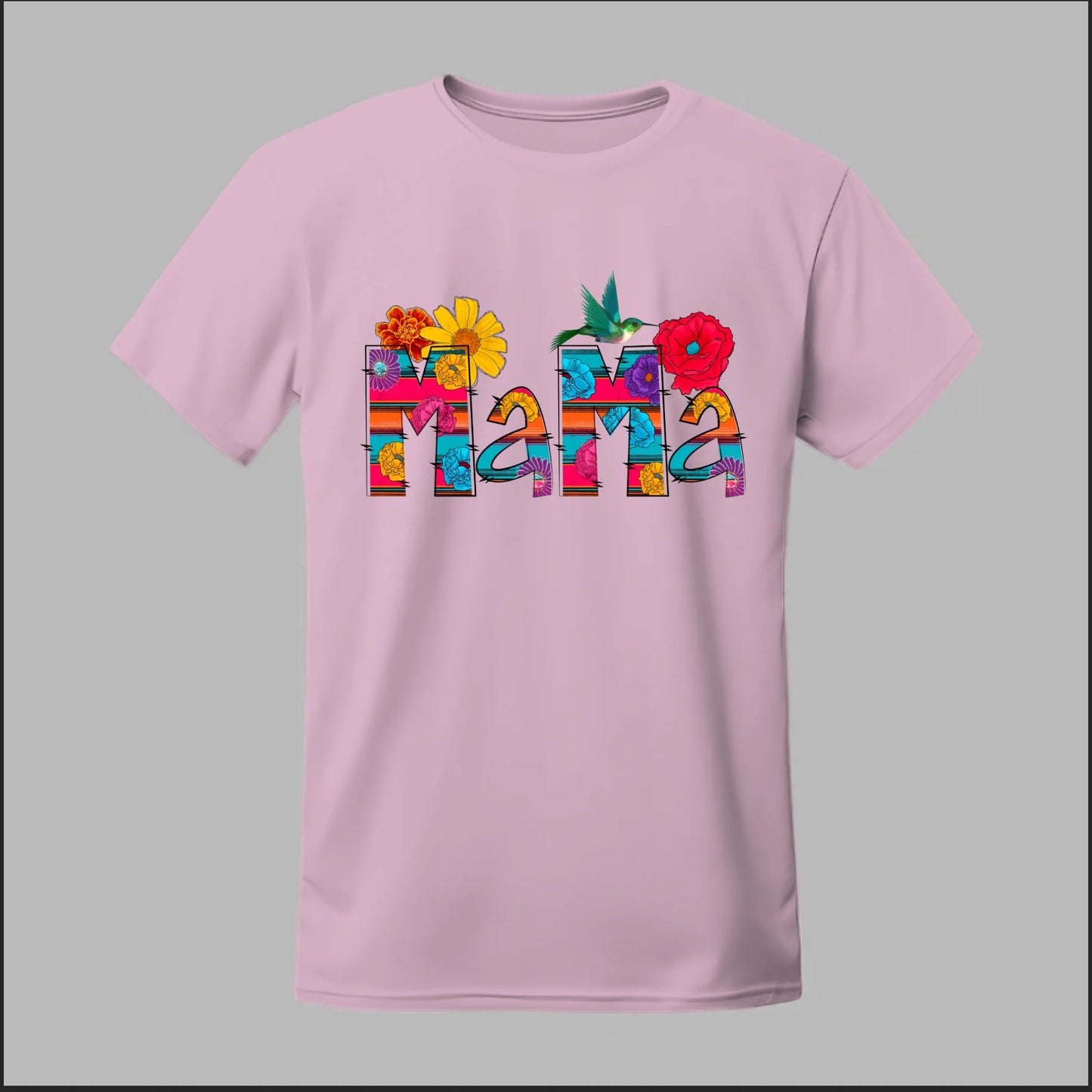Celebrate the beauty of motherhood with our Vibrant Floral Serape Mama Tee. Bold and colorful, this design features the word Mama filled with a lively serape print, adorned with blooming flowers and a hummingbird for an extra touch of joy and life. Perfect for proud moms who love vibrant, eye-catching style, this tee pairs effortlessly with jeans, skirts, or leggings for everyday wear.