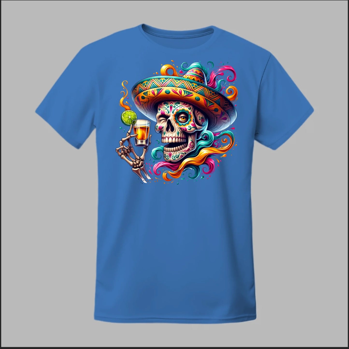 Pay homage to Mexican heritage with the Vintage Agave Skull tee, featuring a skeletal figure in a sombrero holding a tequila bottle. With hand-drawn vintage detailing and traditional flair, this design is a must-have for lovers of classic Día de los Muertos art.