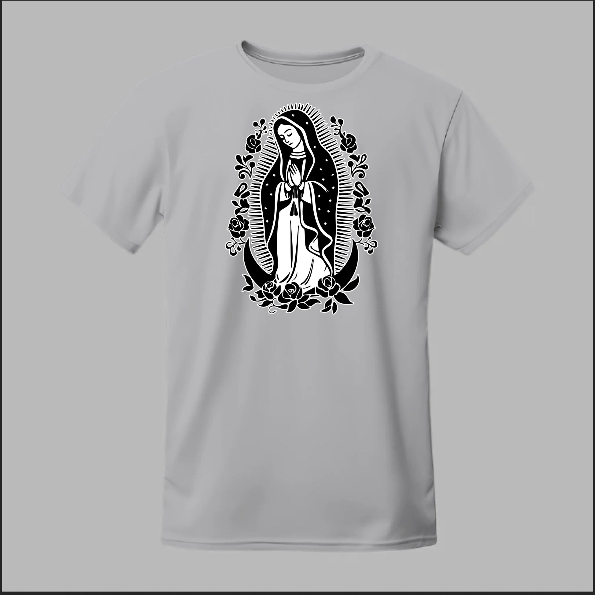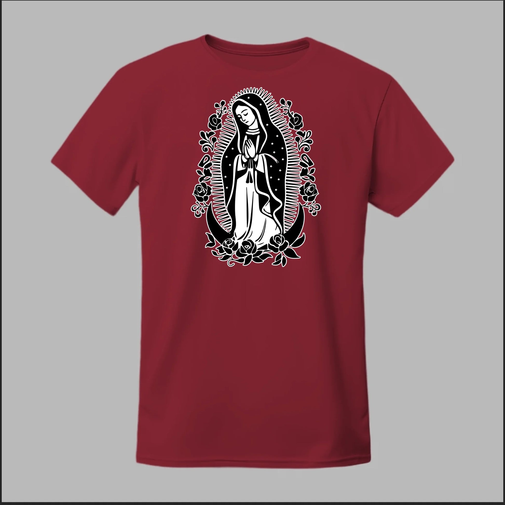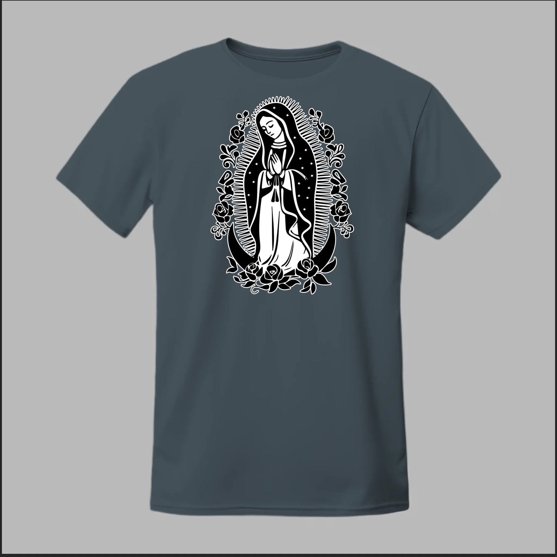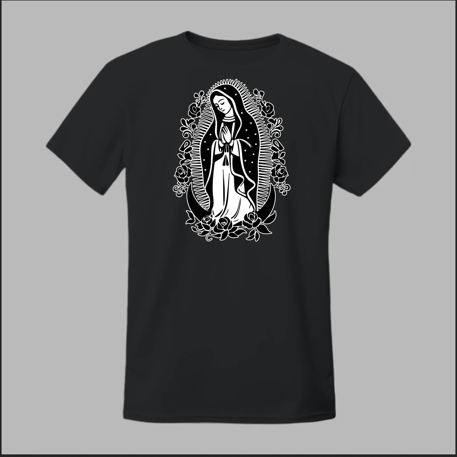 The Virgen de Guadalupe Silhouette Tee beautifully captures the sacred and iconic imagery of La Virgen in a bold black-and-white design. Surrounded by roses and radiant lines, this shirt blends devotion and artistry, making it a meaningful piece to wear for faith, culture, and tradition. A timeless expression of spirituality and heritage that pairs reverence with striking style.