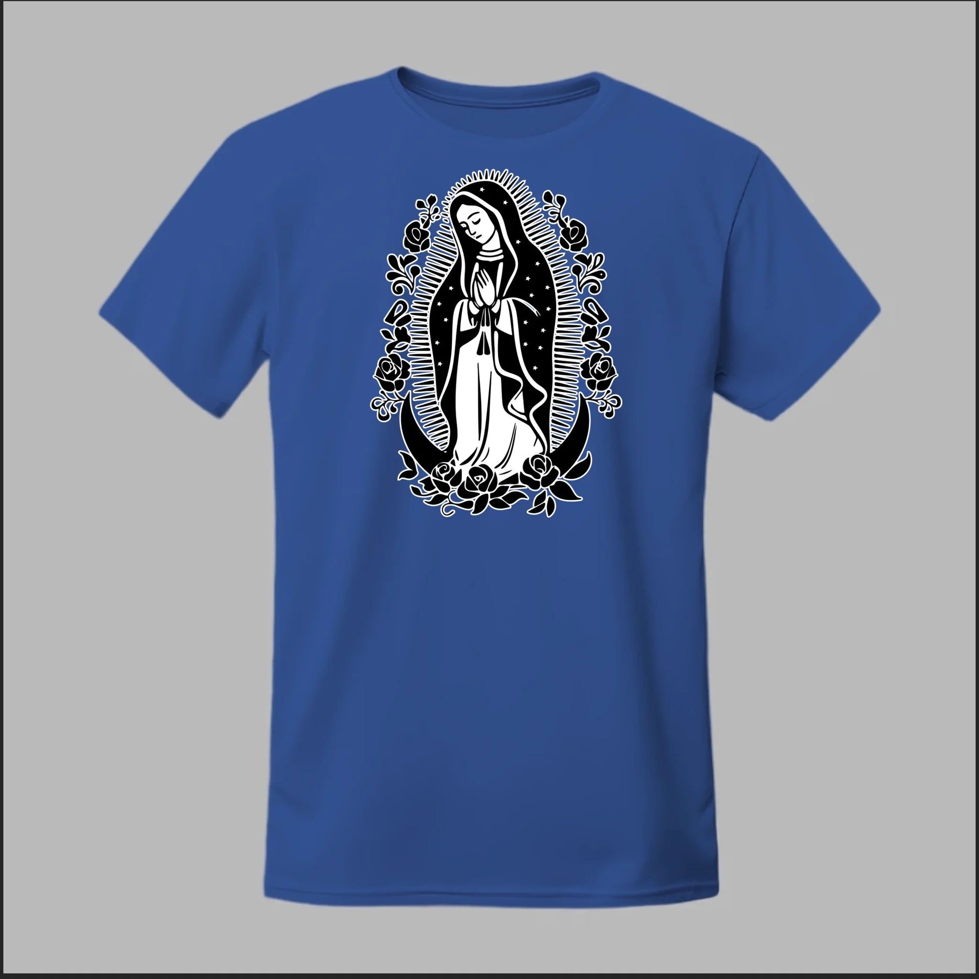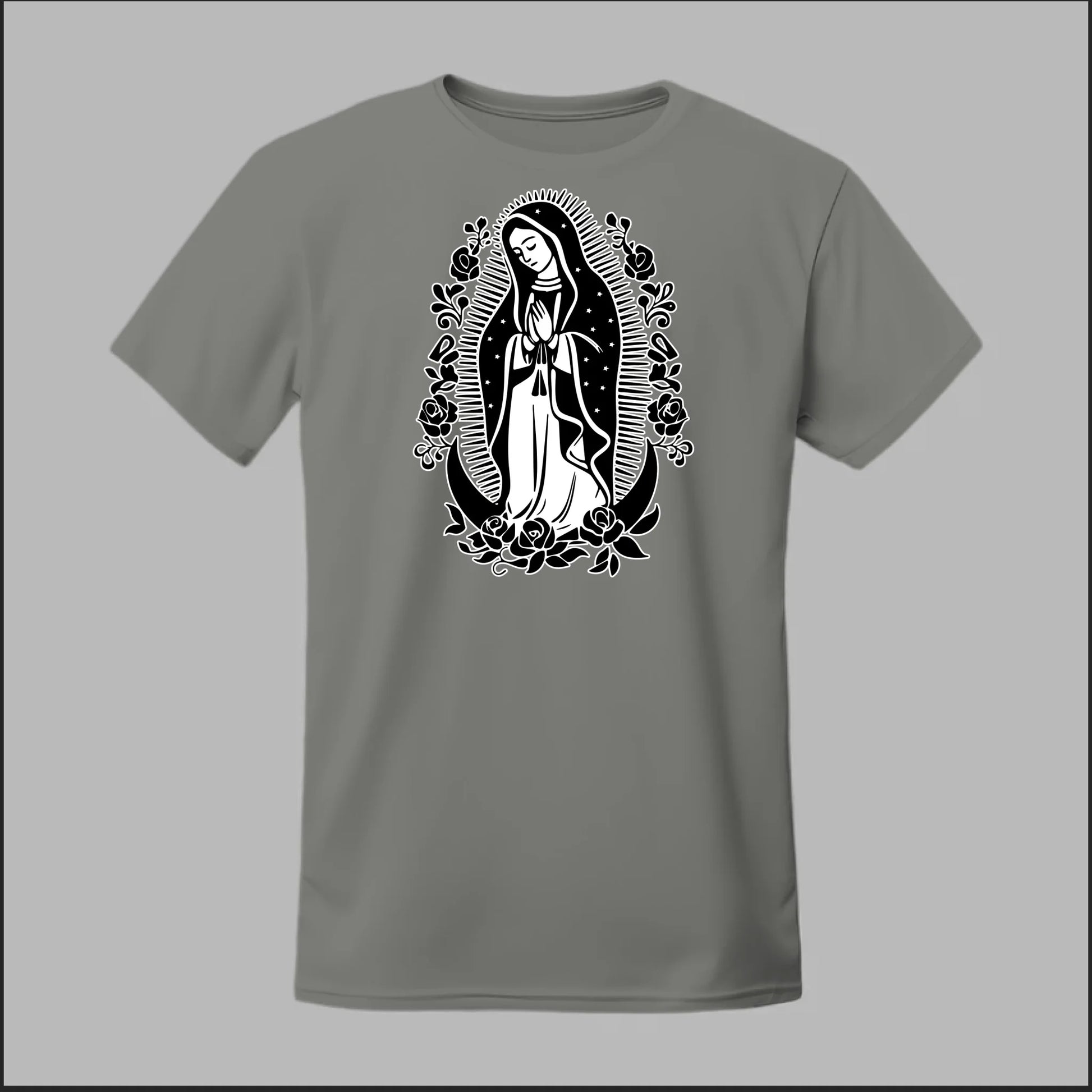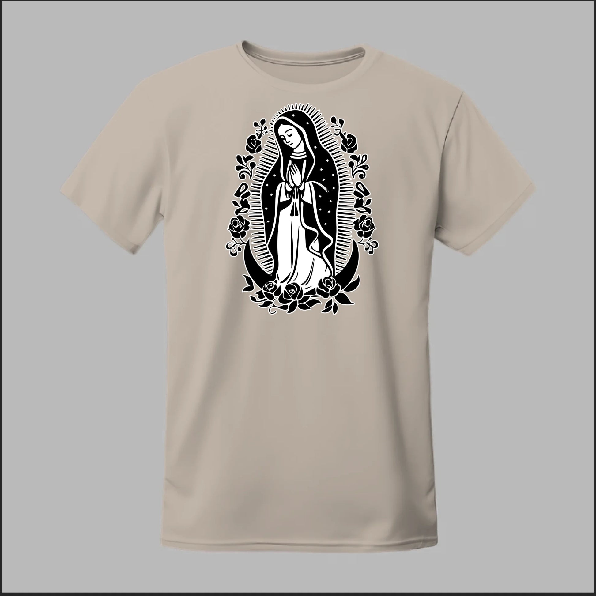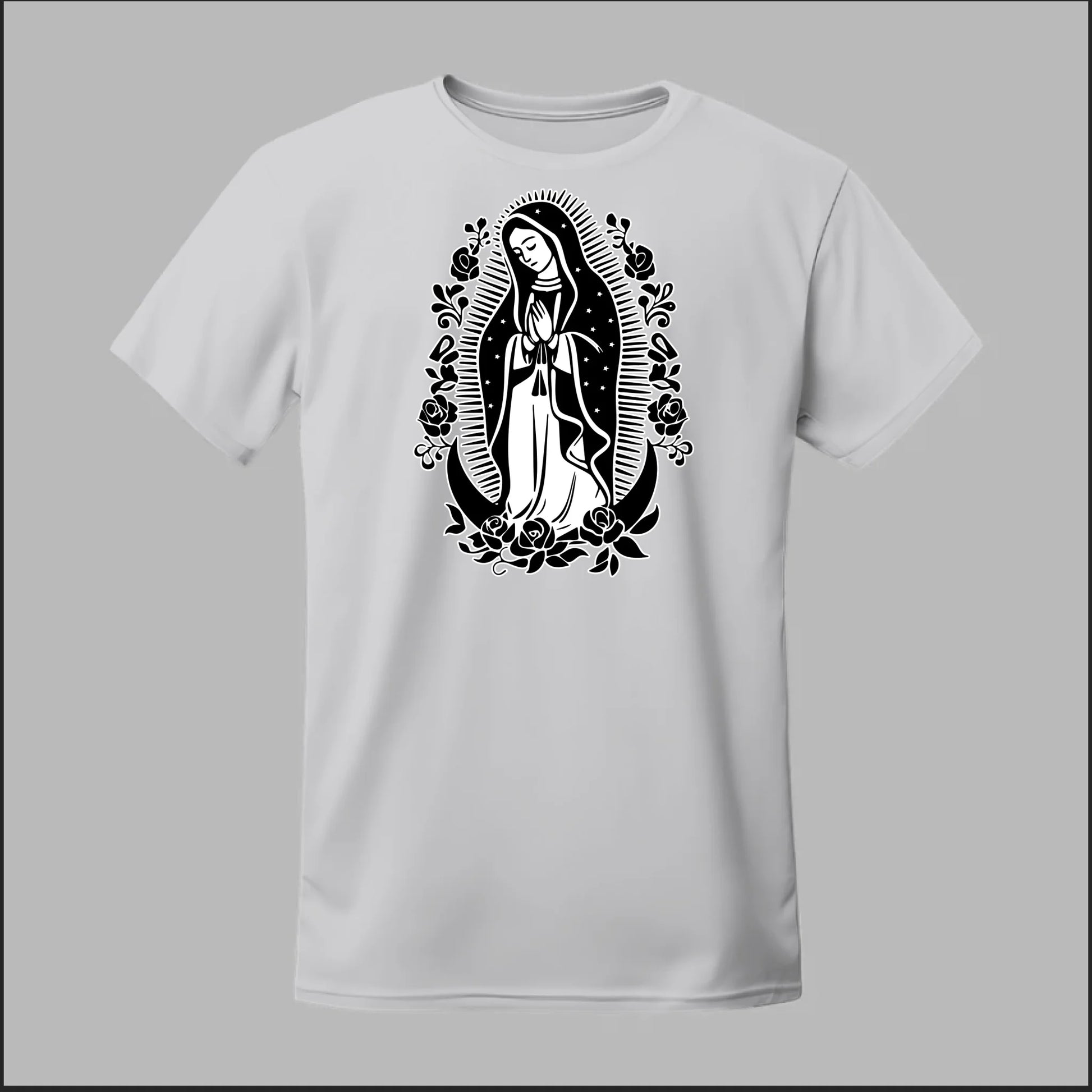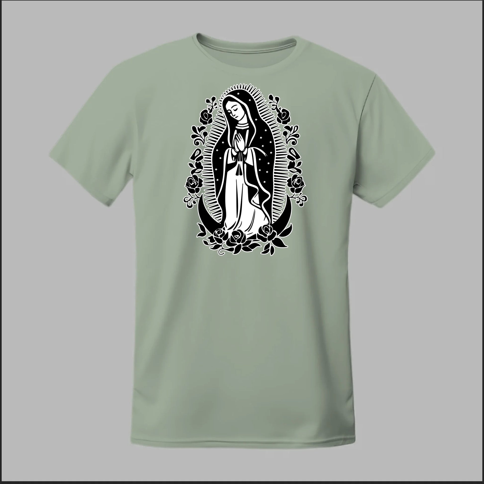 The Virgen de Guadalupe Silhouette Tee beautifully captures the sacred and iconic imagery of La Virgen in a bold black-and-white design. Surrounded by roses and radiant lines, this shirt blends devotion and artistry, making it a meaningful piece to wear for faith, culture, and tradition. A timeless expression of spirituality and heritage that pairs reverence with striking style.