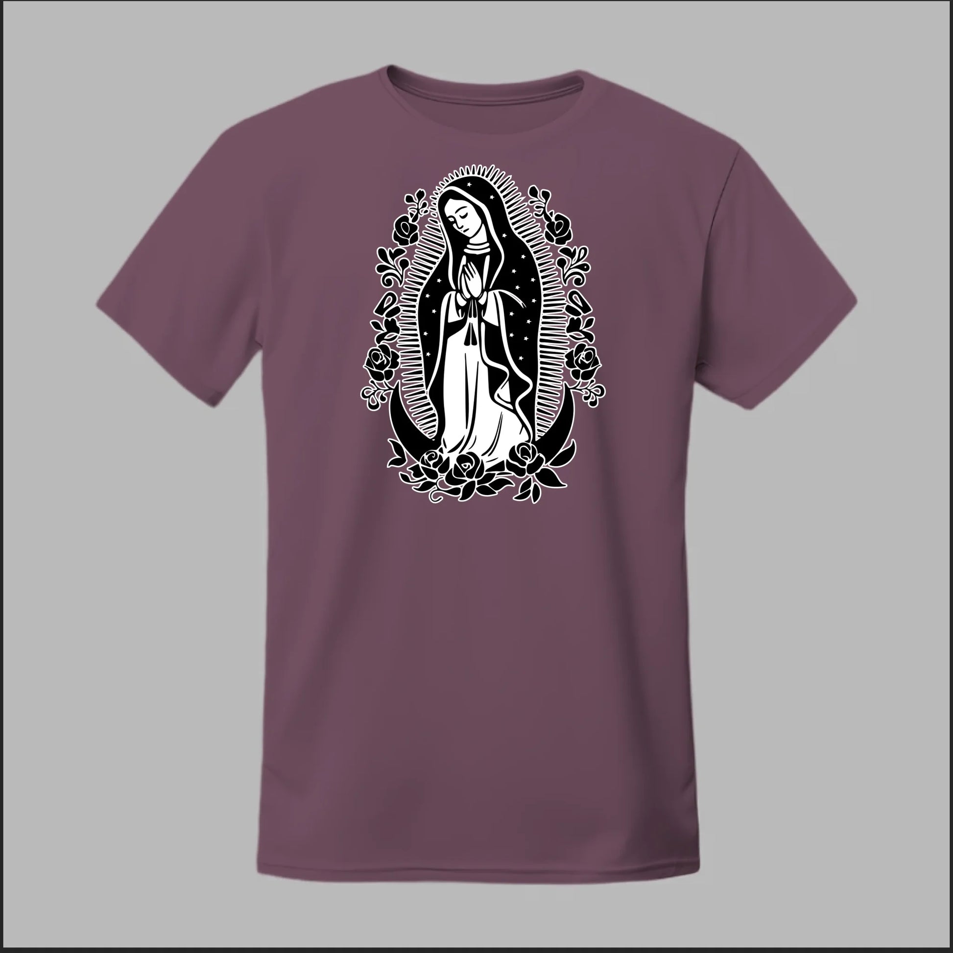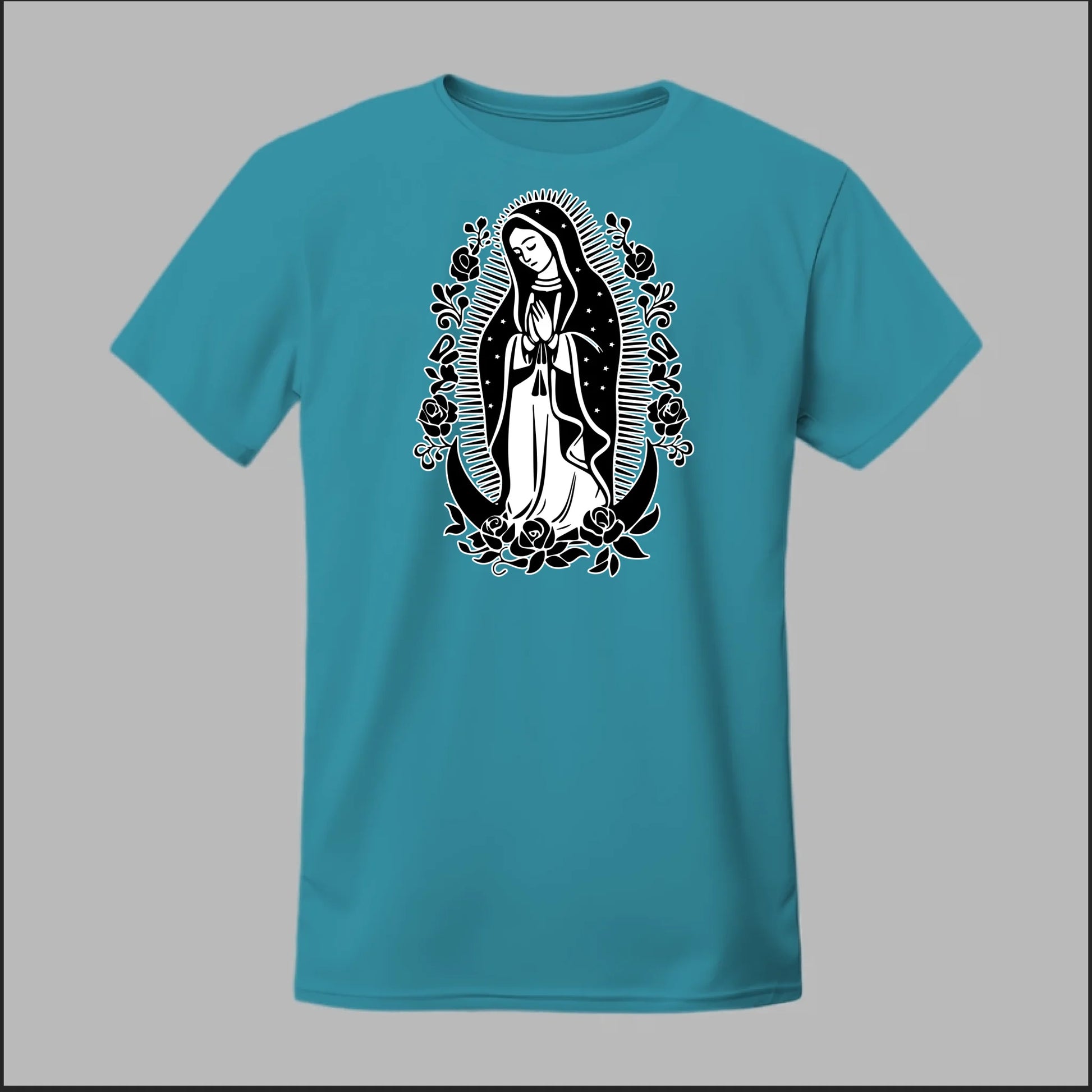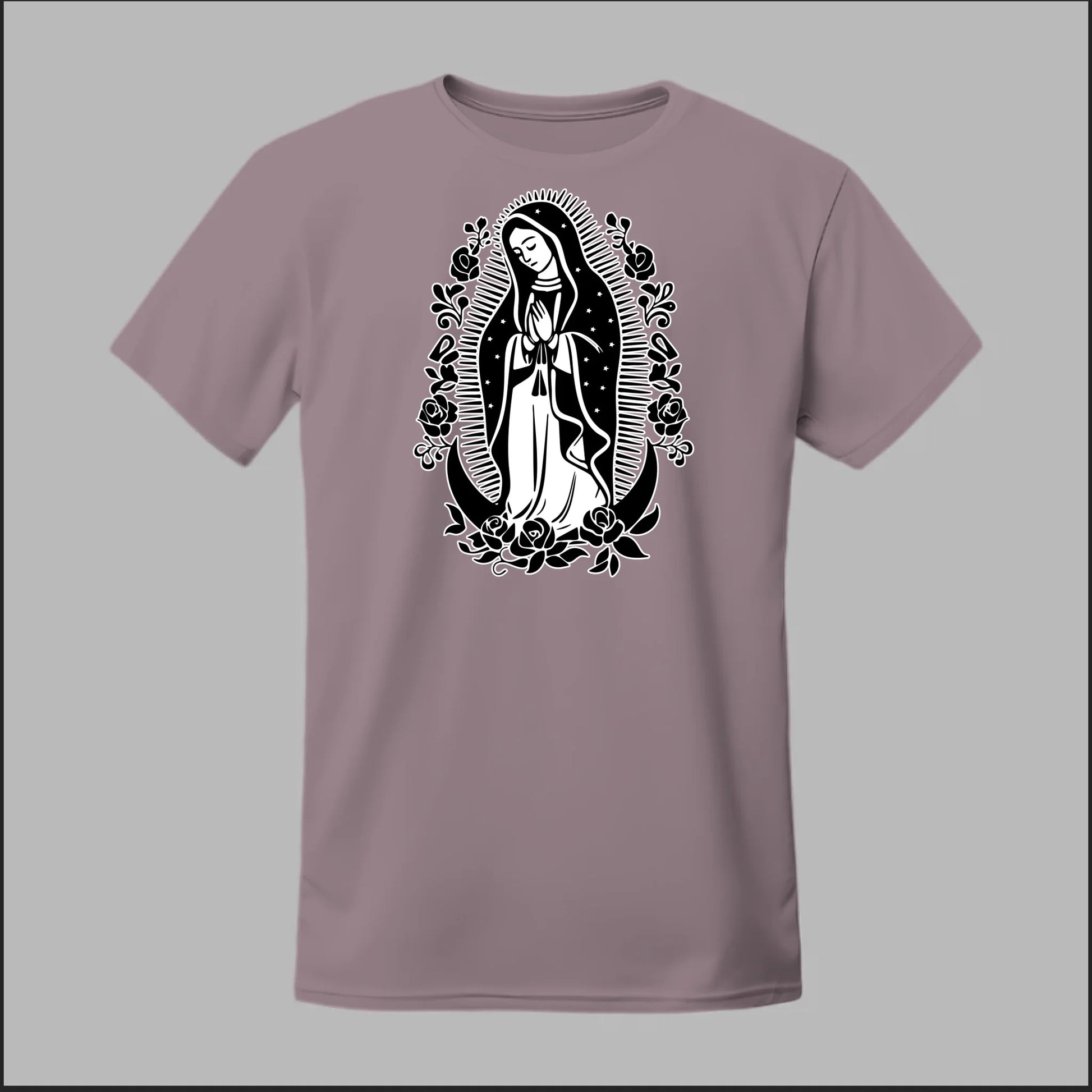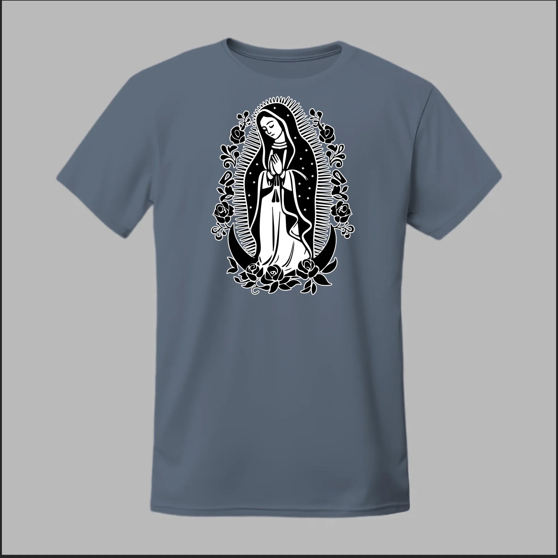 The Virgen de Guadalupe Silhouette Tee beautifully captures the sacred and iconic imagery of La Virgen in a bold black-and-white design. Surrounded by roses and radiant lines, this shirt blends devotion and artistry, making it a meaningful piece to wear for faith, culture, and tradition. A timeless expression of spirituality and heritage that pairs reverence with striking style.