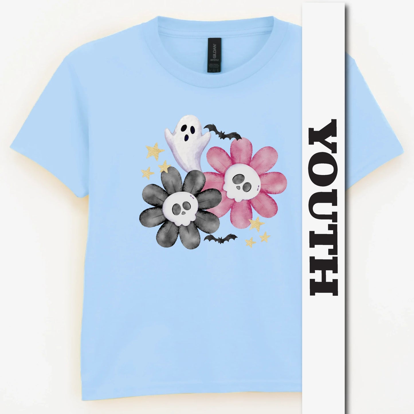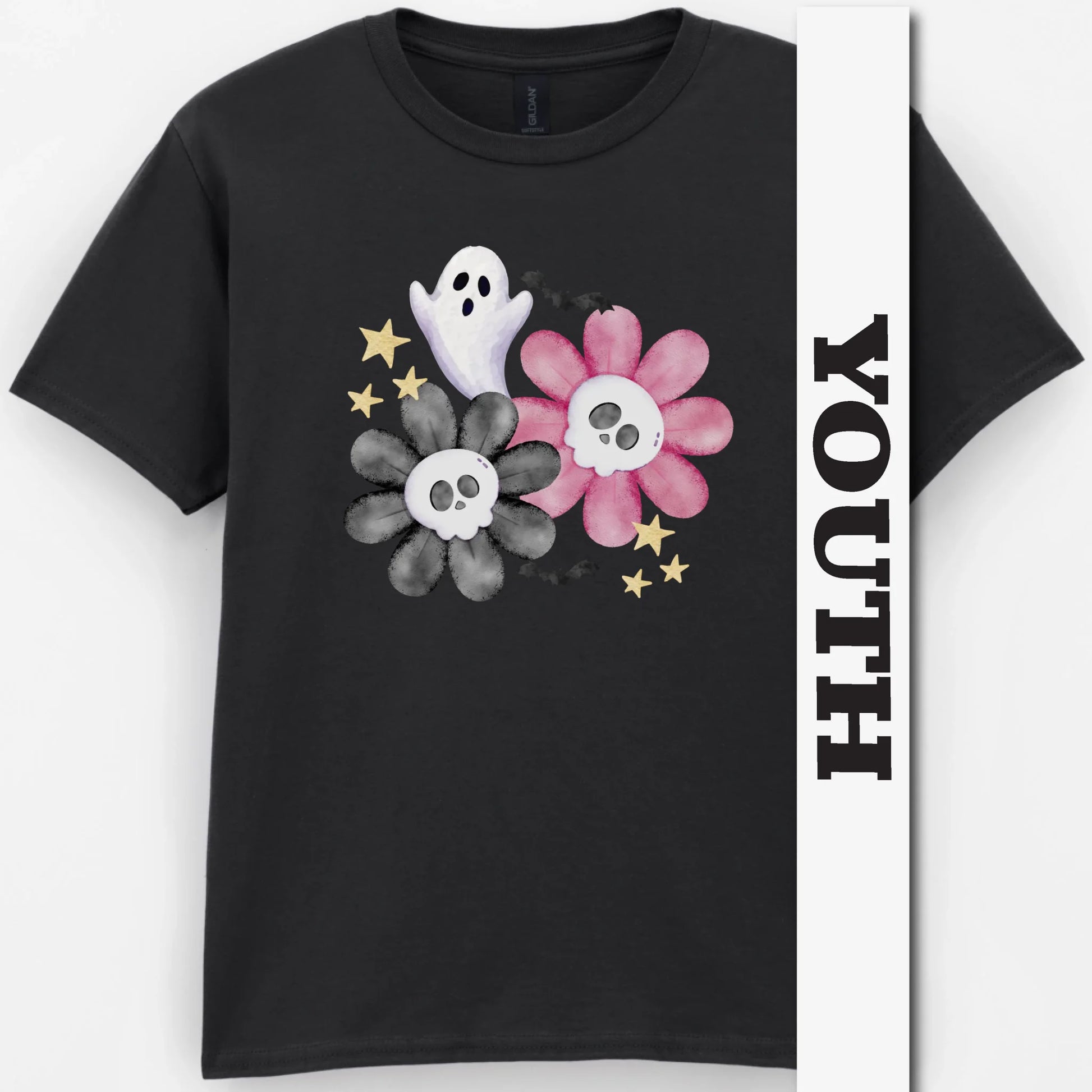 Who says Halloween can’t be adorable? This whimsical design combines pastel watercolor florals with skull centers, a friendly little ghost, bats, and sparkling stars for the perfect mix of spooky and sweet. It’s the ultimate tee for anyone who loves Halloween but also wants a softer, fun vibe.