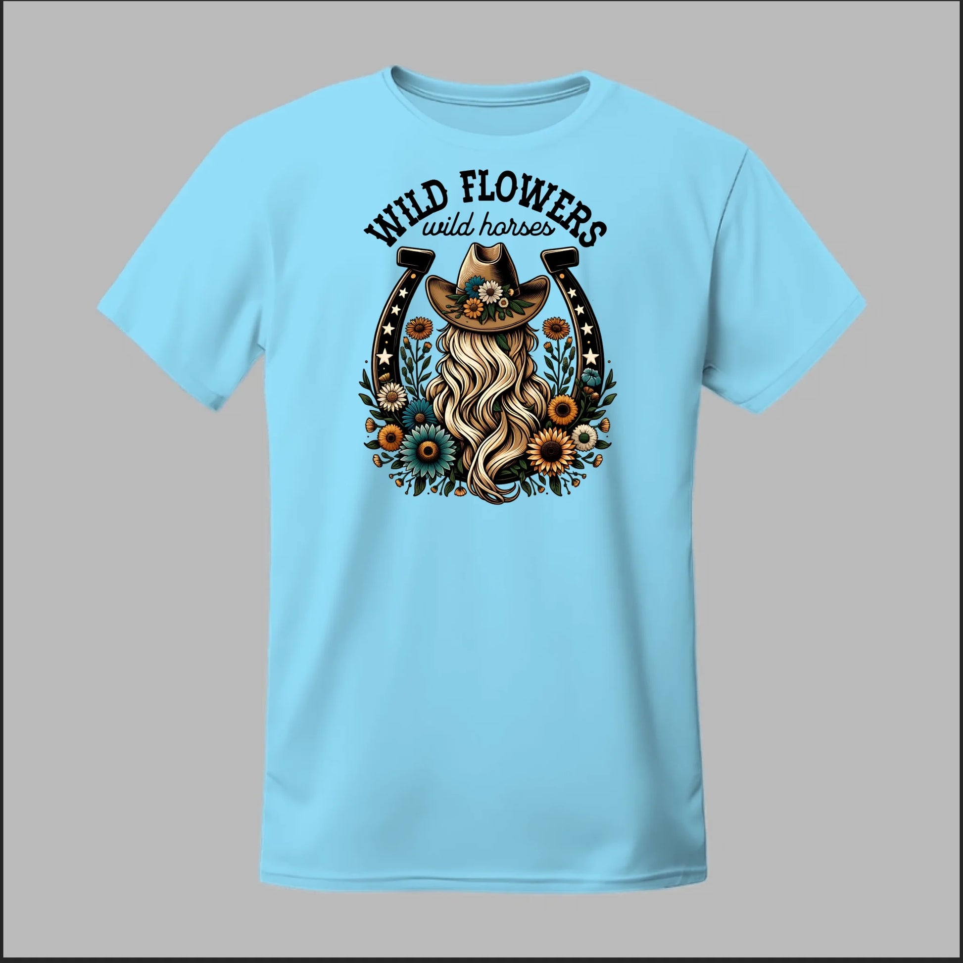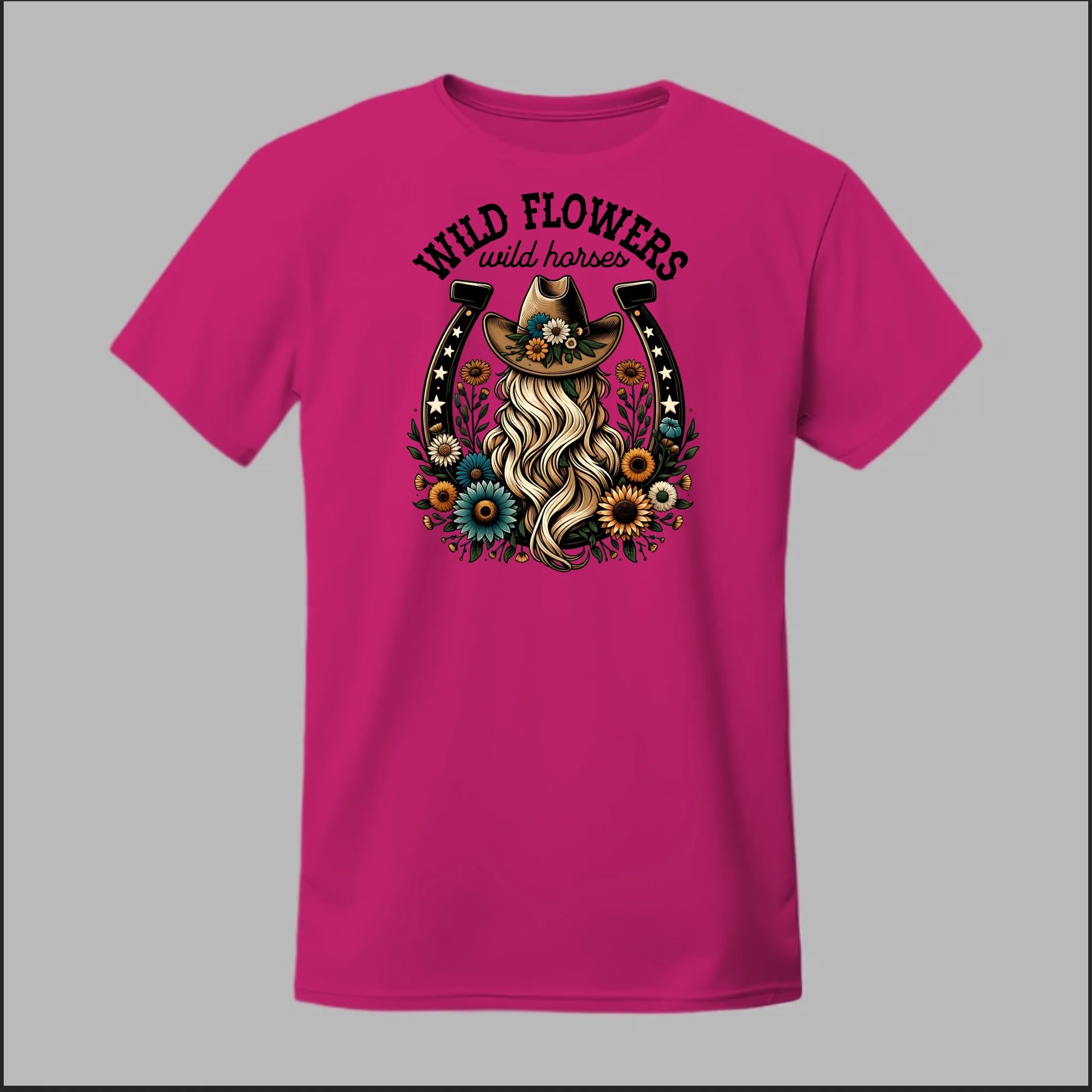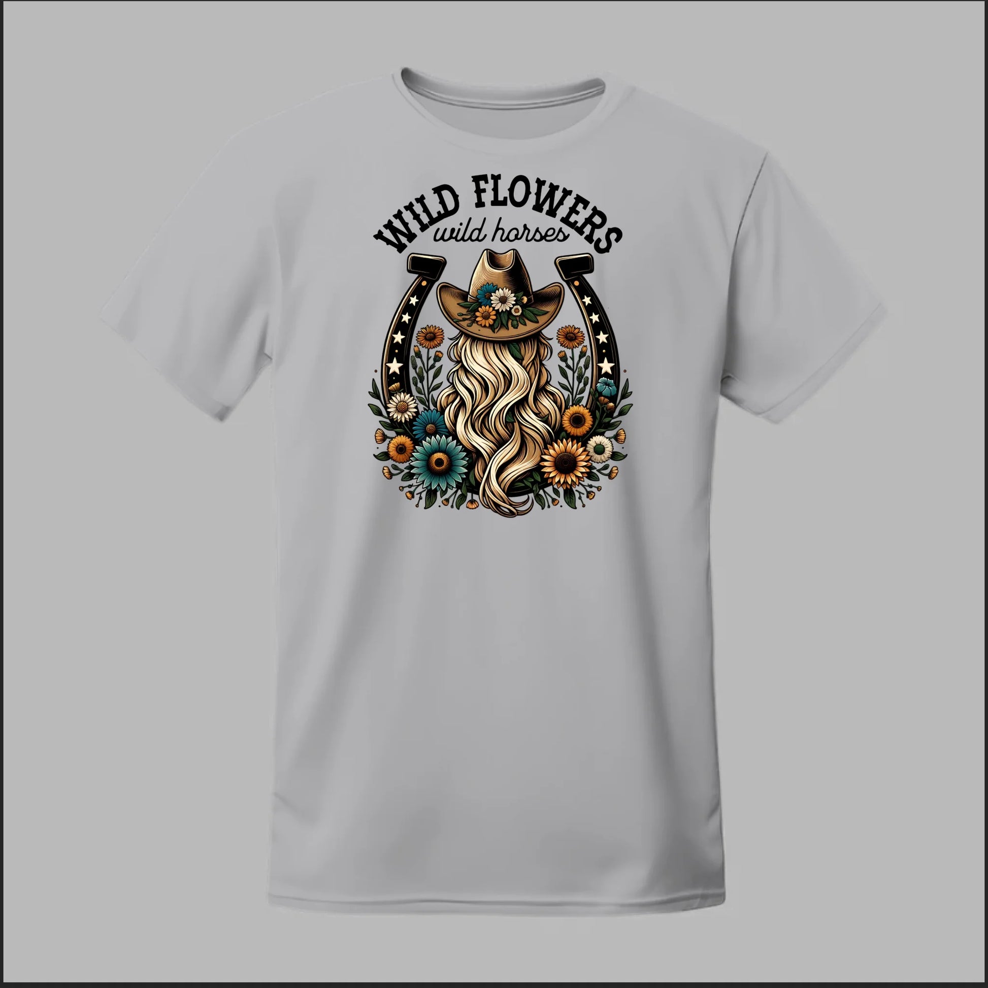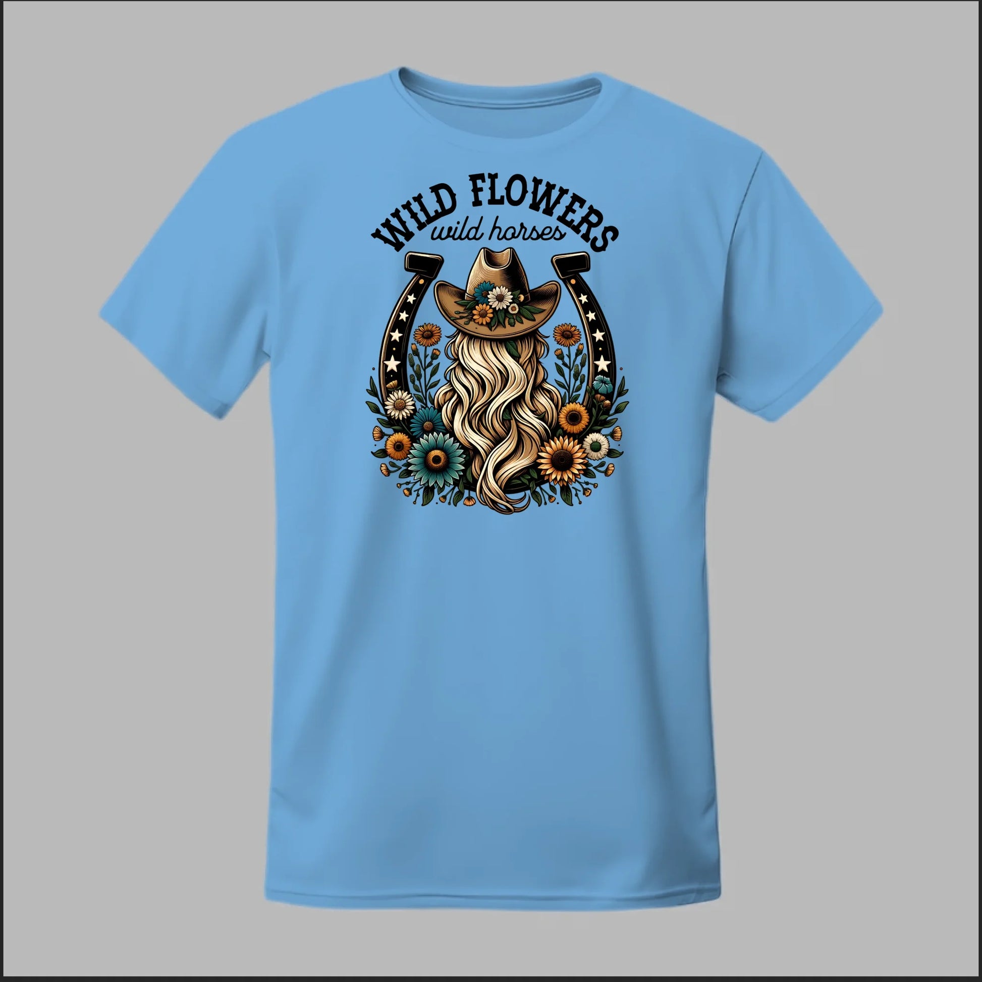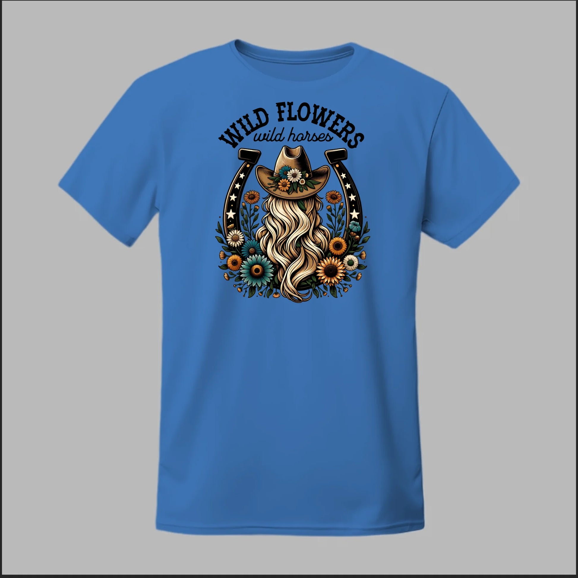 Channel your inner free spirit with the Wildflower Cowgirl Tee. Featuring a stunning design of flowing hair beneath a flower-crowned cowboy hat, framed by horseshoes and vibrant blooms, this shirt perfectly blends Western grit with boho beauty.
