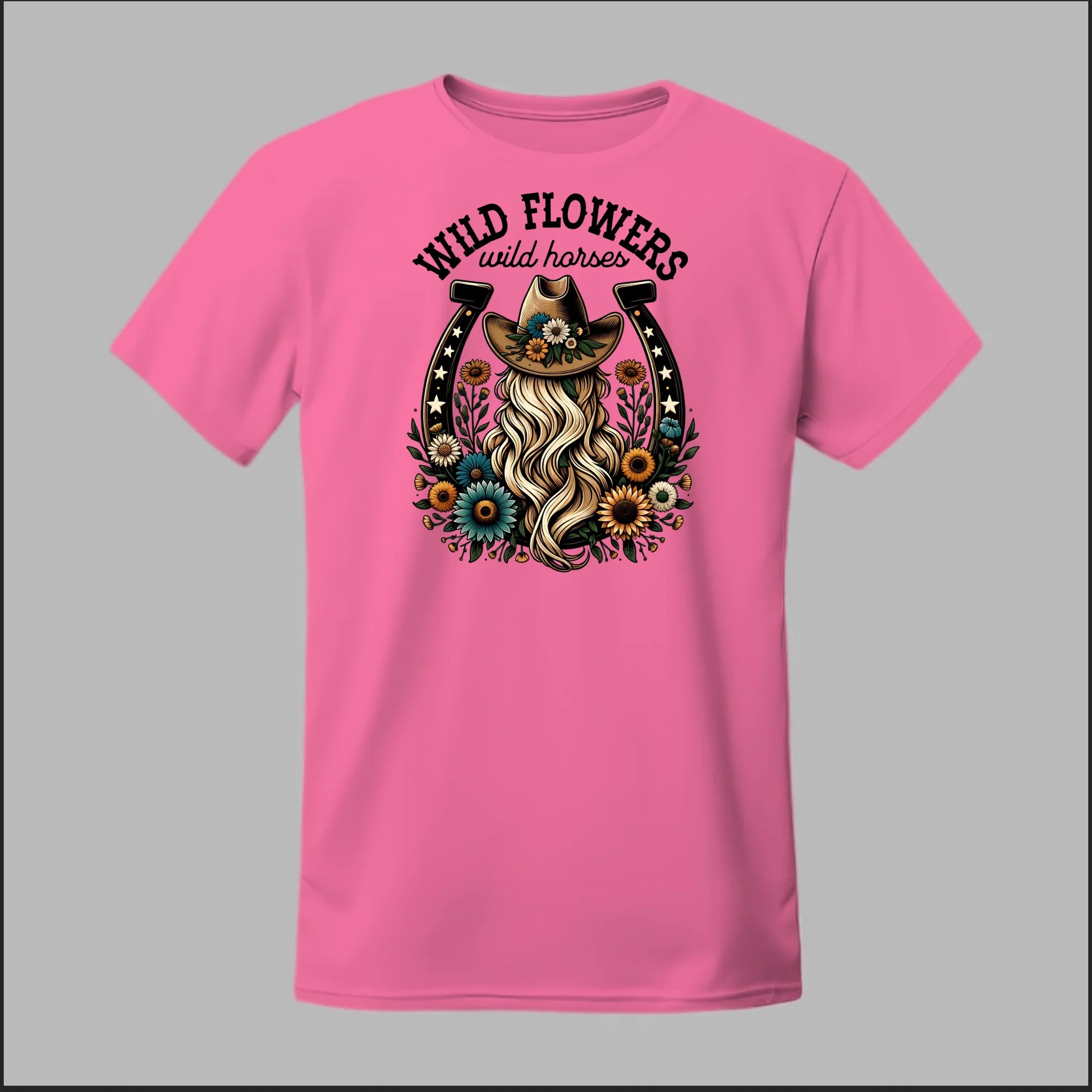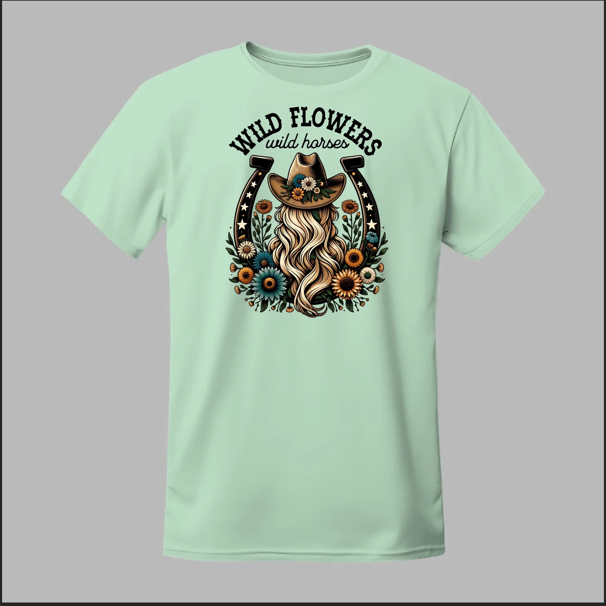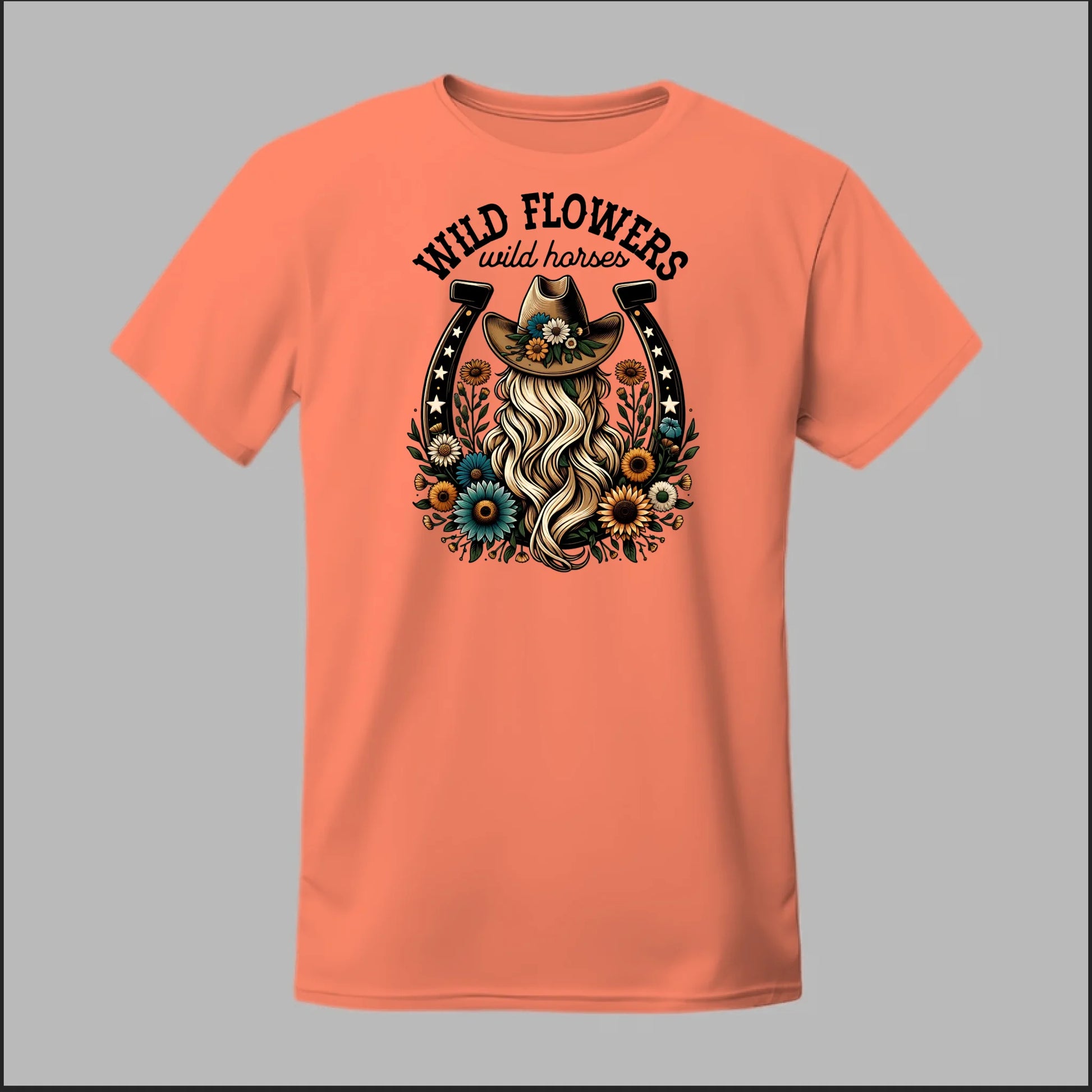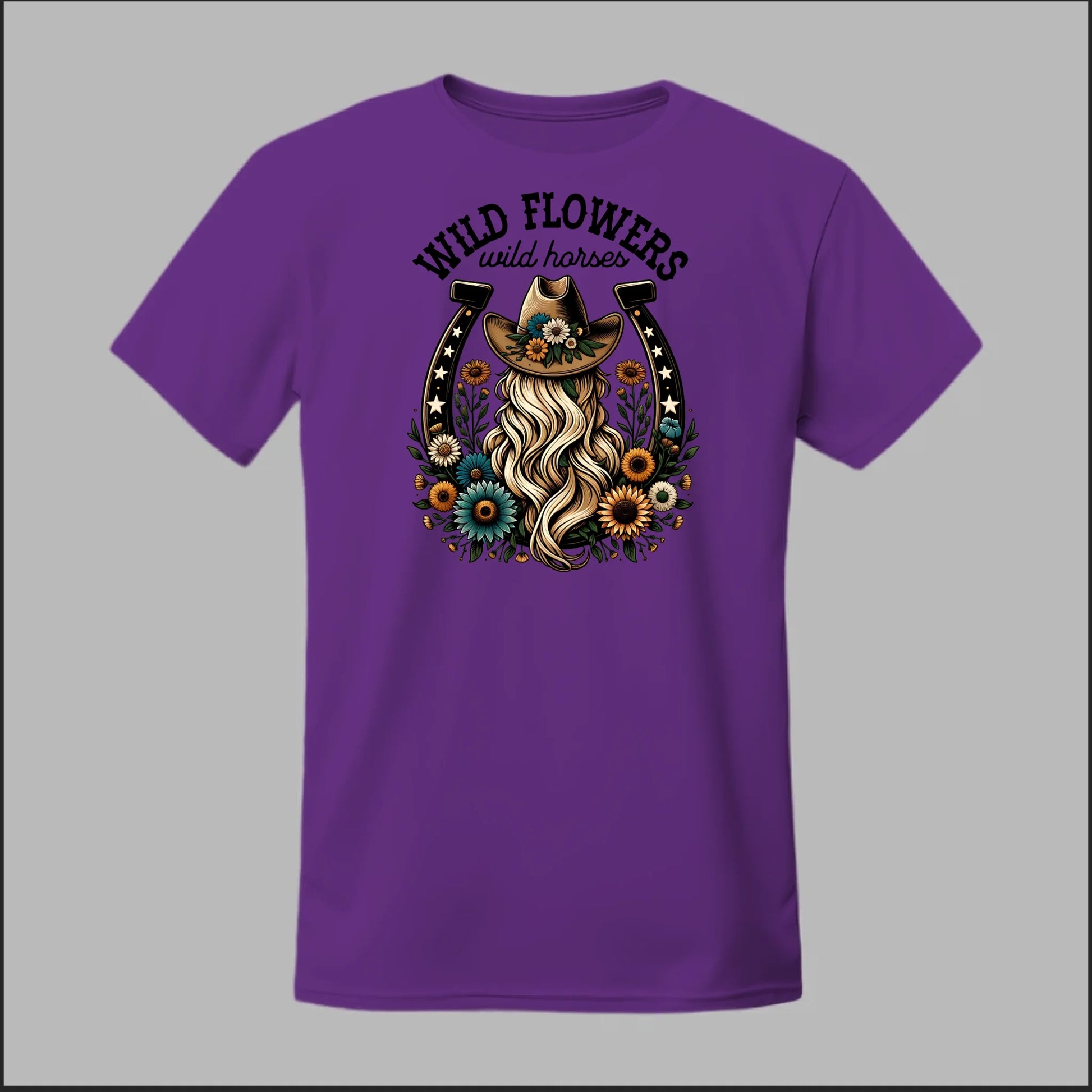 Channel your inner free spirit with the Wildflower Cowgirl Tee. Featuring a stunning design of flowing hair beneath a flower-crowned cowboy hat, framed by horseshoes and vibrant blooms, this shirt perfectly blends Western grit with boho beauty.