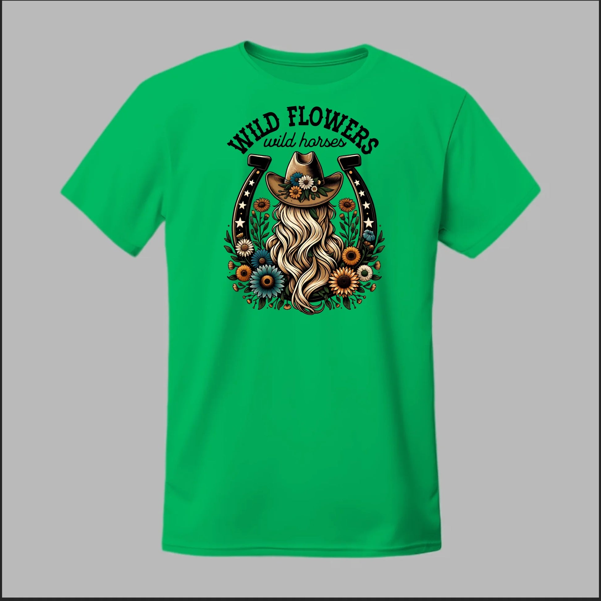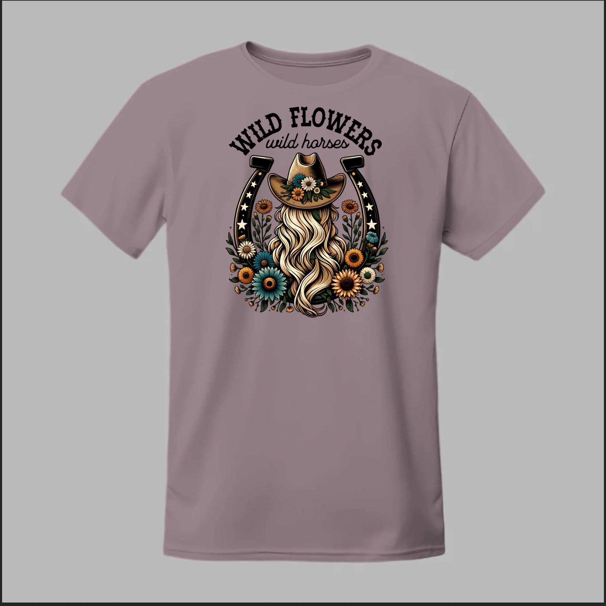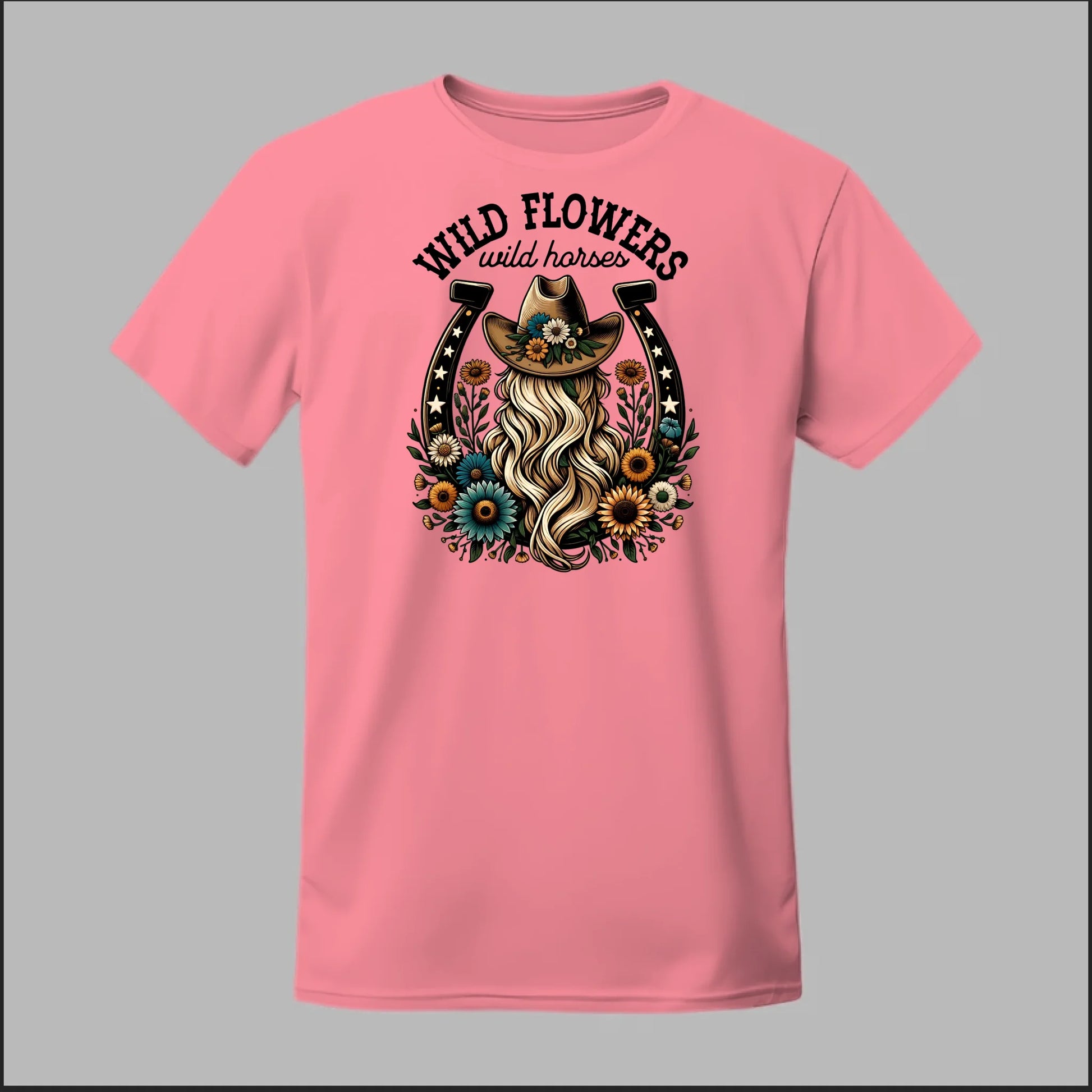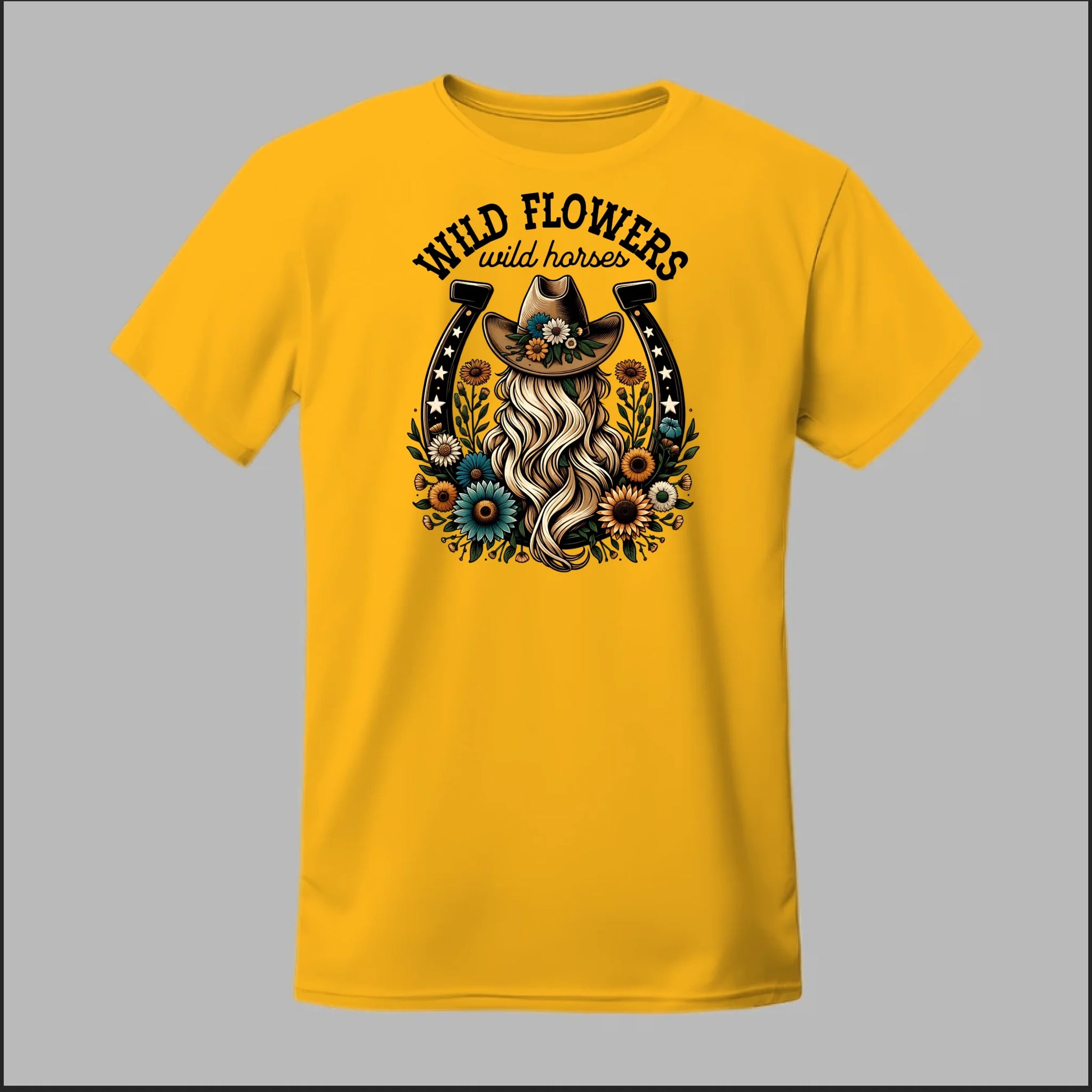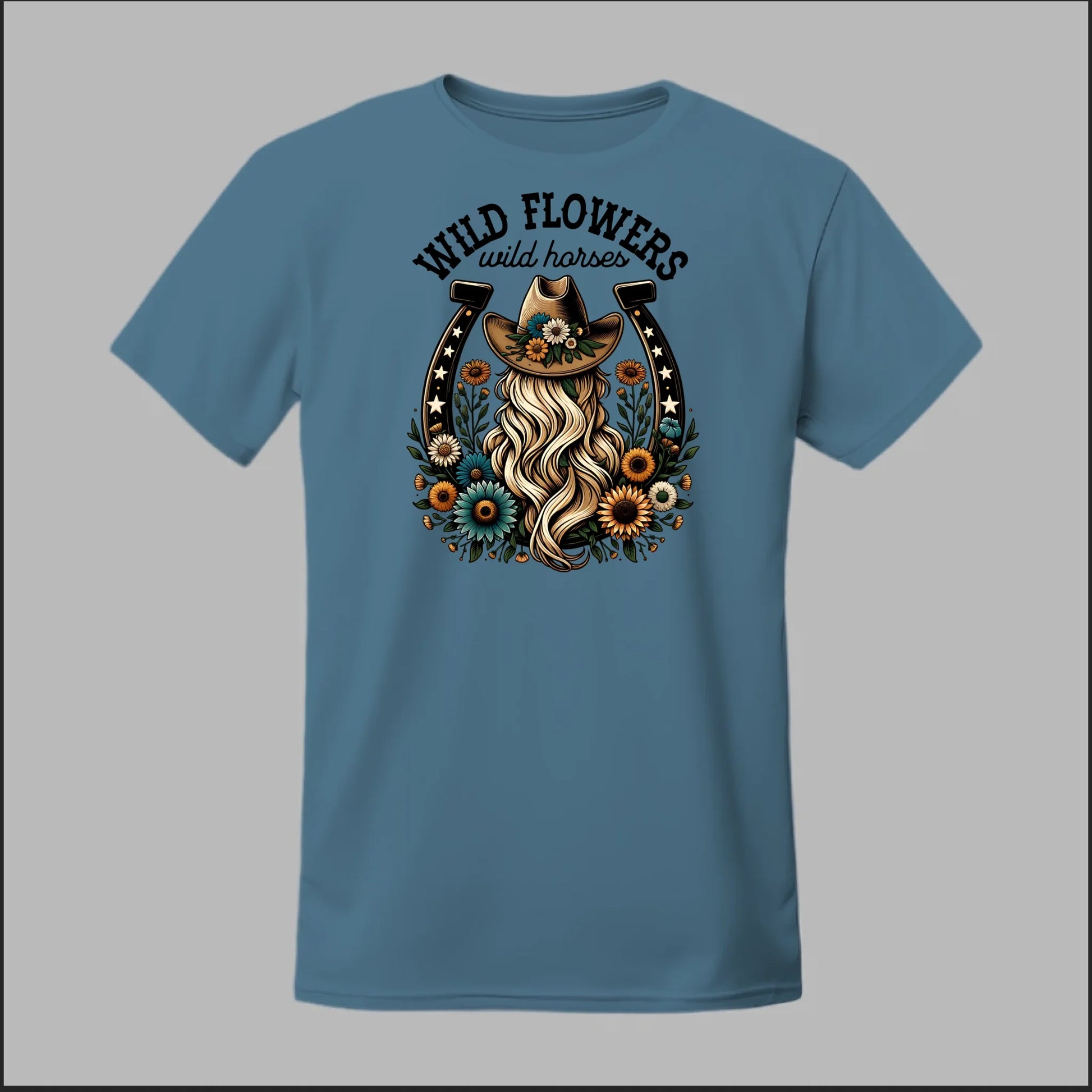 Channel your inner free spirit with the Wildflower Cowgirl Tee. Featuring a stunning design of flowing hair beneath a flower-crowned cowboy hat, framed by horseshoes and vibrant blooms, this shirt perfectly blends Western grit with boho beauty.